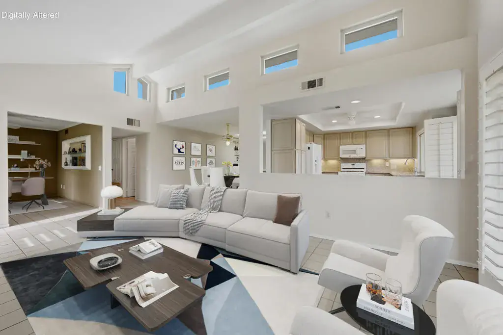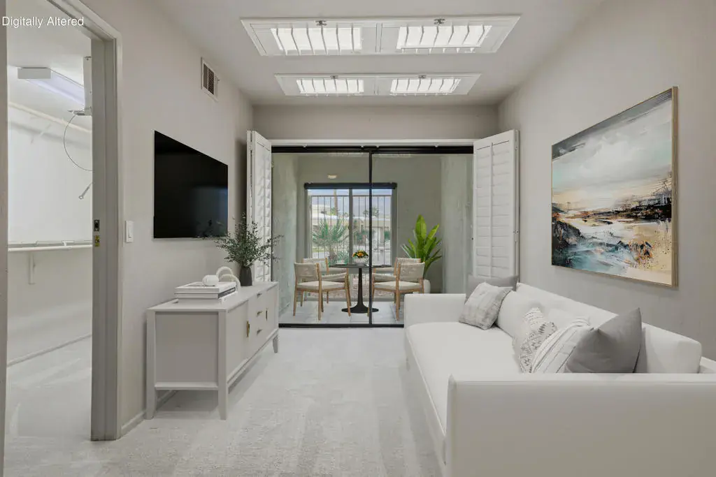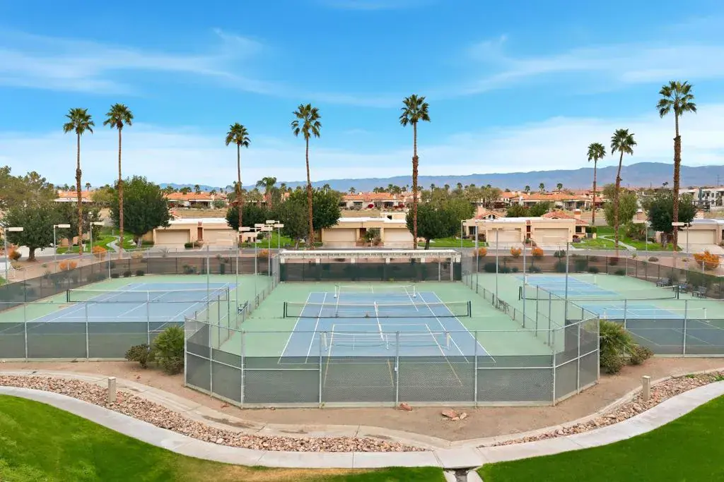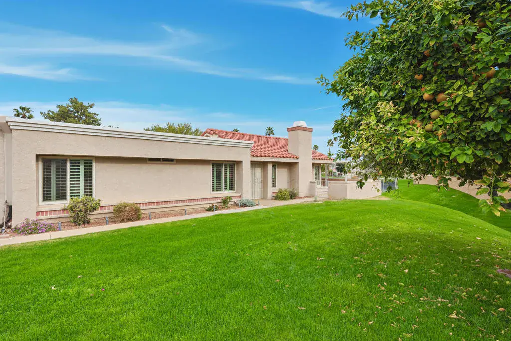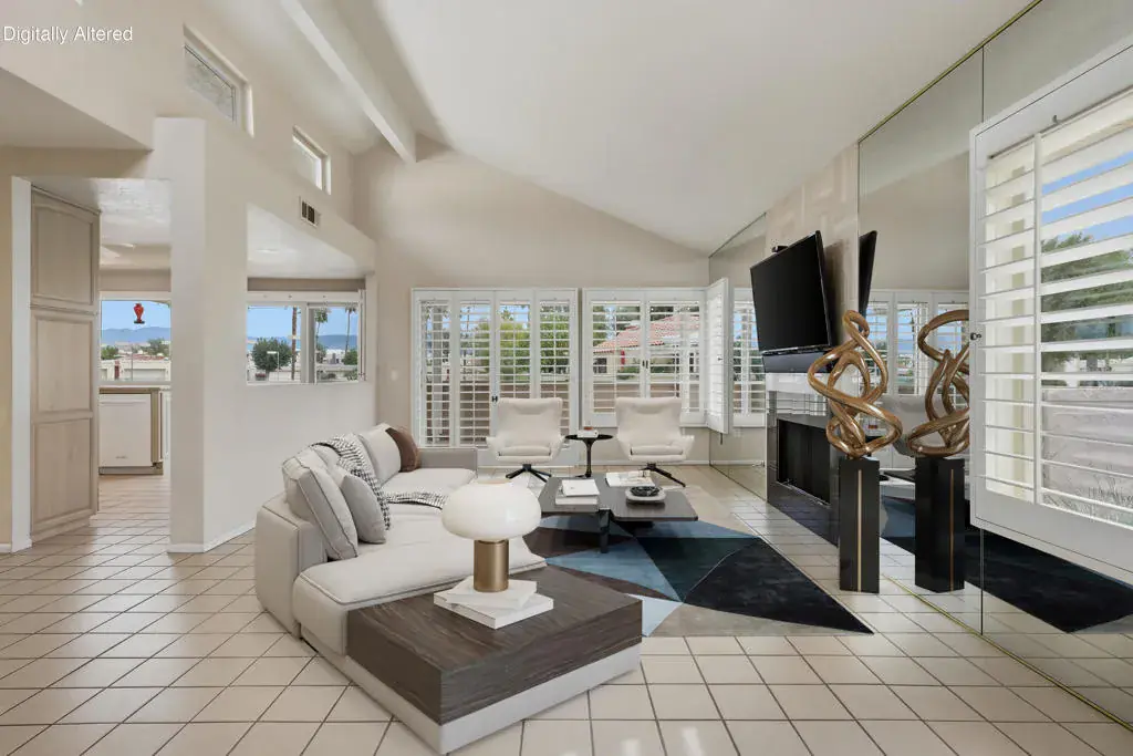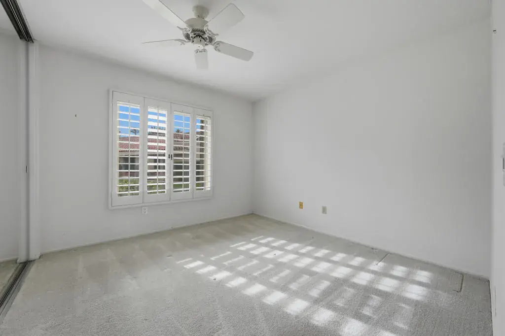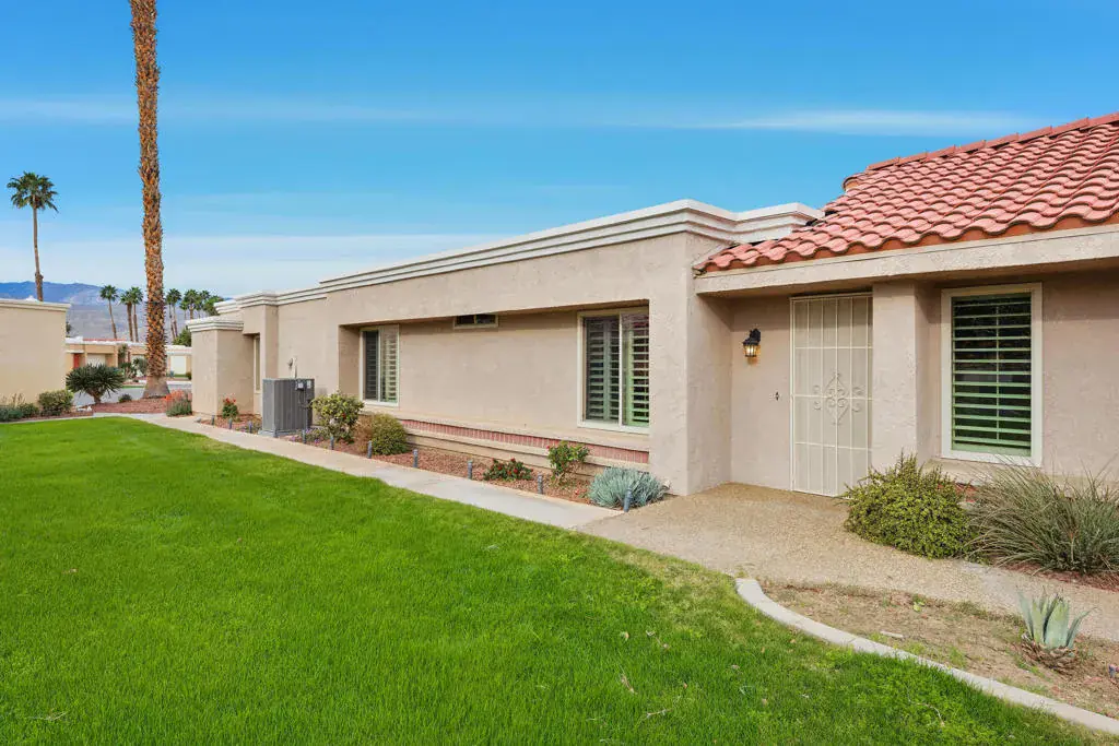 Located in the desirable Casablanca community which boasts 4 pools and spas; tennis and pickleball courts, right in the heart of the Coachella Valley and near Palm Desert’s entertainment district, this spacious two-bedroom condo with a den offers comfort, style, and beautiful desert surroundings. The open greatroom features a tile trimmed fireplace, vaulted ceilings, transom windows, and abundant natural light, with peaceful views of the mountains, greenbelt, and tennis courts. A wraparound aggregate concrete patio with a lattice cover creates the perfect space for relaxing or entertaining outdoors. All windows replaced in 2018. Inside, tile flooring runs throughout the home (bedrooms excluded), complemented by shutters for a clean, classic look. The dining area includes a convenient wet bar with fridge, while the kitchen is thoughtfully upgraded with raised-panel cabinetry, pull-out shelves, granite counters with bullnose edges, and a picture window overlooking the lush greenbelt and courts. A versatile den/office sits just off the great room. The expanded primary suite is a true retreat with a sitting area, enclosed patio, oversized walk-in closet, and a spa-like bath with dual sinks, upgraded fixtures, and a beautifully tiled walk-in shower. The guest bath features a tiled stall shower and granite vanity, and the guest bedroom includes mirrored wardrobe doors. The indoor laundry room offers built-in storage for everyday convenience. An oversized one-car plus golf cart garage with built-in storage completes the package. Major systems are already updated, including a newer water heater (2020) and Lennox A/C (2024). Move-in ready and ideally located — this is easy desert living at its best.