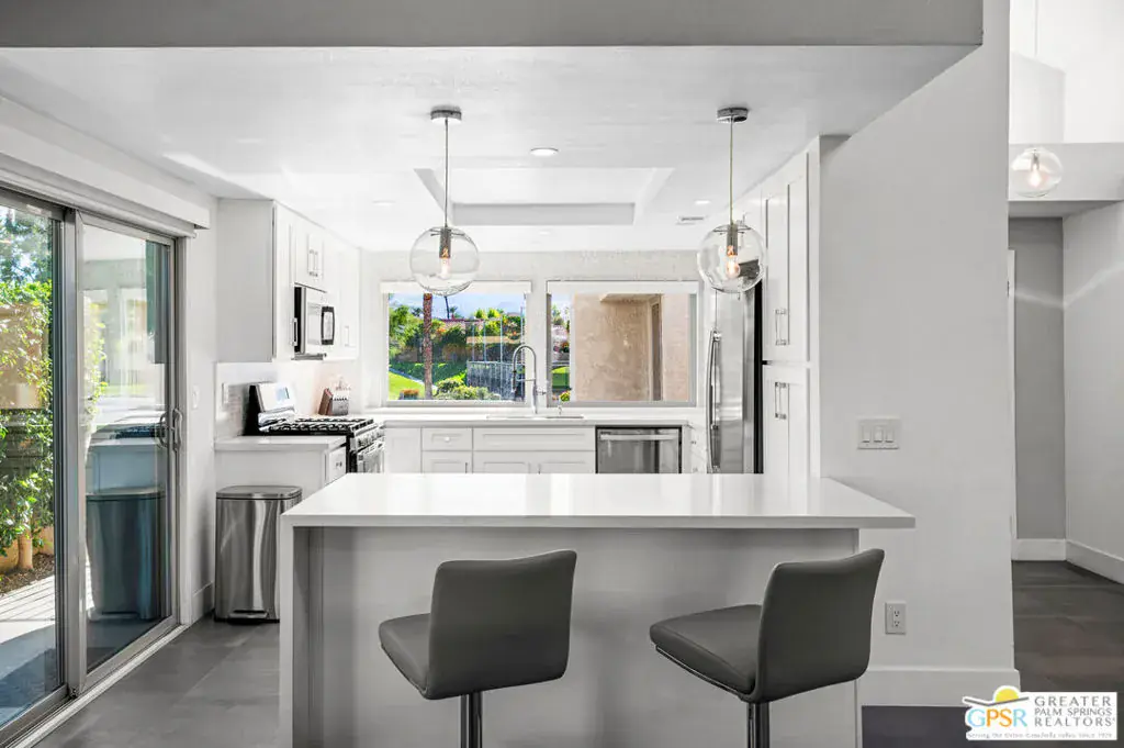 New listing: South-facing, completely updated condo in Casablanca, Palm Desert. Once inside, you are greeted by a light, bright contemporary space with excellent mountain views. The open floor plan maximizes flow, enabling seamless entertaining and enjoyment across all living spaces. The updated kitchen includes custom cabinetry, quartz slab countertops, and stainless steel appliances. The vaulted ceiling living room is highlighted by an oversized tiled fireplace and windows/doors opening onto a private wraparound patio. The primary suite features a soaking tub and a custom-tiled shower enclosure, all in a beautiful, sleek room reminiscent of a spa. Casablanca is ideally situated in Palm Desert, close to shopping, entertainment, and dining. The home is being sold FURNISHED per the seller’s inventory. Why aren’t you living here yet?