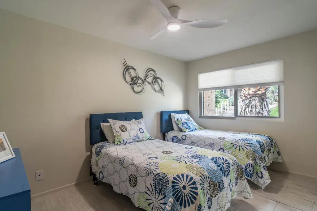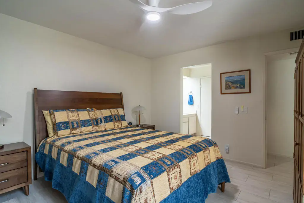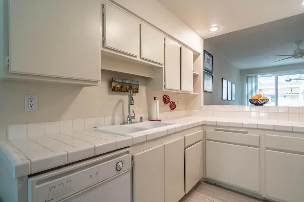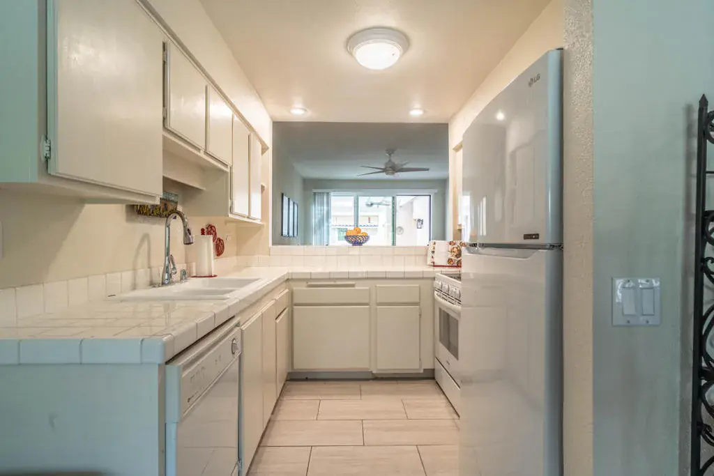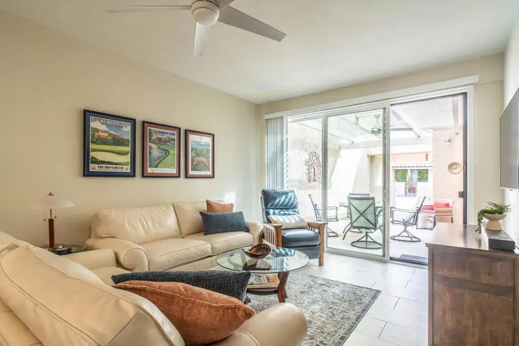 Discover your quiet desert getaway inside the gated community of Corsican Villas in the heart of South Palm Desert. This single-story, 2-bedroom, 2-bathroom condo features a light and airy floor plan accented by newer wood-look tile flooring in a versatile neutral palette. The kitchen offers a sunny dining nook plus a breakfast bar that opens seamlessly into the living area. Relax in comfort in the primary suite, which includes a double-sink vanity, walk-in shower, and walk-in closet. Corsican Villas HOA fee covers water, cable/internet, roof maintenance, exterior paint/stucco, and grounds upkeep plus premium amenities, including four pools and spas, tennis/pickleball courts and a small putting green. Perfectly located across from The Living Desert and just minutes from the world-class shopping and dining on El Paseo.
