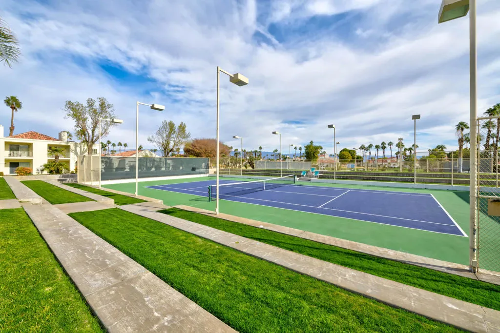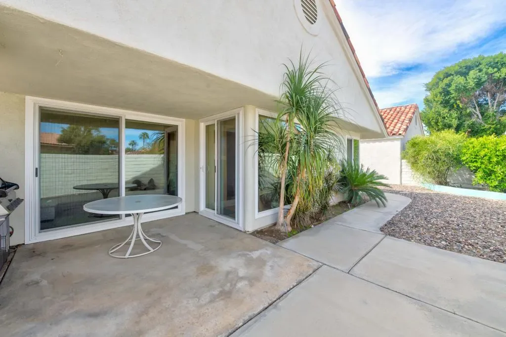 Reduced…..Located across from the world renown Indian Wells Tennis Gardens, this is resort living in the heart of the desert. This 3 bedroom/2 bath 1536 s.f. detached home with private yard is located in a quiet area of gated Desert Breezes. Kitchen has granite countertops and darkly finished wood cabinets. There is an area in the kitchen for casual dining. Additionally, there is a separate formal dining room as well. The primary suite is a private retreat with dual closets, double sinks and shower and commode area. This bedroom also hosts a small patio area for sipping on your morning coffee or enjoying the sun. There are 2 other bedrooms … one of which would make a nice office or den. There is a hallway bathroom with tub/shower enclosure. Washer and dryer are located in the garage.Newer a/c unit.Desert Breezes is a very desirable community with 6 pools and 5 spas, tennis/pickleball courts and a clubhouse with a gym. The monthly HOA dues of $435 covers trash, common areas. Every few years the homes are painted so that all are uniform in color in the community. Desert Breezes is close to all amenities– shopping, dining, schools and churches. Don’t miss out on visiting this TURNKEY FURNISHED HOME!