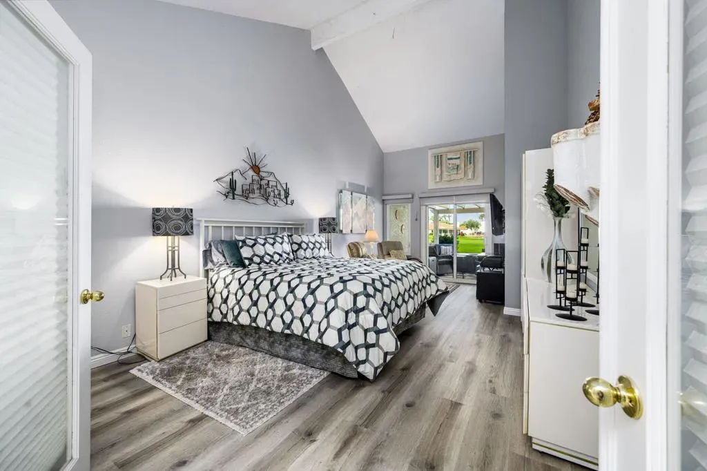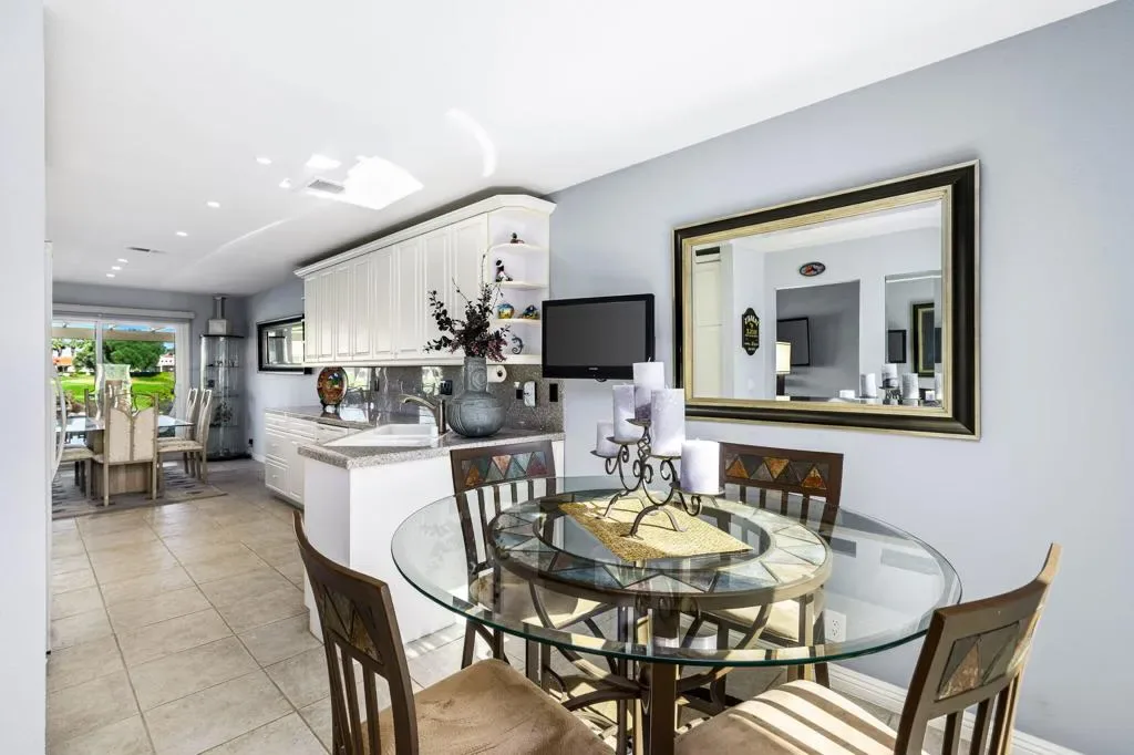 Rare opportunity on the golf course side of highly sought-after Avellino Circle in guard-gated Desert Falls Country Club. Thoroughly remodeled, this exceptional condo captures stunning views of shimmering water, multiple fairways, and dramatic mountain backdrops.Offering 2 bedrooms and 2 baths, the home has been thoughtfully updated for effortless desert living and entertaining. The remodeled kitchen features quartz countertops, updated cabinetry, and a beverage fridge, opening to the dining area and rear patio for easy indoor-outdoor flow.Both bathrooms have been beautifully remodeled with floor-to-ceiling tiled showers, quartz countertops, and updated cabinetry. The spacious primary bath features a large walk-in shower with distinctive glass block detailing. The entry to the expansive primary suite has been reconfigured to enhance privacy, while the enclosed atrium fills the home with natural light and creates a charming portico leading to the primary bedroom.Outdoors, the extended back patio offers three distinct seating areas, ideal for intimate gatherings or larger-scale entertaining against a spectacular view backdrop. A portion of the garage has been finished as a man cave/lounge area with a wall-mounted TV, adding flexible bonus space.A rare view property in one of Palm Desert’s most desirable communities, just minutes from El Paseo, fine dining, premier shopping, and Acrisure Arena, home of the Coachella Valley Firebirds and a major venue for concerts and events. Desert Falls Country Club is privately owned and offers both pay-as-you-play and membership options.