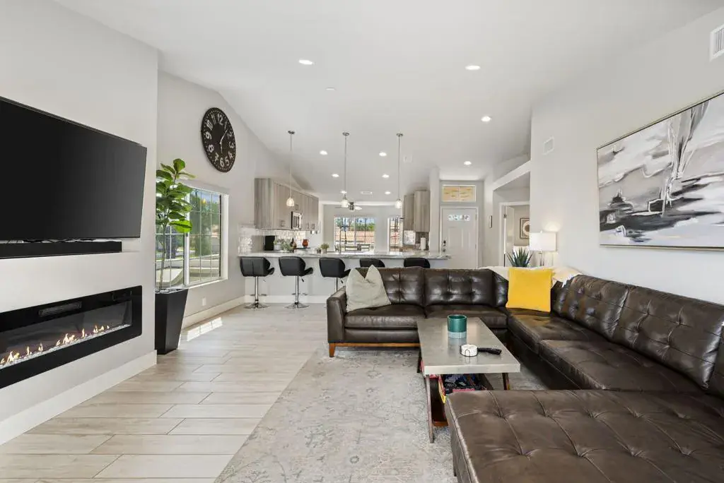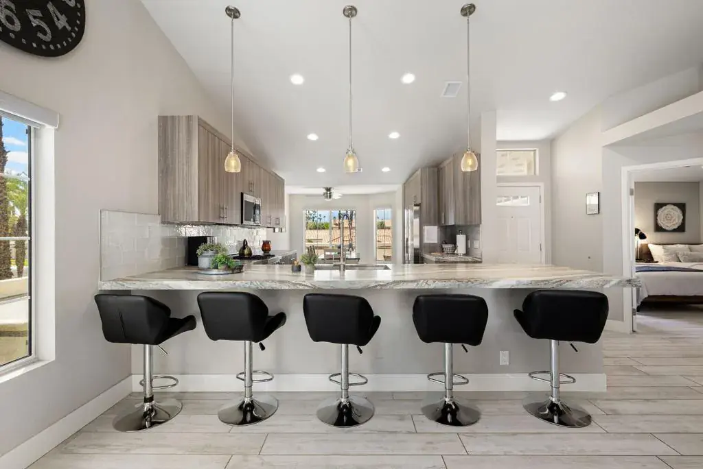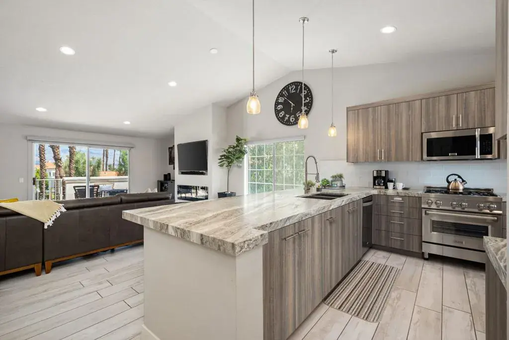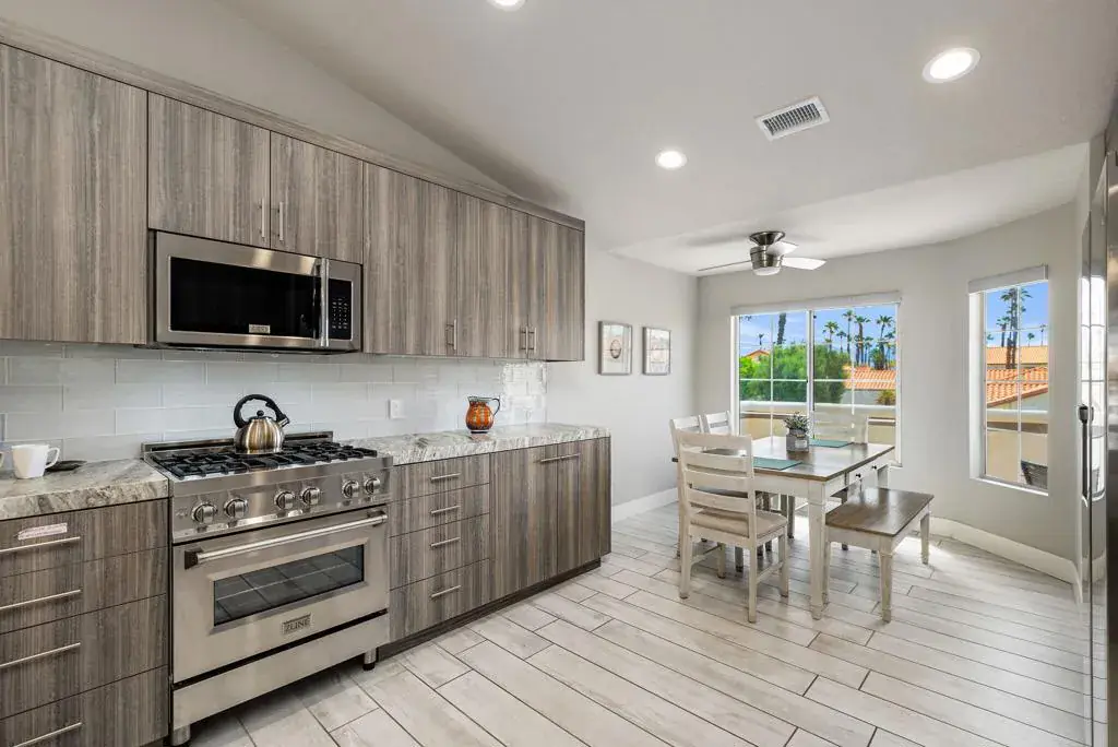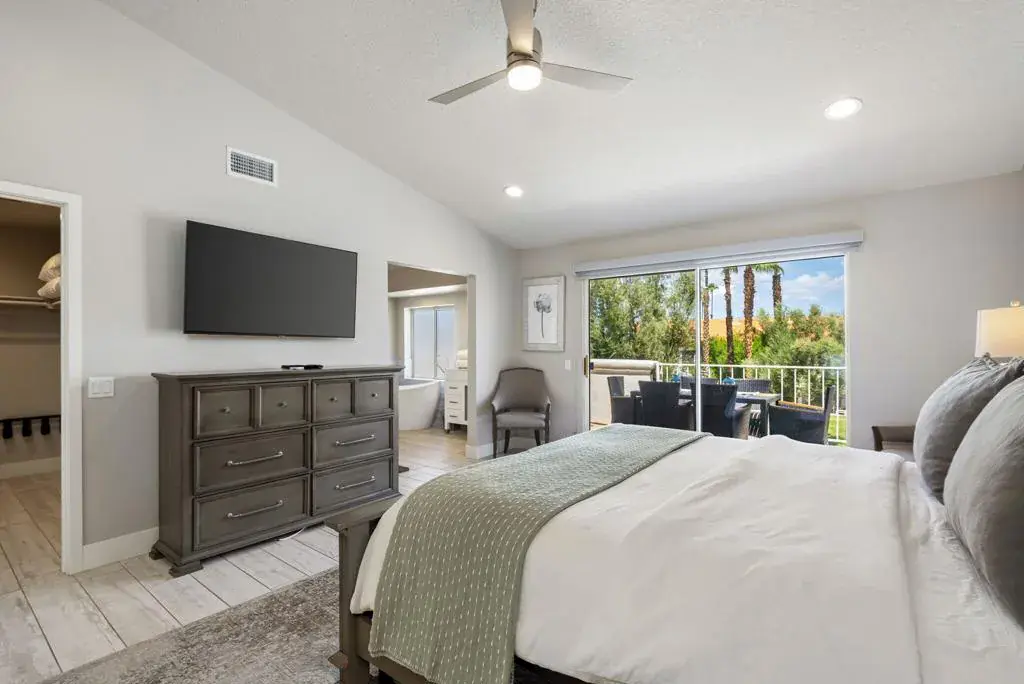 This absolutely beautifully renovated and meticulously maintained, 1814 sq foot, 3bd/2.5 baths, has been totally remodeled! Bright and airy, boasting high cathedral ceilings and open floor plan ideal for entertaining, with a chefs dream designer kitchen, hanging glass light fixtures, designer grade counter tops, custom soft close cabinetry, upgraded stainless appliances, Zline gas range and oven, and extended countertop for prepping, a coffee station, and a sun filled Kitchen Nook with bay windows offering fabulous views. The large, comfy, and tastefully furnished, Living/Dining area with extended Dining Counter Bar is complete with a new electric Fireplace, mounted Flat Screen TV and a recessed Cocktail Bar leading out the slider doors to your Indoor/Outdoor Living Patio with Spectacular Views of the Mountains, Trees and Jr. Olympic Pool! Step into the light bright Primary Suite to enjoy even more commanding views of the mountains with a glass doors opening directly out to the extended back patio, with views of the tapestry textured Chocolate Mountains. The Primary Bath is fit for Royalty with free standing porcelain tub and tiled shower. The bright, and sunny, Ensuite Guest Bed and Bath are beautifully appointed and situated down the hall on other side of the home allowing the 2 Primary Bedrooms space and privacy. The entire home is tiled in luxurious white distressed colonial wood plank porcelain tile flooring consistent with the relaxing palette and overall vibe of this warm clean, calm & relaxing home. Truly the very best of Resort Living with Building and Grounds Maintenance, Tennis, Pickleball, Full Fitness Center, 29+ Pools & Spas, Cable, Wi-Fi, 24hr Gate Guarded, Roving Security and more, all included in your HOA Dues! Golf on Desert Falls Country Clubs 18-hole Scottish Championship Links Course is on a pay as you play basis or choose to opt in on a membership. Desert Falls Country Club has it all! Within walking distance to restaurants & shopping, and just a few miles drive to Acrisure Arena, McCallum Theatre and El Paseo with upscale shopping, Designer Boutiques, Galleries and Fine Dining. Uniquely renovated, with its multitude of upgrades, this home is turnkey furnished and move in ready for Season! Excellent Rental History! Short Term leasing currently allowed. MUST SEE to Truly appreciate quality and workmanship! Call today for your private tour!