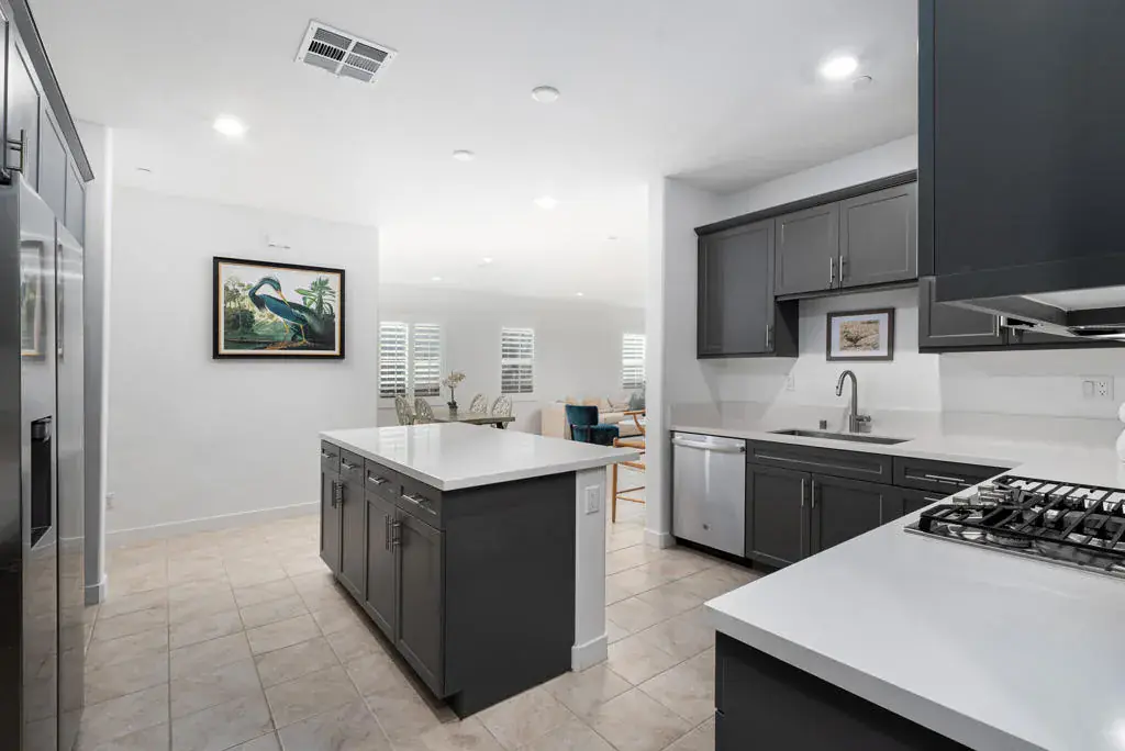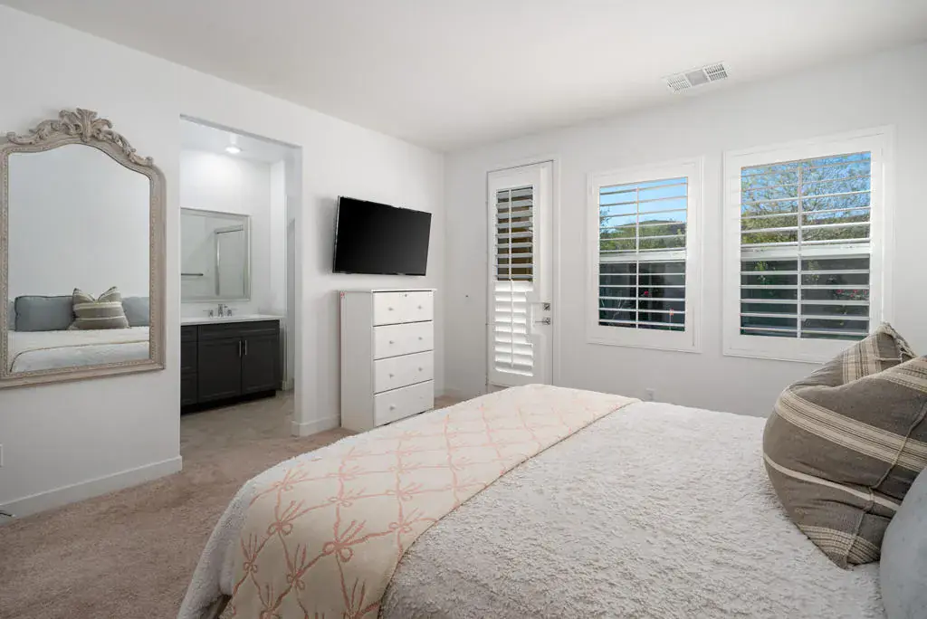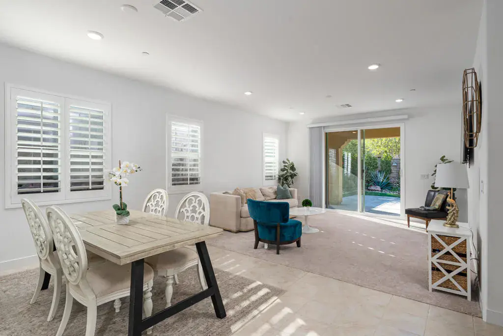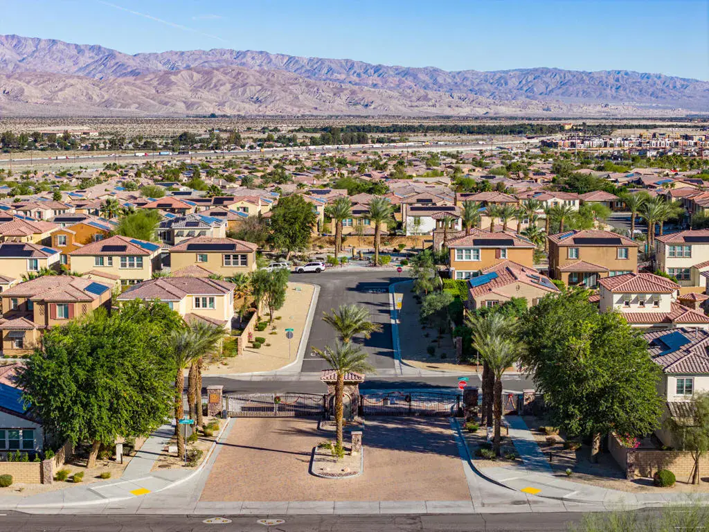 New Price! See this recently constructed home at a great new price in the convenient, gated Dolce community with Owned Solar system and Putting Green in the spacious back yard! You are invited to this beautifully crafted 3 bed, 2 bath 2023 single-family residence offering all the modern comforts and amenities of the desert lifestyle. You are first greeted by charming stone and Tuscan details and your eyes are immediately drawn through the open, light-filled main living area to the inviting backyard beyond. The generous living space is combine with a dining area that comfortably accommodates eight guests for all manner of gatherings.The kitchen will inspired the chef among you, with its quality GE appliances, convenient island prep area, ample countertops, and abundant storage, all finished in a sophisticated white and gray palette. A dedicated laundry room sits conveniently adjacent to the kitchen and a sizable 2 car garage.Enjoying beautiful natural light, the spacious primary bedroom suite offers direct access to the west-facing backyard, with an ensuite bathroom with double sinks. Two lovely additional guest bedrooms enjoy a full bathroom, providing privacy for the primary suite and visitors. Outside, the finished and fully landscaped backyard awaits, with a partially covered patio and a delightful five-hole mini golf area and artificial turf. With such a generously sized back yard, a pool and spa could easily be added in the future.Dolce community amenities include a gorgeous fenced pool and spa with restrooms, complemented by a distinctive tower, fountain, and breathtaking mountain views. The location provides excellent proximity to dining and shopping while maintaining a secure, family-friendly atmosphere.