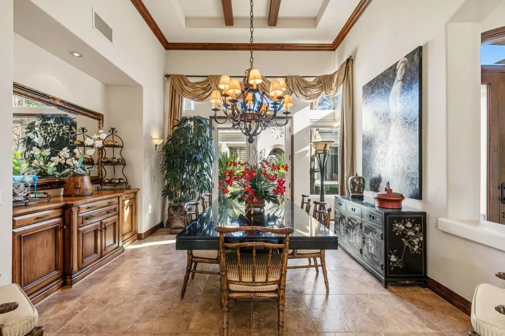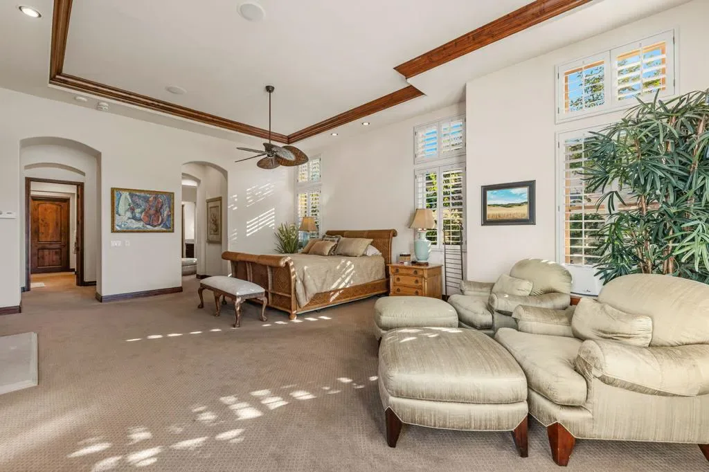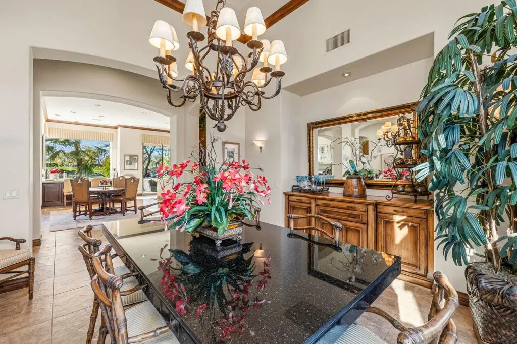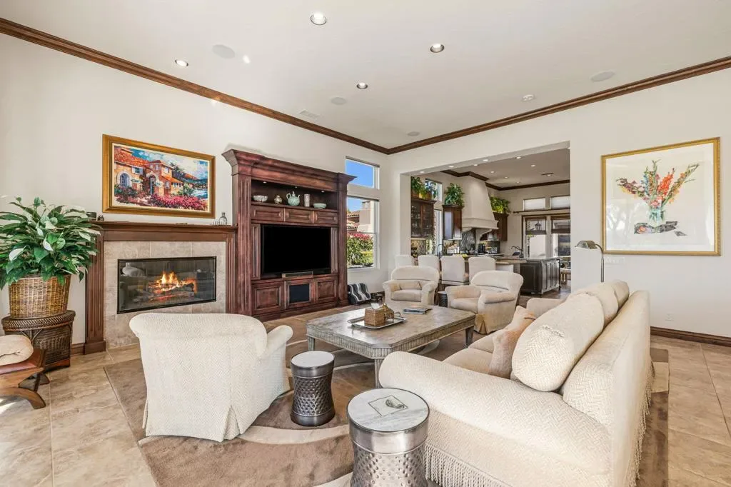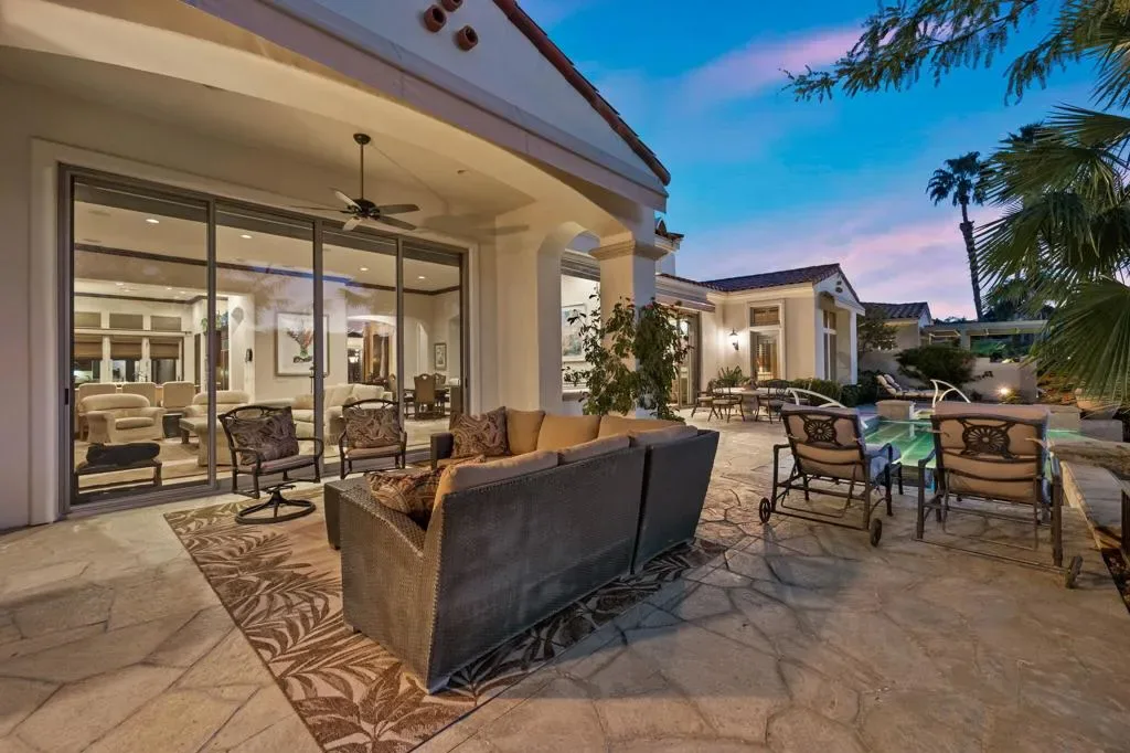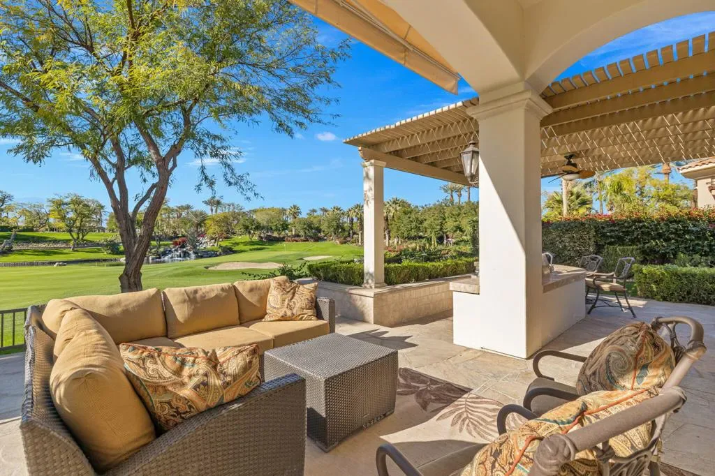 A truly rare opportunity to own the iconic Toscana Cortona 923 Prototype in prestigious Indian Ridge Country Club! This one-of-a-kind estate showcases timeless elegance, exceptional craftsmanship, and breathtaking desert vistas, all set on an oversize premium lot with views of the iconic waterfalls overlooking the 18th fairway of the Arroyo Course. Valley wide renowned builder, Bill Bone and Sunrise Corporation, saved the best lot for last to build this spectacular masterpiece within close walking distance to clubhouse, fitness, tennis & pickleball, spa and restaurants. Designed for both grand entertaining and everyday luxury, the residence features a spacious open floor plan with 4 bedrooms, 4.5 baths, including a two-room detached casita, ideal for hosting guests in comfort and privacy. Formal living and dining rooms flow seamlessly into a generous family room with wet bar and fireplace, opening to the gourmet kitchen appointed with granite countertops, a Wolf range, Sub-Zero refrigerator, large center island, walk-in pantry, and charming breakfast nook. The magnificent primary suite offers views of the golf course and mountains, dual independent bathrooms and walk-in closets, a gas fireplace, sitting area, spa-inspired soaking tub, and oversized double shower offering a true private retreat. Custom, high-quality finishes are found throughout, including built-in cabinetry, tile flooring, crown molding, shutters, remote-controlled blinds, and thoughtfully designed outdoor spaces. The resort-style backyard is the showpiece featuring a pebble-tech infinity pool and spa, paver patios, fountain, and built-in BBQ island–perfectly positioned to capture sweeping golf course, lake, waterfall, and majestic San Jacinto Mountain views. Offered decorated and designer furnished per inventory, this exceptional Toscana estate with 4-car garage delivers privacy, prestige, and unparalleled beauty–a dream home that must be experienced to be fully appreciated. The Golf Membership available with no waitlist is the cherry on top.