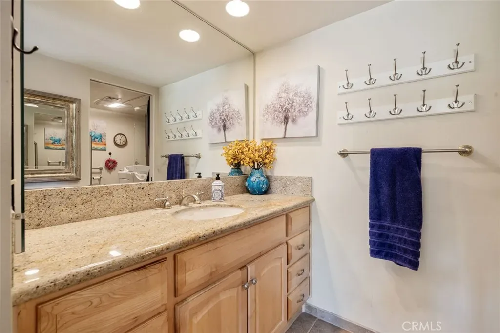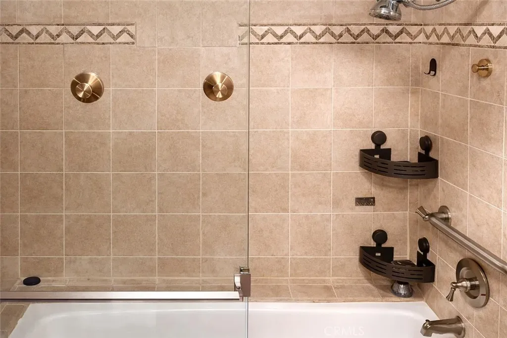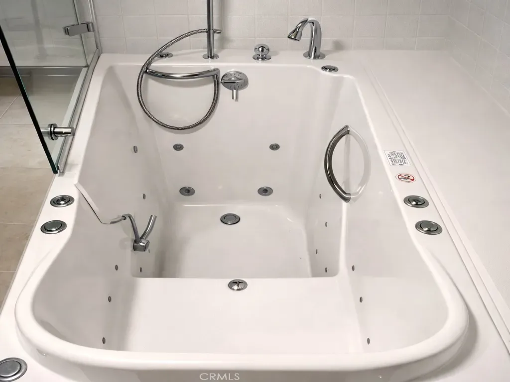 The primary bedroom features a sliding glass door that opens directly to the patio with pool views, creating a peaceful indoor-outdoor flow. The primary bathroom includes a walk-in jetted tub with shower head for added comfort and accessibility. The second bedroom offers its own private patio, providing a quiet space for guests or a home office.