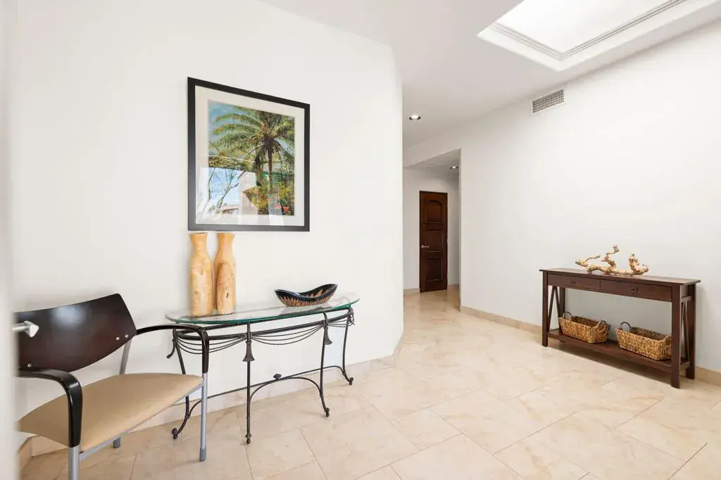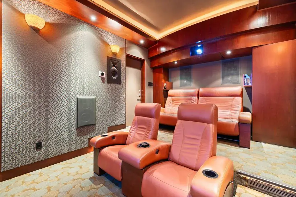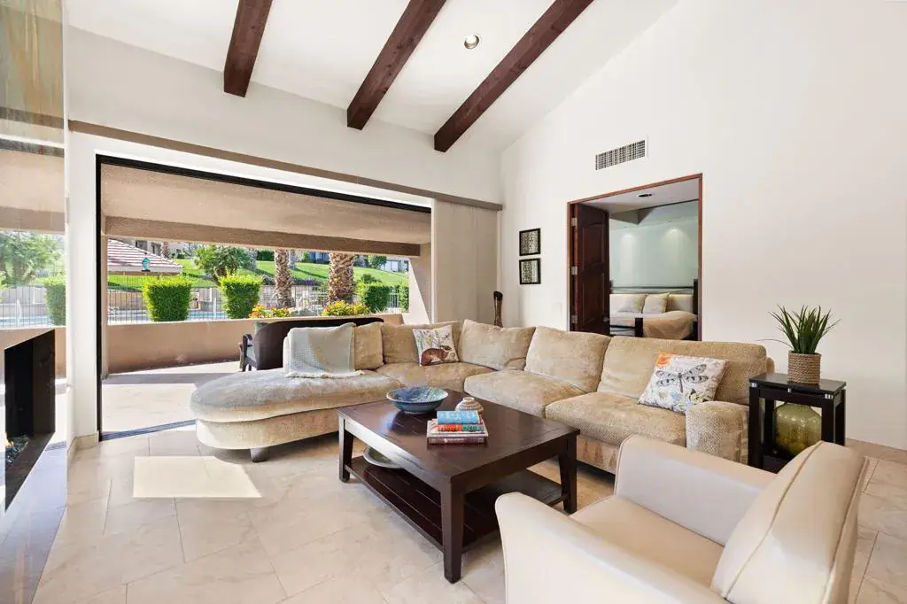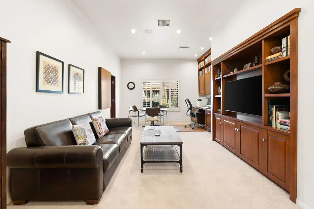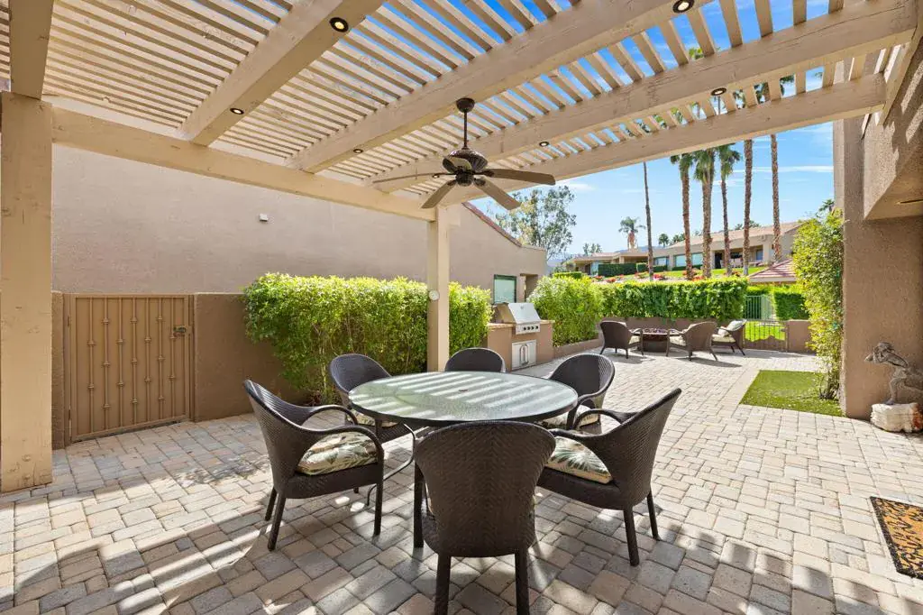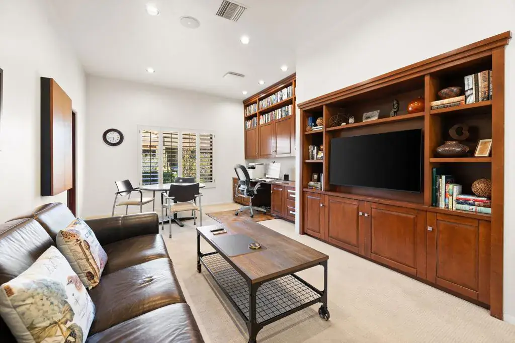 Major remodel. Expanded with top quality materials and workmanship. No expense spared. A freestanding Skyview home unlike any other. With so many unique features, it is hard to know where to begin. The view across the golf course toward the mountains to the South are captivating. To enhance the view, the glass sliders across the rear of the great room disappear completely into the wall. The home offers additional privacy due to the generous greenbelt on the right side. The nearby community pool is conveniently nearby. The Paradise Theater brand cinema room is an enclosed room with leather seats, sound proofing, engineered for an amazing experience equal the best commercial theaters for unmatched acoustics and visual images on a large 120 inch screen. It will transform your enjoyment of watching movies, sports and news. Like being the the theater, but your own private theater! The expanded kitchen and eating area offers a superior dining experience. The kitchen is thoughtfully designed with a 6 burner gas cooktop and oven, a stainless hood, granite countertops and stainless steel sink. And a SubZero refrigerator, of course. All integrated into an open floor plan. Additional square footage was added to gain access to the garage directly from inside the home, to expand the informal eating area, to add the theater room and to expand the primary bath and primary bedroom, now 25 ft. long. It now feels and is luxuriously large. Custom shower and cabinetry. The 3rd bedroom has it’s own bathroom. It is currently used as an office. You will sense that no expense was spare. Striking fireplace wall is a piece of art all by itself. The massive paver stone and tile patio wraps around and has the unique feature of being one of the very few that is enclosed. A pet-friendly yard is a very rare find. The built-in BBQ is well situated. Association VII consists of 86 homes, all freestanding and the dues include EARTHQUAKE INSURANCE.
