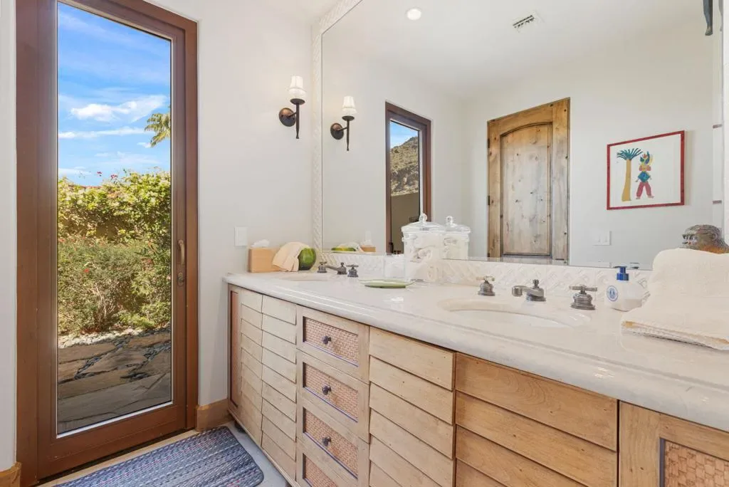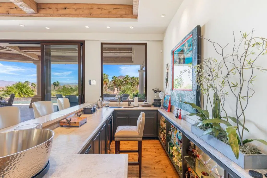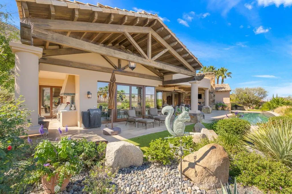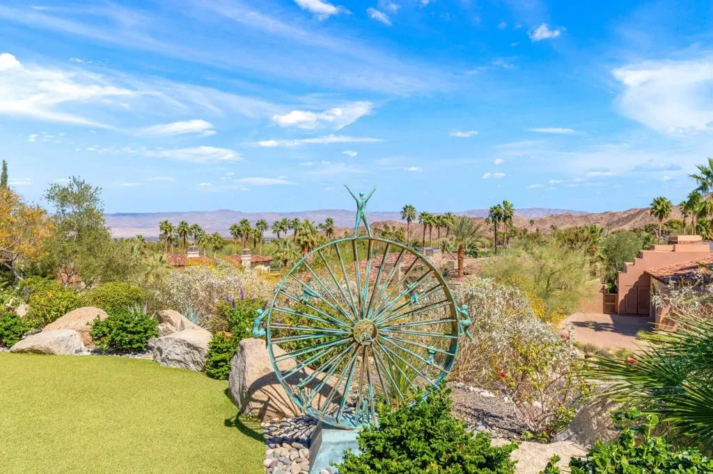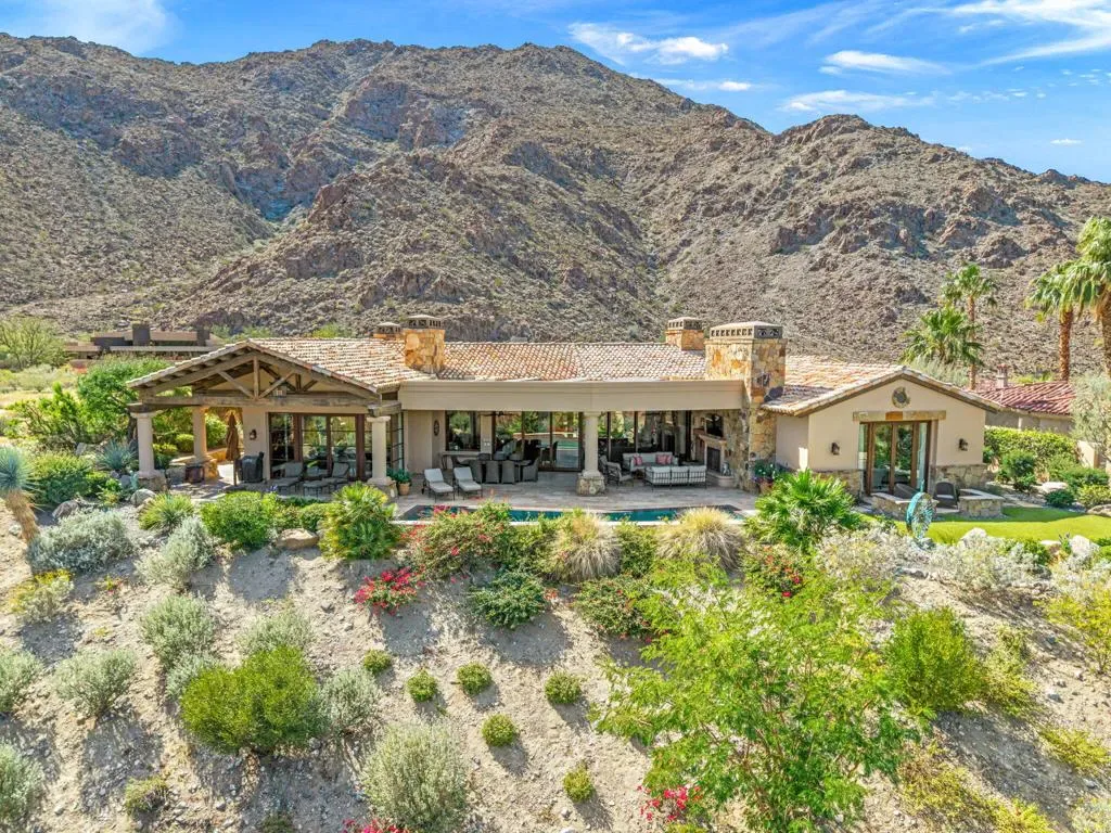 An masterful blend of contemporary touches and a timeless architectural design. This 2006 custom built home is situated up high for unmatched views of the mountains and valley. Impeccable layout for privacy and luxury living. Nestled on a cul-de-sac lot is this 3 bedroom plus an office, 5 baths with 5,066 sq. ft. of living space. The wood plank floors seamless transition to porcelain tile flooring. The 1 bedroom, 1 bath casita offers privacy and all the amenities one would ever want. The open floor plan is here for gracious entertaining. The bar area offers sitting for 6, a SubZero refrigerator and an ice maker. Tall wood framed glass sliders in the great room disappear into the wall allowing full advantage of the magnificent view. The four fireplaces are a clear signal of quality throughout. Sellers have made major upgrades and changes that take 3 pages to list. Here you will find technology at its best. There is a Control 4 Smart System, for HVAC, lights, newer surround sound speakers, pool, cell signal booster and more. The Ring security system has cameras and motion sensors. 4 newer A/C condenser units, and 30 owned solar panels with 3 Tesla backup batteries and car charger. The approx. 1,000 sq. ft. patio and salt water pool are ideally situated with vistas toward the view. The eye- catching Quartzite kitchen center island countertop, another recent addition, is remarkable. There is a large walk- in butler’s pantry with 2 SubZero freezer drawers. The separate golf cart garage door has it’s own entrance. All these benefits and the home is offered furnished per inventory list. There is so much to like about this impeccable home.