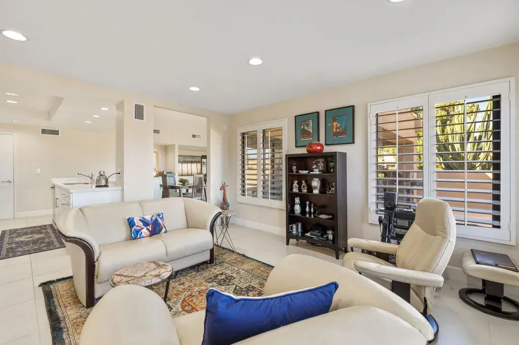 Great corner location with mountain views and private gated patio. Popular 2 bedroom 2 bath floorplan with fireplace and added office plus family room/den. Attached double car garage has epoxy flooring, built-in cabinets, laundry + newer HVAC & water heater. Great living spaces with beautiful kitchen, stainless appliances & quartz counters. Kitchen is open to Living room & Family Room. Primary bath has walk-in tiled shower Guest suite has attached bath and added office with skylights. All sliding doors and windows are updated. Enjoy sunrise and moonrise over Mt Eisenhower from the spacious patio. Great views and privacy. Patio is tiled and walled for privacy. Walkway & driveway are interlocking paver stones. Impressive desert landscaping is beautifully maintained. Some items of furnishings are included. Located in the heart of the Club just a short walk to clubhouse & tennis/fitness facilities. Ironwood is a private Member-owned golf community. Access to facilities (golf, tennis, fitness, dining is by membership only).