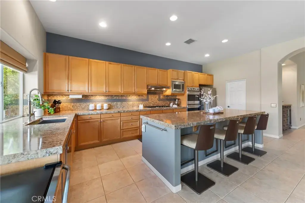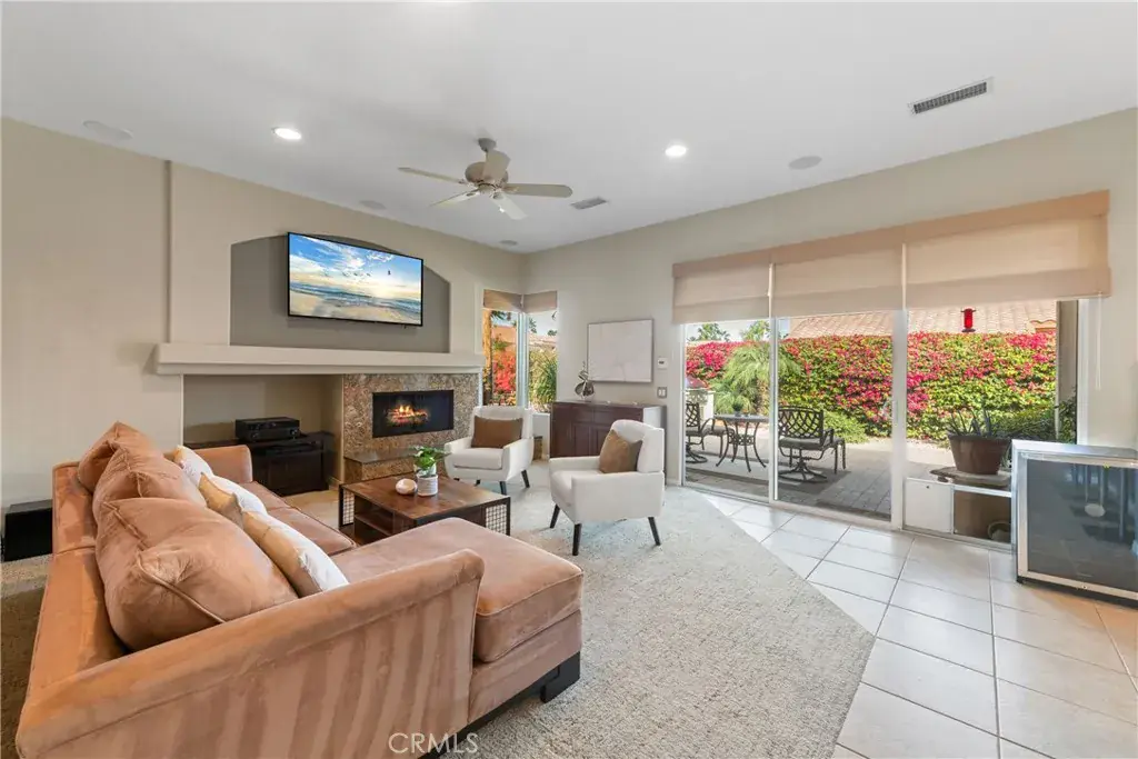 expansive and very private backyard offers a resort-style pool and spa with waterfall, sun patios, mature palm trees, a covered patio with pavers, and a built-in grill all surrounded by impeccably kept lush landscaping with custom outdoor lighting. The interior of this home boasts turnkey condition with soaring ceilings, gleaming wood and tile floors, custom paint and window coverings. The perfect entertaining “great room” has been upgraded with stainless steel appliances, custom backsplash, gorgeous granite countertops, double ovens, and a large center island with bar seating overlooking the spacious family room with cozy fireplace and a view of lush back yard. Your private desert oasis awaits!