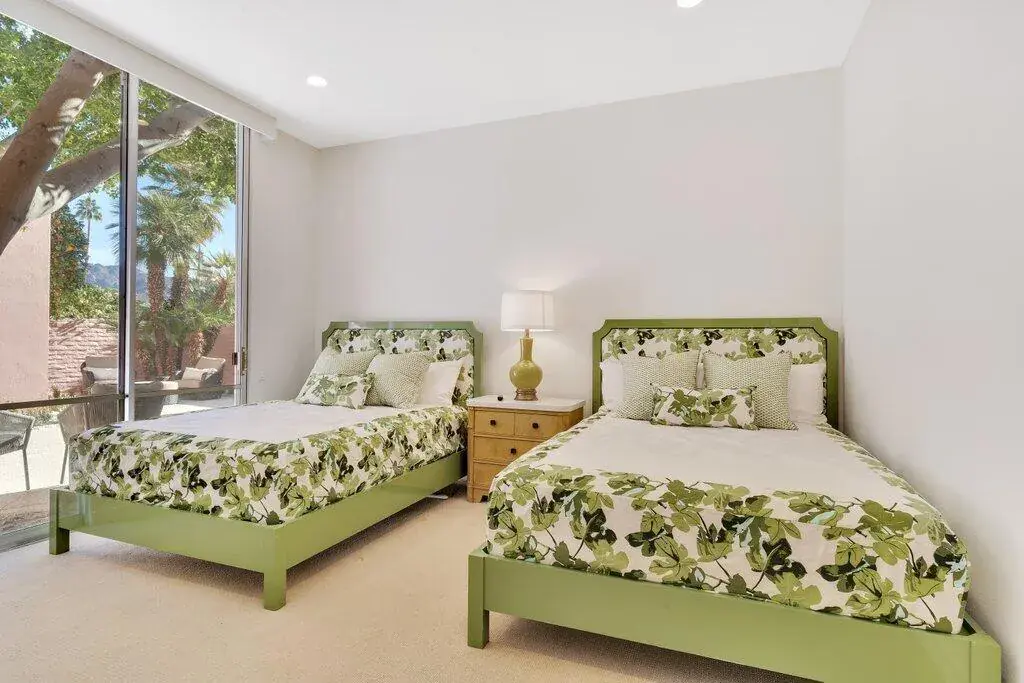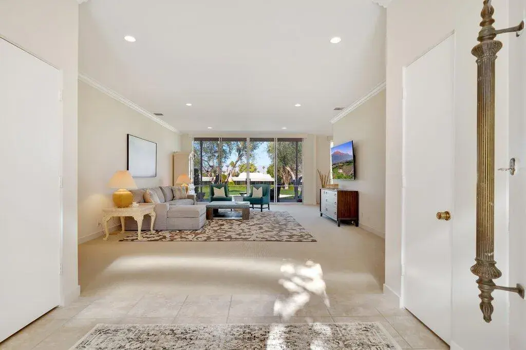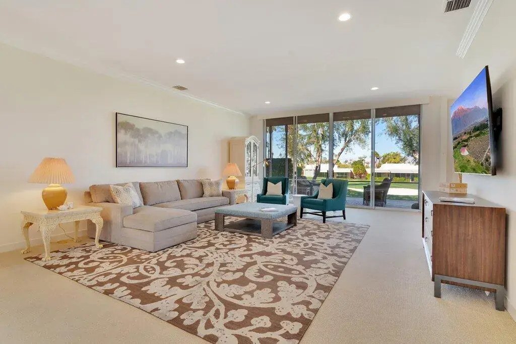 This stylishly furnished villa is spacious, light-filled, and cheerful, with gorgeous fairway and mountain views. Located within the iconic gated community of Marrakesh Country Club, known for John Elgin Woolf’s Hollywood Regency design. Spacious living, dining and kitchen areas, along with 2 bedrooms, a den, and 3 baths. The primary ensuite sits along the golf course with a mature hedge shielding the terrace for privacy. The second ensuite opens to the enclosed courtyard. The den is located off a private hallway with a bath. From the elegant living and dining areas, the terrace, framed by olive trees, overlooks the 12th green and northerly mountain views, making it ideal for outdoor enjoyment. Rental includes use of golf cart, two Como electric bikes, and weekly cleaning of patio. Club amenities include an 18-hole executive course, 14 pools and spas, tennis, fitness, bridge and clubhouse with fine dining. 30 – 90 day minimum stay depending on time of year. Social and Golf membership opportunities are available to tenants for use of the facilities and may be added at additional cost. Close to the fine dining & shopping on El Paseo Drive.