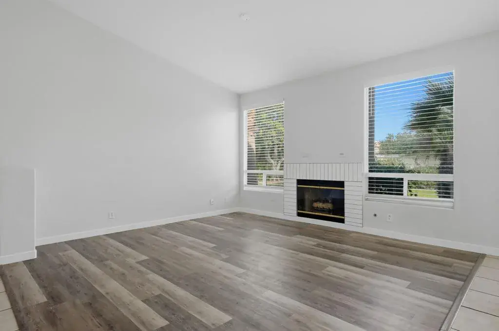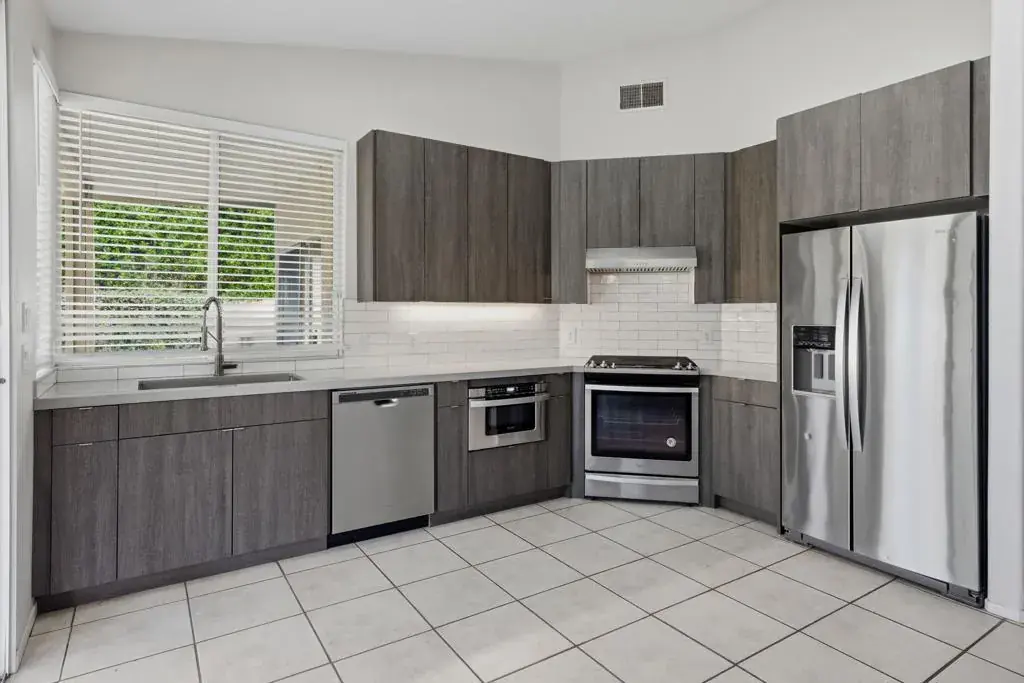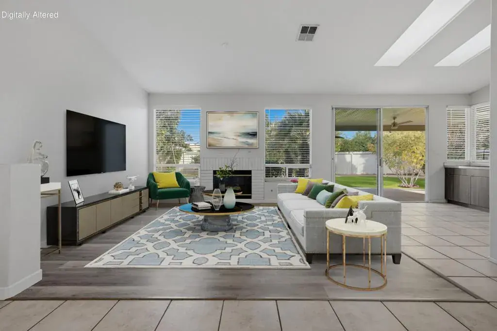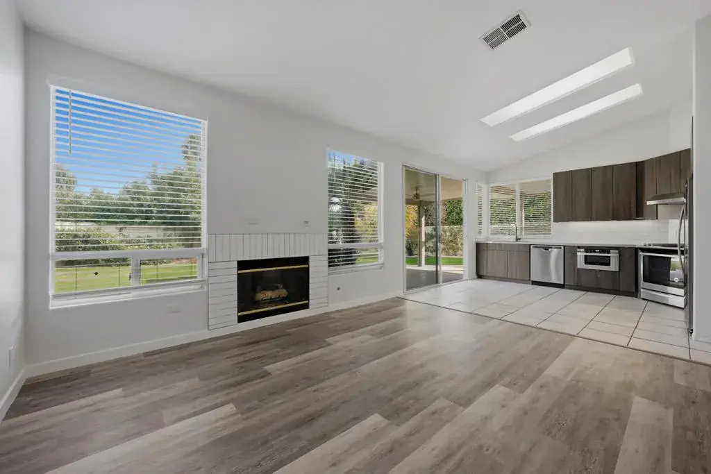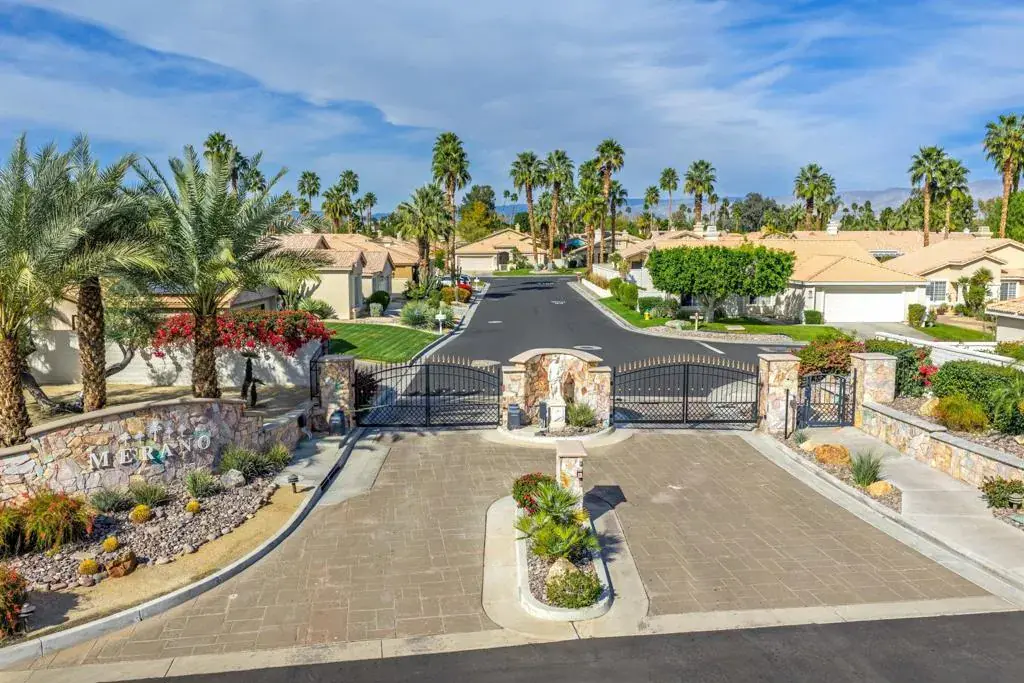 Discover desert living in the coveted, gated Merano community of Palm Desert. This partially upgraded three-bedroom, two-bathroom residence offers a blend of contemporary style and thoughtful functionality in its inviting interconnected design.From the beautifully landscaped front yard, step inside to a bright, flowing living space featuring brand-new vinyl plank flooring in the living room and primary suite, plus a modern fireplace surround that complements the remodeled, modern kitchen. The light and bright kitchen was completely remodeled and features stainless steel appliances including refrigerator and a gas range, modern cabinetry, white ceramic backsplash and white countertops, and opens directly to the private, fully fenced backyard–complete with mature fruit trees and a new aluminum patio cover–creating an ideal setting for indoor-outdoor entertaining. A new dry bar area with beverage refrigerator and matching extra storage cabinetry was added in the hallway. The highly desirable three-bedroom model provides comfortable retreats, including a primary suite with a spacious walk-in closet, upgraded ensuite bath with new cabinetry and an oversized shower updated with premium finishes, and a glass slider leading to the landscaped backyard. The secondary bath, conveniently accessible for guests, also features updated cabinetry.Additional highlights include a direct-access two-car garage and remarkably low HOA fees in this gated enclave.Perfectly positioned in the heart of Palm Desert, you’re just moments from Bristol Farms, Eisenhower Health, Starbucks, exceptional dining, world-class golf, and more. This is charming, convenient neighborhood living–schedule your private showing today!