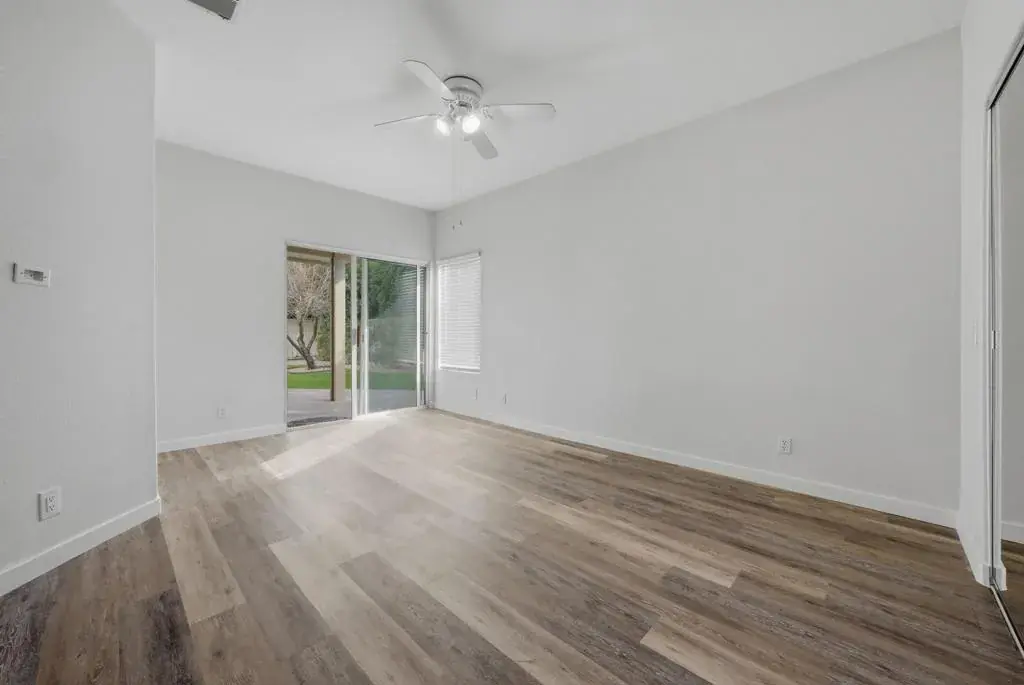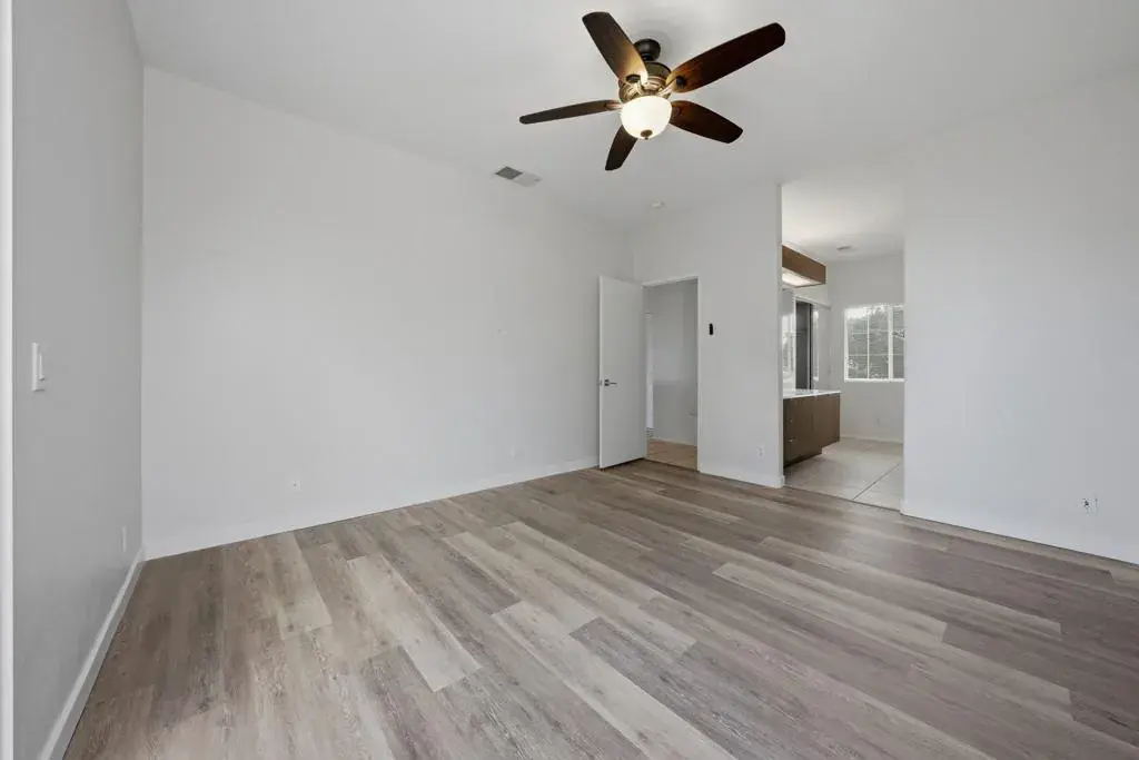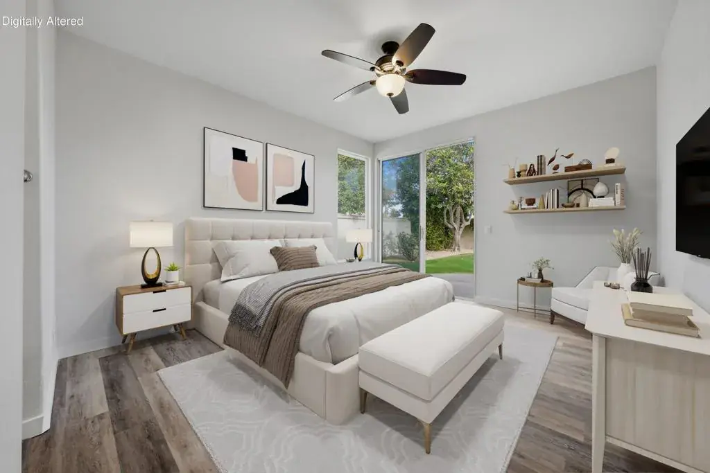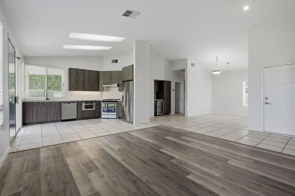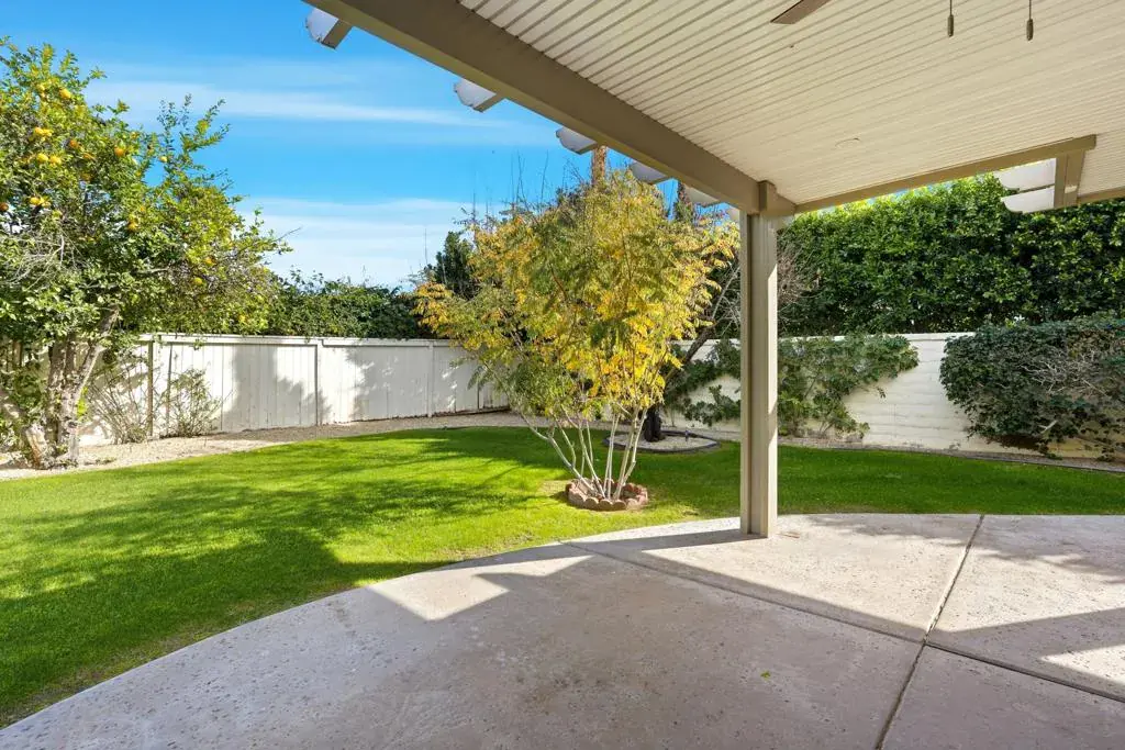 Discover desert living in the coveted, gated Merano community of Palm Desert. This partially upgraded three-bedroom, two-bathroom residence offers a blend of contemporary style and thoughtful functionality in its inviting interconnected design.From the beautifully landscaped front yard, step inside to a bright, flowing living space featuring brand-new vinyl plank flooring in the living room and primary suite, plus a modern fireplace surround that complements the remodeled, modern kitchen. The light and bright kitchen was completely remodeled and features stainless steel appliances including refrigerator and a gas range, modern cabinetry, white ceramic backsplash and white countertops, and opens directly to the private, fully fenced backyard–complete with mature fruit trees and a new aluminum patio cover–creating an ideal setting for indoor-outdoor entertaining. A new dry bar area with beverage refrigerator and matching extra storage cabinetry was added in the hallway. The highly desirable three-bedroom model provides comfortable retreats, including a primary suite with a spacious walk-in closet, upgraded ensuite bath with new cabinetry and an oversized shower updated with premium finishes, and a glass slider leading to the landscaped backyard. The secondary bath, conveniently accessible for guests, also features updated cabinetry.Additional highlights include a direct-access two-car garage and remarkably low HOA fees in this gated enclave.Perfectly positioned in the heart of Palm Desert, you’re just moments from Bristol Farms, Eisenhower Health, Starbucks, exceptional dining, world-class golf, and more. This is charming, convenient neighborhood living–schedule your private showing today!