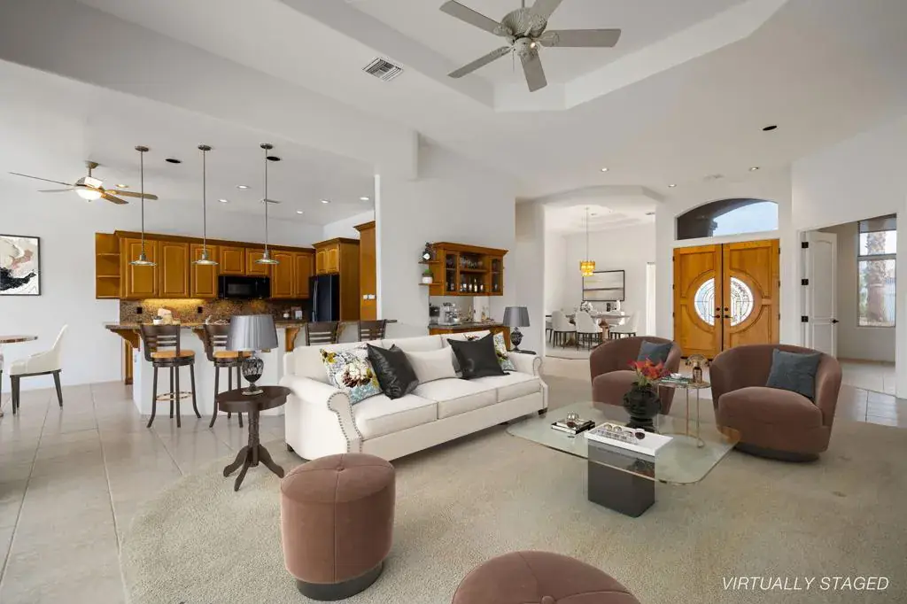 Welcome to this beautifully appointed 2,823 sq ft single‑family home, set within the exclusive guard‑gated community Montecito Homes offering privacy, security, and a refined desert lifestyle. The moment you step inside, a spacious foyer opens to the elegant formal living room, where an oversized sliding door draws your eye to sweeping mountain views and provides effortless access to the private yard and pool area perfect for relaxing or entertaining. At the heart of the home is a large, inviting kitchen that seamlessly connects to the dining room, creating a natural flow into the living room. This open layout enhances both everyday living and hosting, offering a warm, connected atmosphere throughout. Two guest bedrooms share a well‑designed Jack‑and‑Jill bathroom, providing comfort and convenience for family or visitors. A separate family room, office or optional 4th bedroom adds valuable flexibility. The oversized primary suite serves as a private retreat, featuring a spacious bedroom, a generous primary bathroom, and a large walk‑in closet. The three‑car garage offers ample storage and parking. Additional features include a leased solar system for energy efficiency and a backup generator for added peace of mind. Blending thoughtful design, stunning views, and resort‑style amenities, this home offers an exceptional opportunity in one of the area’s most desirable gated communities.