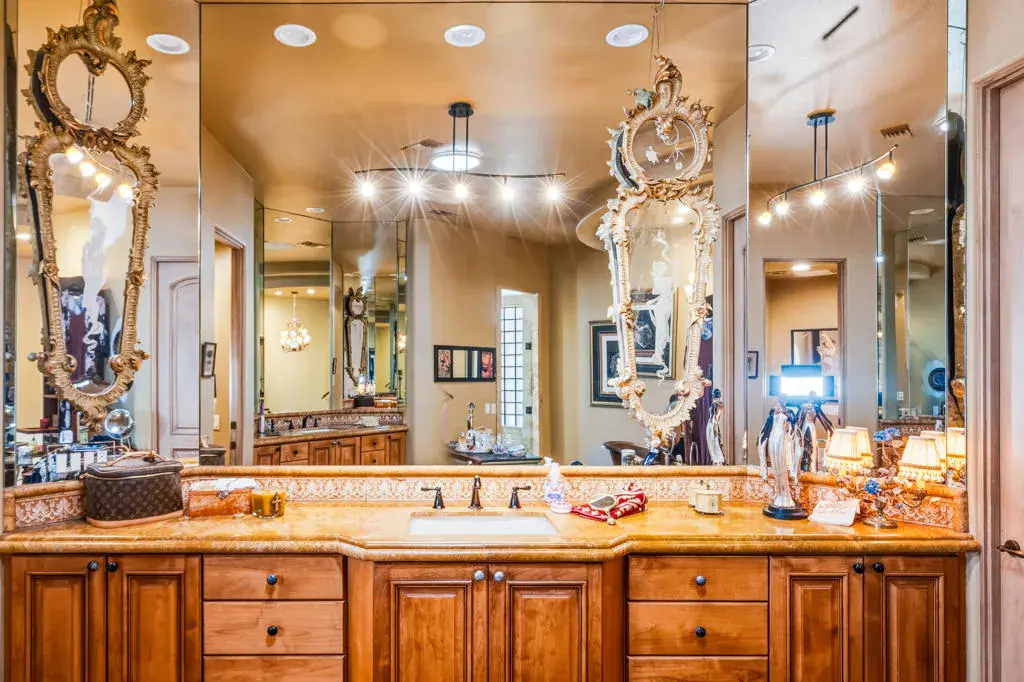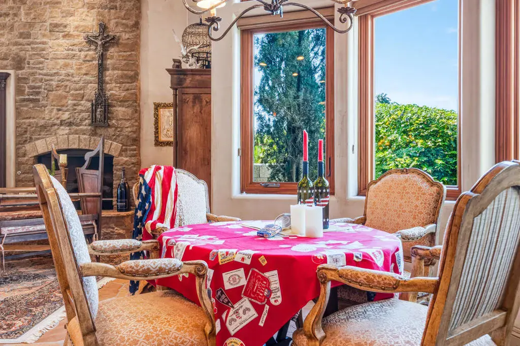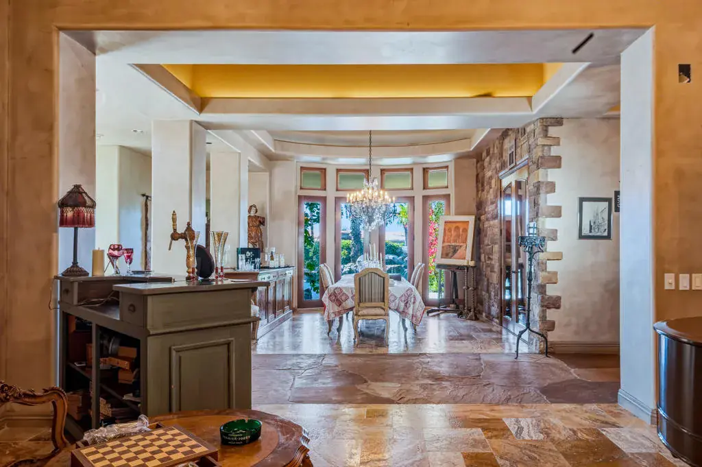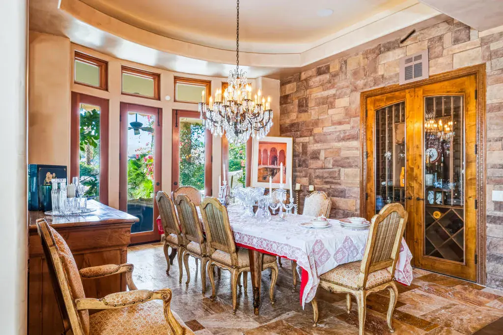 La Vie en Rose — A Montmartre-Inspired European Villa Estate in the Heart of Palm Desert. Evoking the bohemian romance of Paris’s 18th arrondissement, this Montmartre-inspired custom estate blends European villa elegance with refined modern luxury. Located minutes from Desert Willow Golf Resort in prestigious Montecito Estates, this extraordinary residence offers approximately 4,650 square feet of curated craftsmanship, timeless architectural detail, and breathtaking southwest mountain views.Privately positioned on a premier interior corner cul-de-sac lot in central Palm Desert, palatial entry doors open to imported flagstone flooring and a dramatic formal dining room with a built-in illuminated wine cellar — a stunning focal point for elegant entertaining. Sparkling chandeliers grace each room, while oversized framed windows capture panoramic wrap-around mountain vistas and flood the home with natural light.The grand great room is anchored by a striking stone-wrapped fireplace. The chef’s kitchen is designed for both intimate gatherings and large-scale entertaining, featuring three built-in ovens, a six-burner gas cooktop, natural stone countertops, custom cabinetry, and a glass-door walk-in pantry with built-in storage and continued stone finishes.This five-bedroom, five-and-a-half-bath estate includes a private-entry casita currently styled as an executive office with custom built-ins and exterior access. One additional guest bedroom also offers a private entrance. Ideal for guests. Each of the six bathrooms showcases bespoke custom tilework, giving every suite distinctive European character and spa-inspired appeal.Originally built by a custom homebuilder as his personal residence, the quality is exceptional, with top-tier craftsmanship and extensive natural stonework throughout.Outdoors, professionally designed landscaping surrounds a private patio retreat with pool, spa, tranquil water features, misting system, and built-in BBQ with bar top — all oriented to capture spectacular southwest-facing mountain views for seamless indoor-outdoor luxury living.Additional amenities include a fully owned $100,000 solar system, Tesla Powerwall energy storage, Nuvia water softening system, and a finished, air-conditioned oversized three-car garage.Situated within five miles of world-class shopping, fine dining, entertainment, and healthcare — and surrounded by the acclaimed fairways of Desert Willow Golf Resort