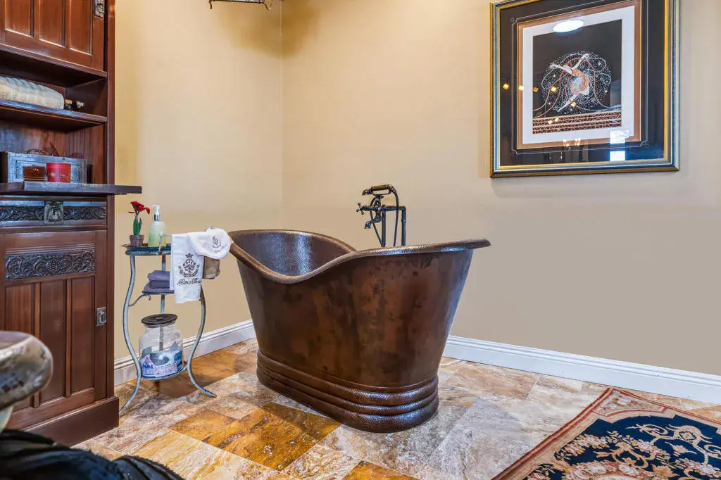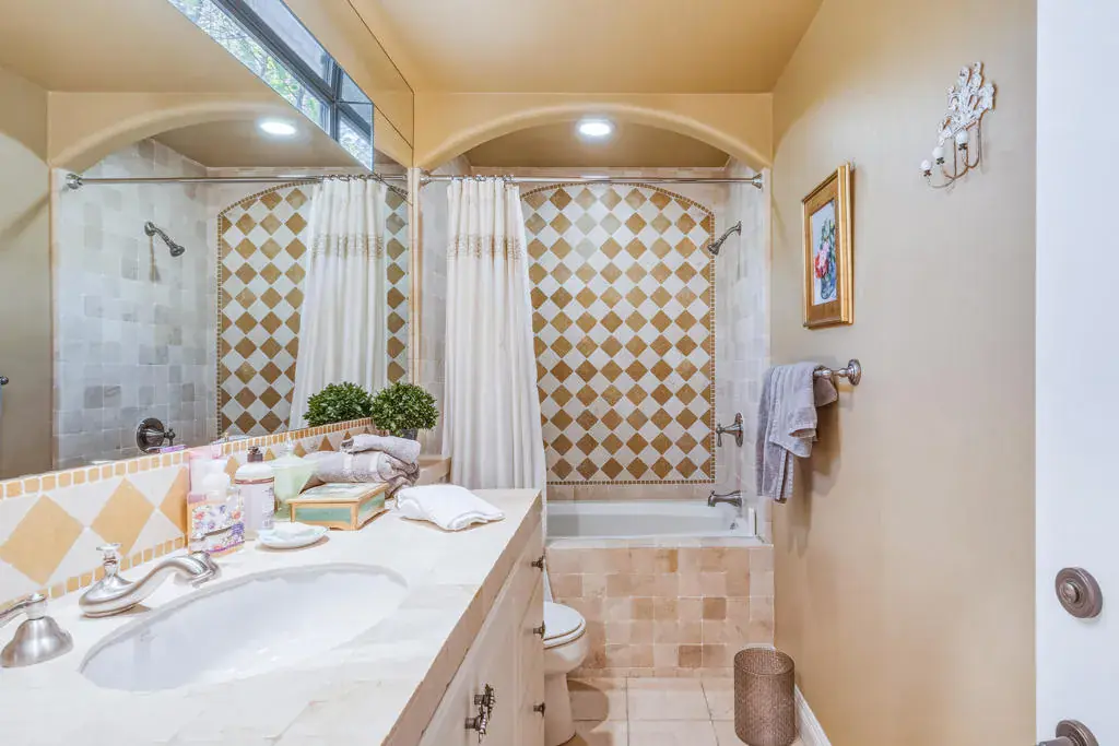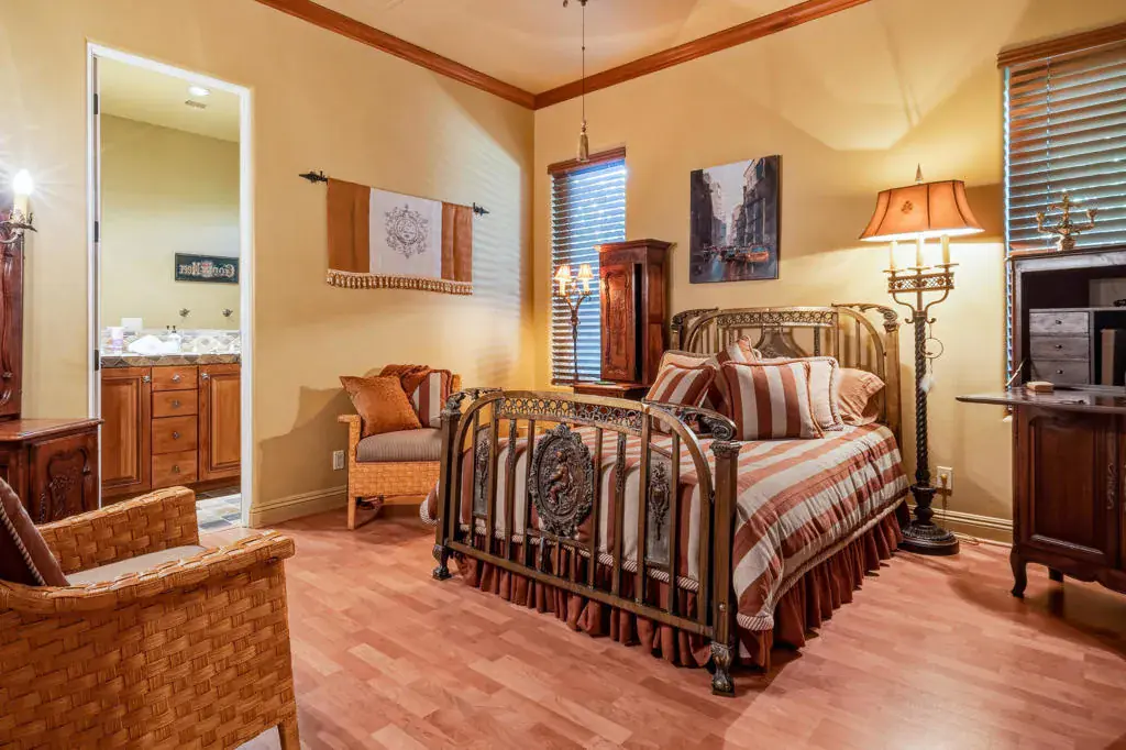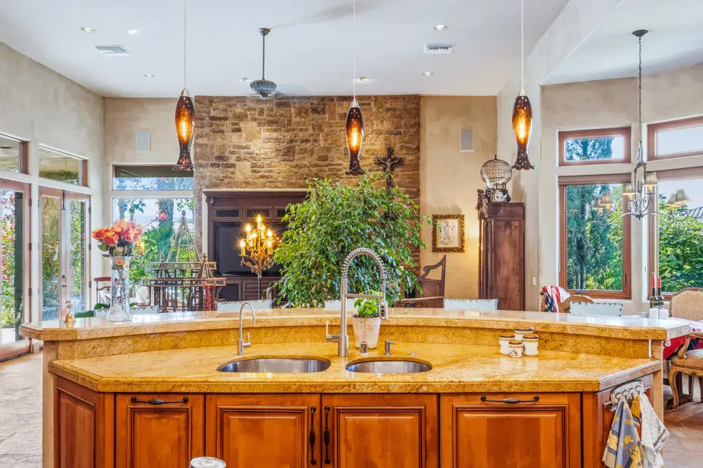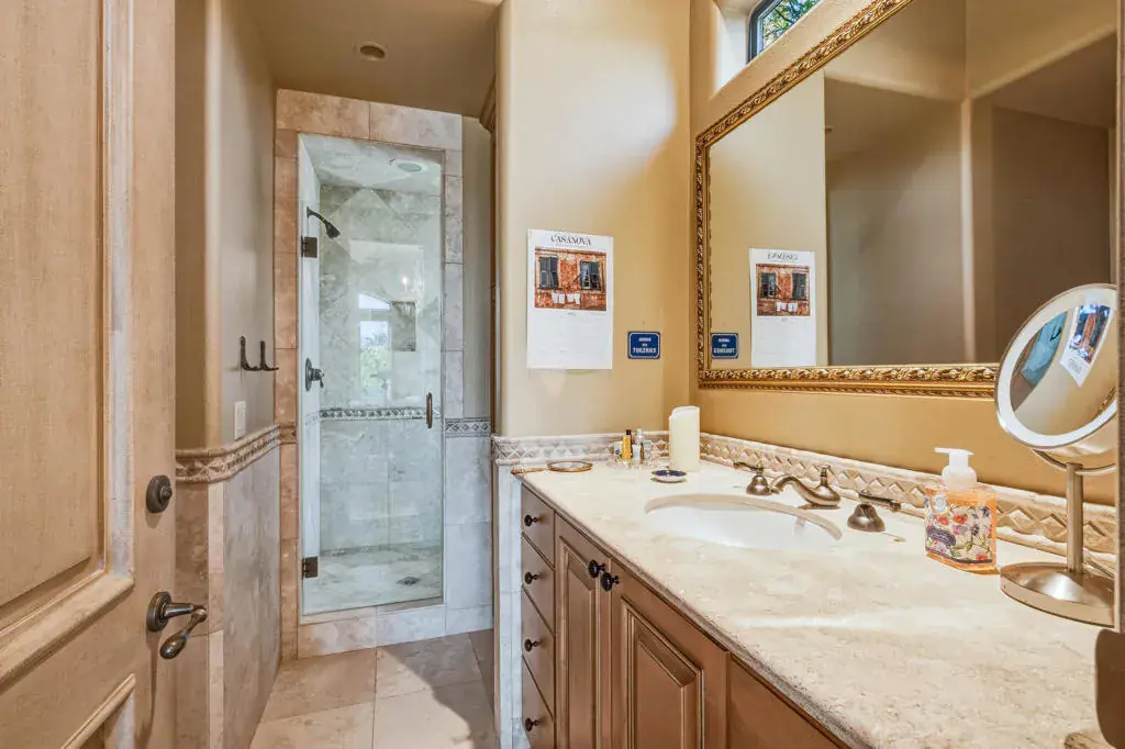 La Vie en Rose — A Montmartre-Inspired European Villa Estate in the Heart of Palm Desert. Evoking the bohemian romance of Paris’s 18th arrondissement, this Montmartre-inspired custom estate blends European villa elegance with refined modern luxury. Located minutes from Desert Willow Golf Resort in prestigious Montecito Estates, this extraordinary residence offers approximately 4,650 square feet of curated craftsmanship, timeless architectural detail, and breathtaking southwest mountain views.Privately positioned on a premier interior corner cul-de-sac lot in central Palm Desert, palatial entry doors open to imported flagstone flooring and a dramatic formal dining room with a built-in illuminated wine cellar — a stunning focal point for elegant entertaining. Sparkling chandeliers grace each room, while oversized framed windows capture panoramic wrap-around mountain vistas and flood the home with natural light.The grand great room is anchored by a striking stone-wrapped fireplace. The chef’s kitchen is designed for both intimate gatherings and large-scale entertaining, featuring three built-in ovens, a six-burner gas cooktop, natural stone countertops, custom cabinetry, and a glass-door walk-in pantry with built-in storage and continued stone finishes.This five-bedroom, five-and-a-half-bath estate includes a private-entry casita currently styled as an executive office with custom built-ins and exterior access. One additional guest bedroom also offers a private entrance. Ideal for guests. Each of the six bathrooms showcases bespoke custom tilework, giving every suite distinctive European character and spa-inspired appeal.Originally built by a custom homebuilder as his personal residence, the quality is exceptional, with top-tier craftsmanship and extensive natural stonework throughout.Outdoors, professionally designed landscaping surrounds a private patio retreat with pool, spa, tranquil water features, misting system, and built-in BBQ with bar top — all oriented to capture spectacular southwest-facing mountain views for seamless indoor-outdoor luxury living.Additional amenities include a fully owned $100,000 solar system, Tesla Powerwall energy storage, Nuvia water softening system, and a finished, air-conditioned oversized three-car garage.Situated within five miles of world-class shopping, fine dining, entertainment, and healthcare — and surrounded by the acclaimed fairways of Desert Willow Golf Resort