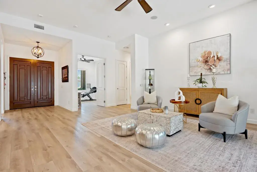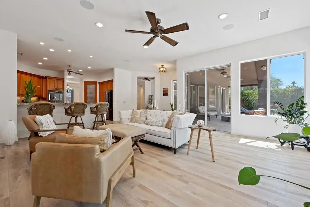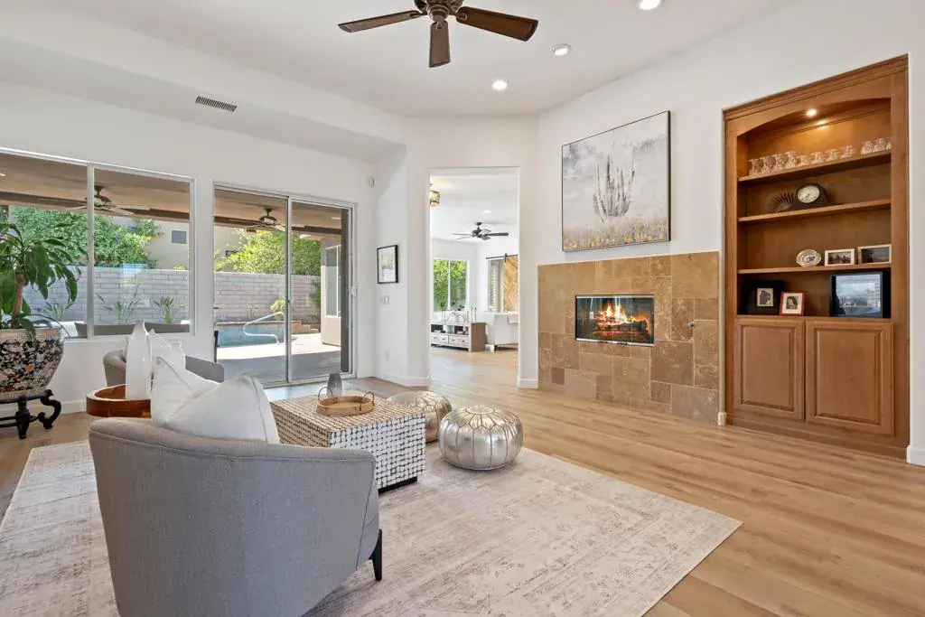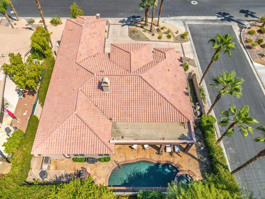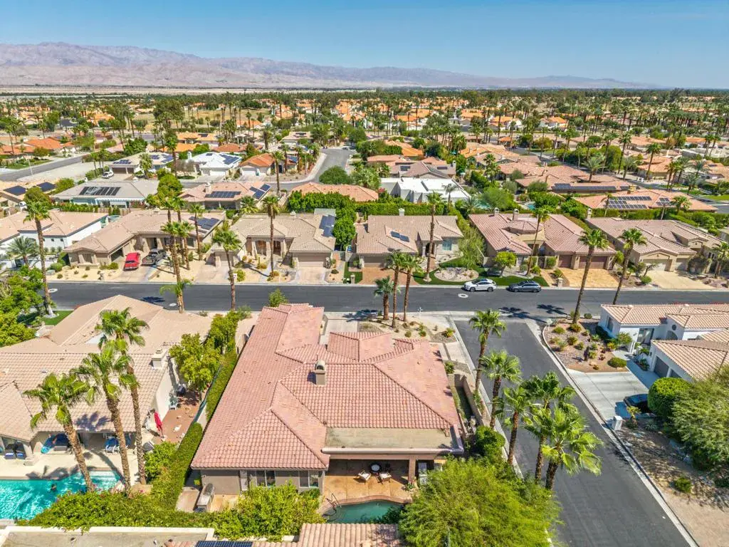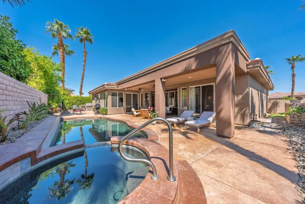 Stunning custom Tom Noble home located in the highly desirable and rarely available Montecito community of Palm Desert, California. Set on an elevated interior corner lot with a circular driveway, this beautifully upgraded residence offers 4 bedrooms plus a private office and 4 bathrooms, providing the ideal layout for full-time living or a luxury desert retreat.Inside, enjoy 4 cooling zones (5 thermostats) with newer AC units, LED lighting, solid-core doors, Hunter Douglas ceiling fans, surround sound, fresh interior paint, and luxury vinyl plank flooring throughout.The chef’s kitchen is designed for both cooking and entertaining, featuring stainless steel appliances, a Dacor 6-burner gas cooktop, granite countertops, pull-out drawers, two pantries (including one with a glass-panel door), a Franke graphite sink, gooseneck faucet, backsplash detail, and custom crown molding with elegant up-lighting.The spacious primary suite includes two walk-in closets with pull-down rods and an additional linen closet, offering exceptional storage and convenience.The epoxied 3-car garage features built-in custom cabinetry for organized storage.Outdoor living shines with newly remodeled front and rear landscaping, upgraded lighting, new sprinklers, and drought-tolerant plantings. The private backyard is a true desert oasis with a Pebble-Tec pool and spa and a built-in BBQ island with a refrigerator–perfect for year-round entertaining in Palm Desert’s resort-style climate.This exceptional home in Montecito, Palm Desert combines quality construction, refined upgrades, and an unbeatable location near world-class golf, dining, and shopping.