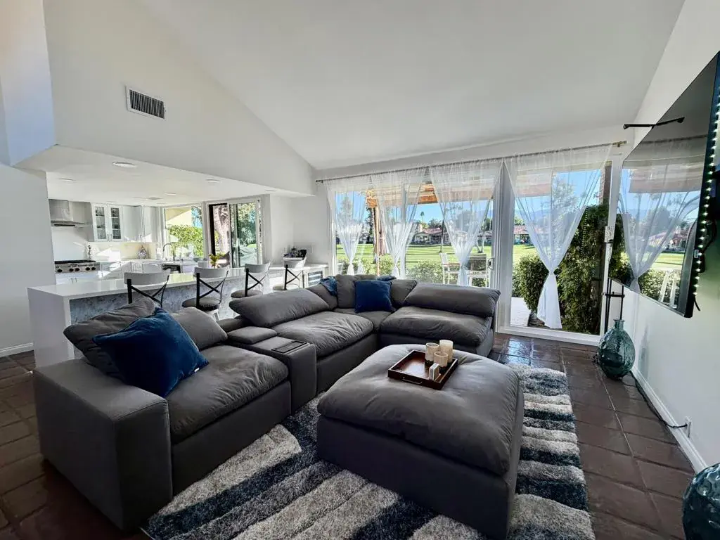Escape to the desert and settle into this superb south lot seasonal retreat with panoramic mountain, fairway, and lake views that glow from sunrise to sunset. Designed for effortless desert living, the home features 2 bedrooms plus a spacious converted atrium, thoughtfully set up with two additional beds and a cozy media room, perfect for hosting guests or extended stays.Soaring ceilings and walls of glass fill the living spaces with natural light, creating a bright, open atmosphere that flows seamlessly from the living room to the outdoors. The updated kitchen is fully equipped and ideal for both everyday living and entertaining, while comfortable, well-appointed furnishings make it easy to relax from the moment you arrive.Step outside to the private patio and enjoy morning coffee overlooking manicured fairways, afternoons in the sun, and evenings framed by mountain silhouettes and desert skies. Offered turnkey furnished, this home is ready for a carefree seasonal stay. Just arrive, unwind, and enjoy everything the desert lifestyle has to offer.