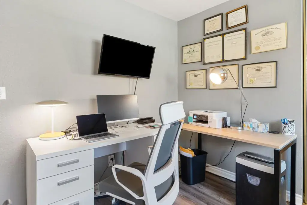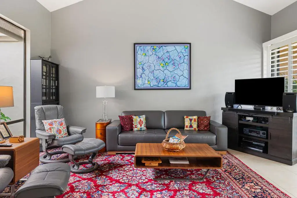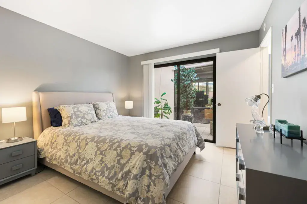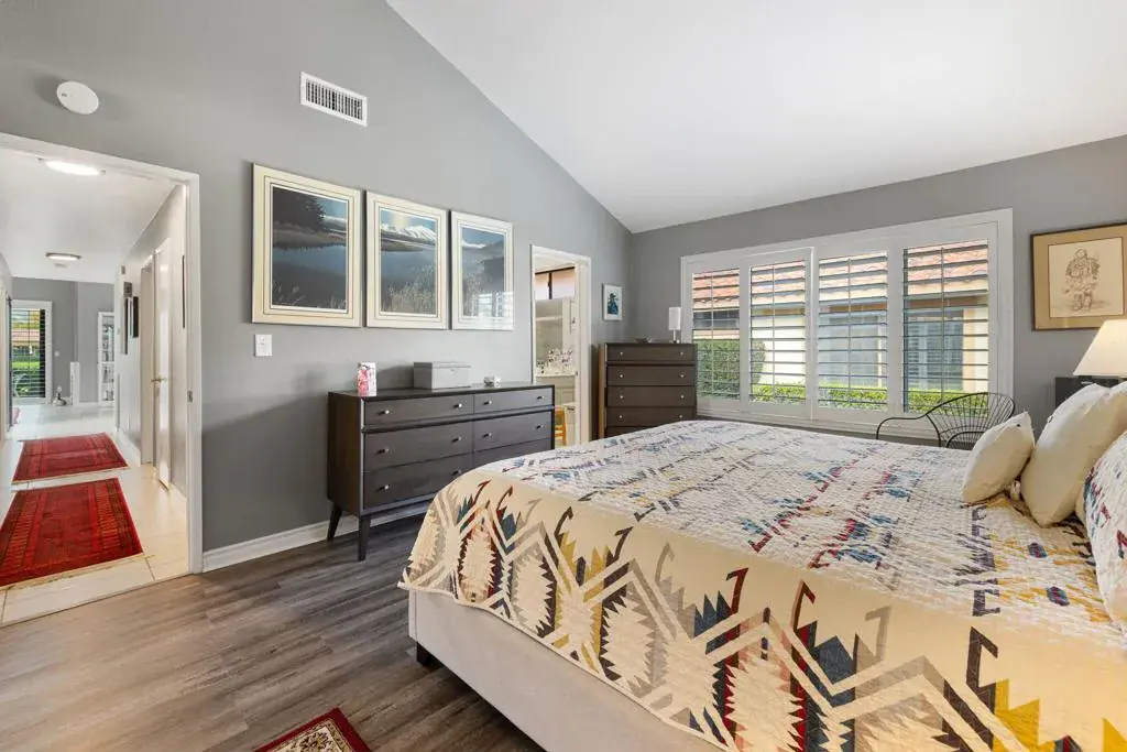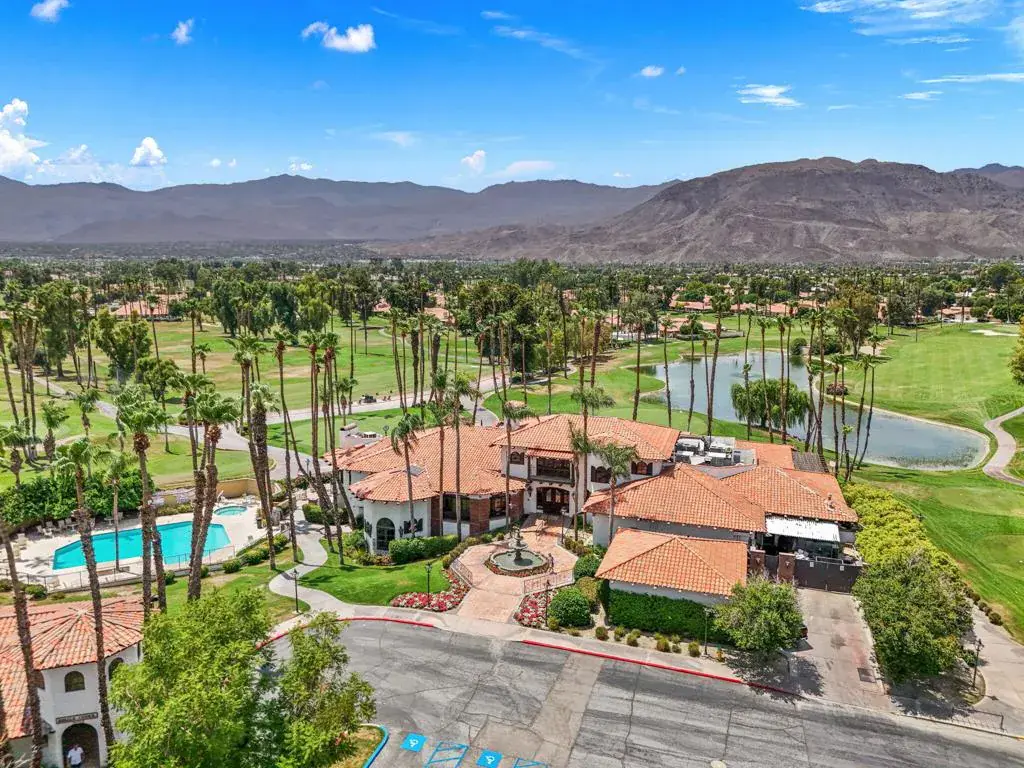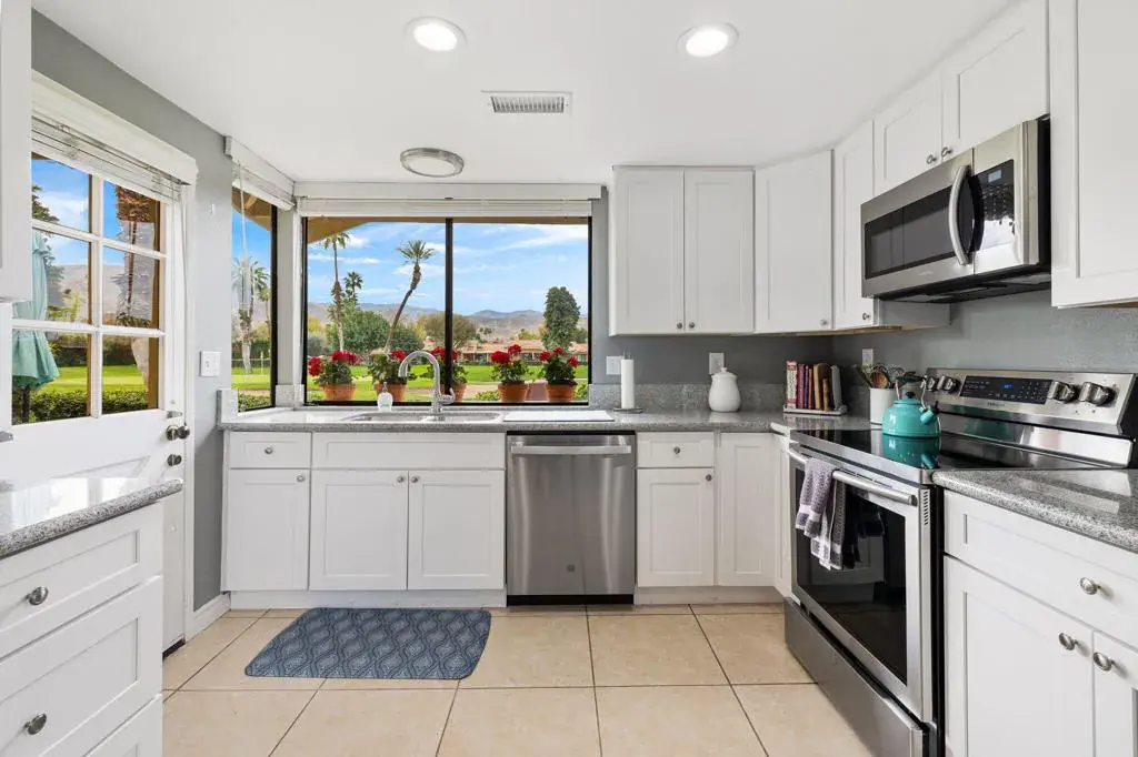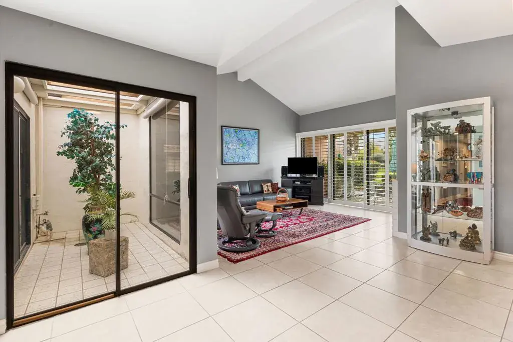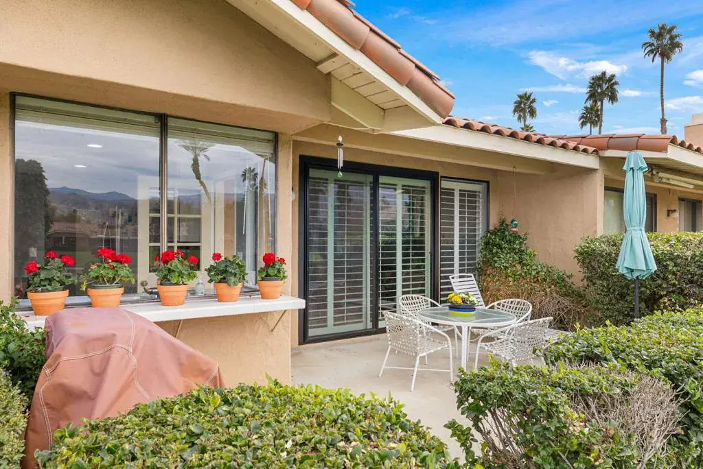 This one-story, west-facing end-unit condominium is located within Monterey Country Club and offers approximately 1,584 square feet of open, thoughtfully designed living space. The single-level layout, combined with an easy-flow floor plan, supports a comfortable and accessible living experience well suited to a low-maintenance desert lifestyle.Ceramic tile flooring extends throughout the main living areas, while the two bedrooms and office (which can also be used as a third bedroom) feature wood laminate flooring. Large windows fill the home with natural light and frame golf course and mountain views. An interior atrium adds architectural interest and additional light, offering flexibility as a seating area, display space, or future garden retreat.The light and bright kitchen features granite countertops and generous windows overlooking the golf course. The open design flows naturally into the living area, where a fireplace creates a warm focal point and enhances everyday comfort.The primary bedroom is generously sized, offering a private and relaxing retreat. The primary bathroom has been updated with a newly replaced shower glass door. Recent improvements throughout the home include new shutters and mini-blinds in the kitchen and bedrooms, custom lighting, a new hot water heater, a new laundry room ceiling fan, updated door locks, and a new garage door motor. The attached two-car garage adds convenience and storage. An update on the condo was completed in 2019 by the previous ownerThe home is offered turnkey furnished, excluding personal property, stereo set, primary bedroom furniture and rug, living room and entry area rugs. A golf cart is available for purchase outside of escrow.Monterey Country Club is a centrally located, well-established Palm Desert community offering a 27-hole golf course, clubhouse amenities, tennis and pickleball courts, and multiple swimming pools. The mature landscaping, maintained grounds, and inclusive amenities support a relaxed, lock-and-leave lifestyle with easy access to shopping, dining, and everyday services.