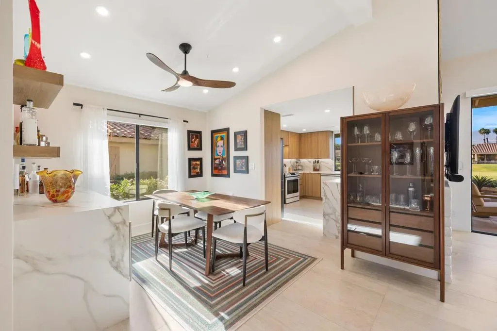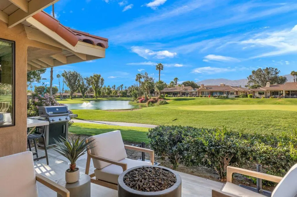 Premium golf course location in Monterey Country Club showcasing panoramic south-facing mountain and water views. This fully redesigned condo is flooded with natural light and offers a seamless blend of modern sophistication and timeless European-inspired design.Featuring 2 bedrooms plus a den and 2 fully remodeled bathrooms, this lock-and-leave retreat is thoughtfully curated with soft, organic tones that create a warm yet refined aesthetic throughout.Upon entry, you’re welcomed by expansive 24×48 porcelain tile that flows continuously through the interior and out onto the patio, creating a clean, cohesive indoor-outdoor living experience. Brand new windows and sliders are complemented by custom motorized shades, while the vaulted living room ceilings add volume and an airy sense of space.The kitchen is both stylish and functional, complete with soft-close cabinetry, Italian countertops and matching backsplash, brand new appliances, and abundant storage.Additional upgrades include a custom dry bar with dual wine refrigerators, floating bathroom vanities, backlit LED mirrors, a new water heater and AC unit, epoxy-coated garage flooring, and a luxurious primary suite with a custom walk-in shower featuring dual ceiling-mounted rain heads. Ideally located in the heart of the Coachella Valley, Monterey Country Club offers convenient access to El Paseo’s premier shopping and dining, as well as world-class golf and entertainment. Residents of Monterey Country Club enjoy a clubhouse, fitness center, 27 holes of Ted Robinson-designed golf, 6 tennis courts, 33 pickle ball courts, 4 lane bocce ball court, and 37 pools and spas.