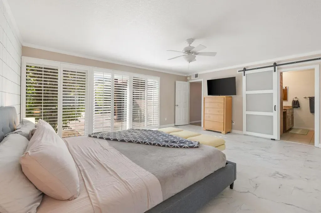 Price Reduction ADORABLE MID CENTURY BUNGALOW This two bedroom/two bath is the perfect desert home or getaway. Located on a cul-de-sac, all on one level, and walking distance to El Paseo for dining and shopping. Small private complex of just 4 units with shared pool. Great space, lots of light, view of the pool and mountains, plantation shutters thru out, double pane windows and LOW HOA fees. Lovely updated kitchen w/stainless appliances. Washer/dryer inside unit. Large primary bedroom w/large shower in primary bath. Updated guest bath. Inviting large front patio with Awesome mountain views. One car Garage w/storage. Join the Shadow Mountain Social Membership and meet your neighbors. Come take a look! You will not be disappointed!
