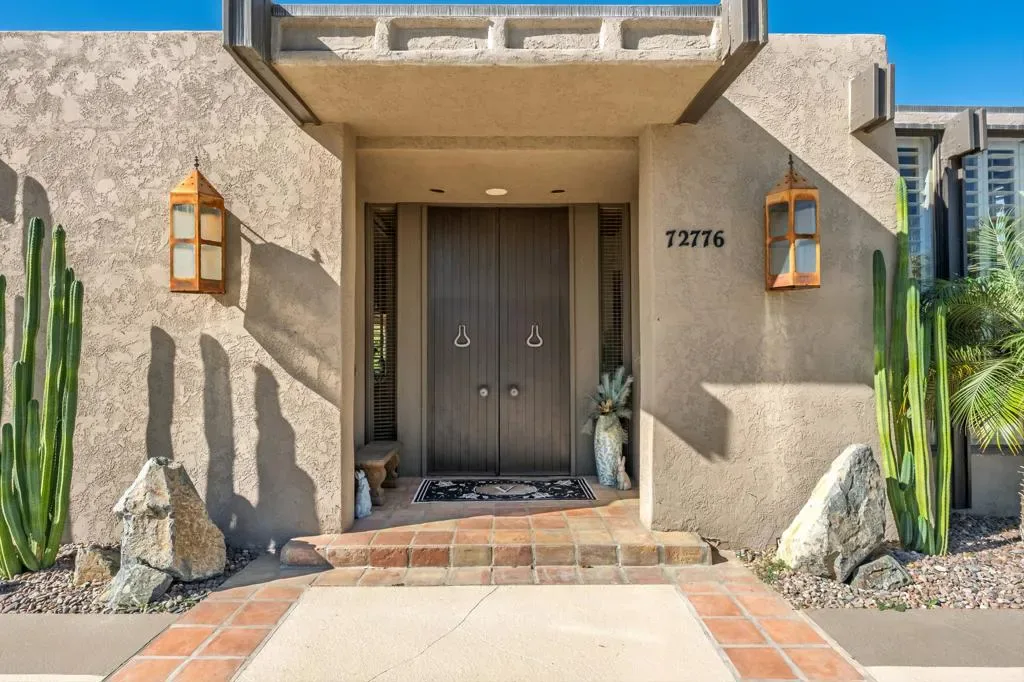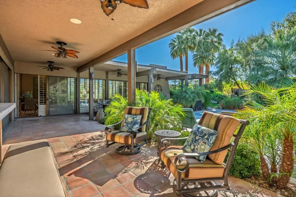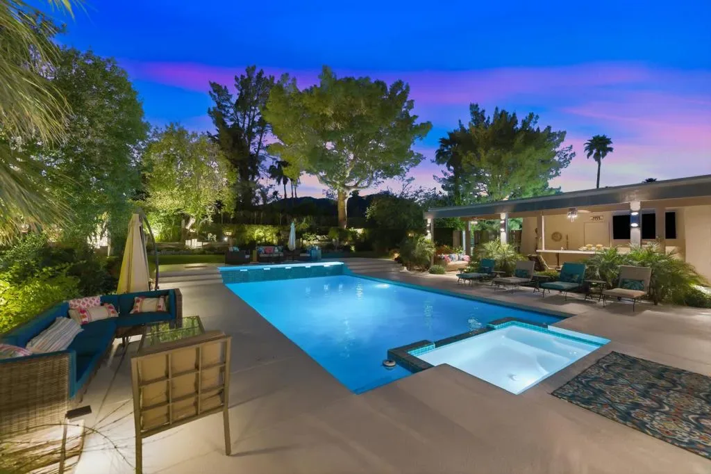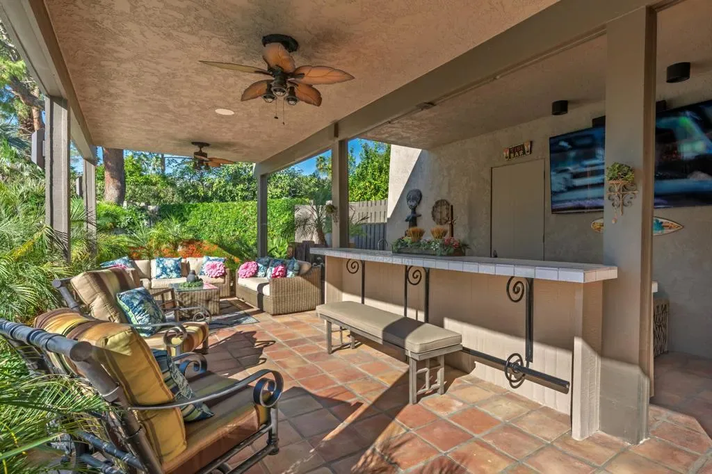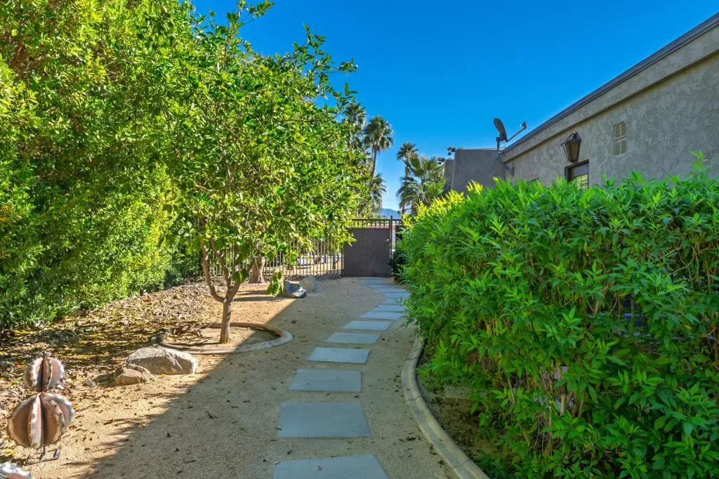 At the end of the rainbow lies this shan-gri-la. Built by famed Hollywood producer, John Conboy, for his personal desert home, and what a master piece of lush greenery surrounded by lighted palm trees, meandering paths, fruit trees, with the desert mountains pouring into the backyard as if to say they approve of this desert oasis. The ambience is too irresistible to ignore. It pulls you to every corner of the lovely property. At night, the home comes alive with strategically placed lighting and hardwired music to soothe the soul. Have an evening with friends in this majestic place with its very own Bocce ball court, an outdoor kitchen equipped with a refrigerator, large BBQ, sink, ice chest, 6-person bar, and a large TV–the sounds of the fountain in the pool surrounding you. Now let’s step inside this custom home, featuring Sentilla tile, custom solid wood paneling, stereo system Garden Security Gates with codes to enter yard, Electric fans span over the oversized covered porch, Rambling yard with views of mountains, Bocce ball court with patios for viewing, Enjoy sweet fruit from the Orchard of over 8 fruit trees, an abundance of cabinets, Large pool with water fall, with an attached but separate hot tub with jets, Yard provides views but total privacy, Indoor/outdoor living with sliders to outside, Corner Lot with amazing street presence, Custom made oversized front doors with custom made iron door knobs that make an instant impression, Convenient garbage area right outside side door Security Alarm, Air conditioned 2 car garage with abundant storage with app controlled garage door & Code Pad, 3 air conditioning units controlled with nest thermostats, Ceiling Fans in every room, 11 Foot Ceilings throughout Home, Solid Wood Beams in Great Room, Kitchen, and Casita, The large oversized Bee Hive fireplace in the living room provides a fun vibe while decorated with comfort and warmth, Custom solid wood paneling throughout the home, Custom solid wood shelving in primary and guest bedroom, Custom iron forged door hardware throughout home, Extra wide hallways lending themselves to a home art gallery, Enjoy views from every room with the oversized tall windows throughout the home, Custom full-size solid wood shutters throughout the entire home, Large primary suite with full bath and walk-in closet with a door connecting to the back yard, 2 additional bedroom suites with walk-in closets, with a jack and jill bathroom.