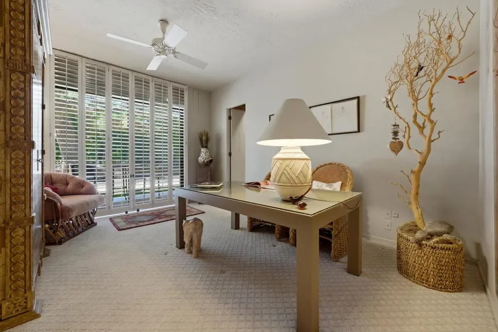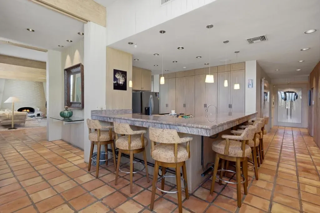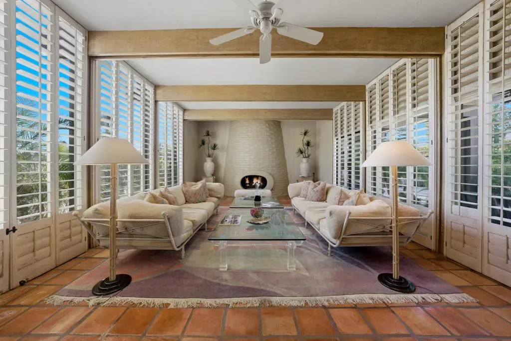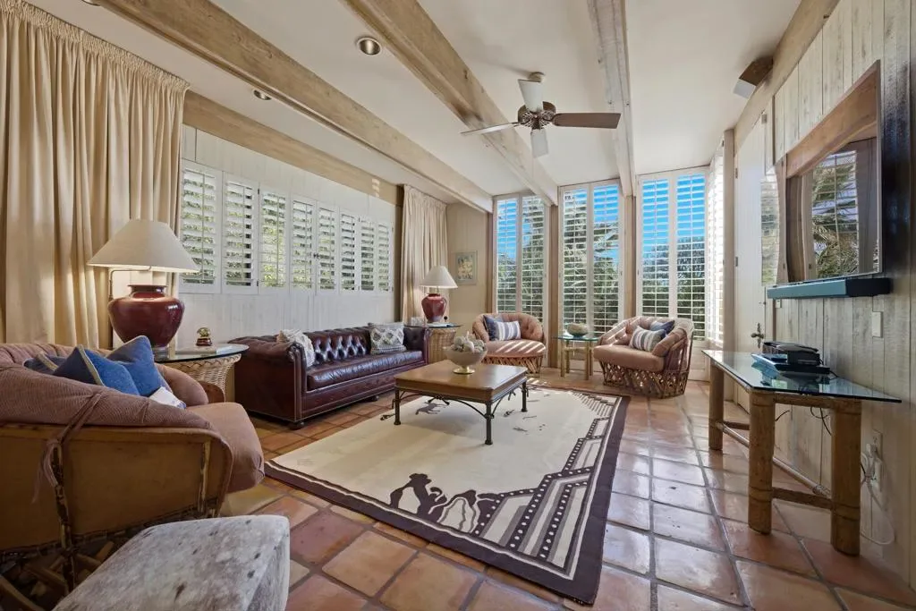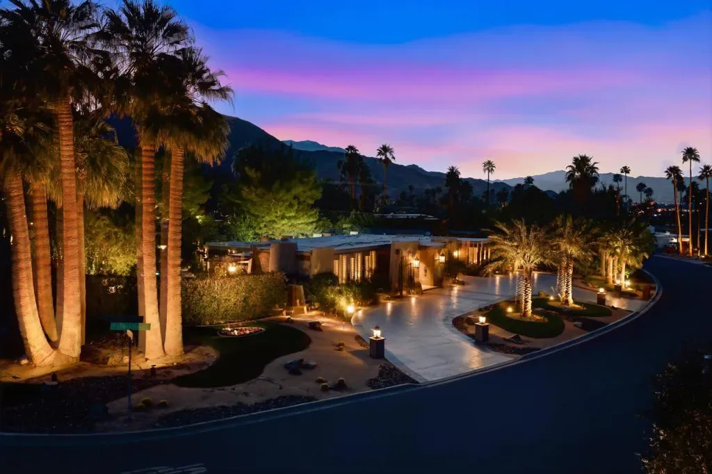 At the end of the rainbow lies this shan-gri-la. Built by famed Hollywood producer, John Conboy, for his personal desert home, and what a master piece of lush greenery surrounded by lighted palm trees, meandering paths, fruit trees, with the desert mountains pouring into the backyard as if to say they approve of this desert oasis. The ambience is too irresistible to ignore. It pulls you to every corner of the lovely property. At night, the home comes alive with strategically placed lighting and hardwired music to soothe the soul. Have an evening with friends in this majestic place with its very own Bocce ball court, an outdoor kitchen equipped with a refrigerator, large BBQ, sink, ice chest, 6-person bar, and a large TV–the sounds of the fountain in the pool surrounding you. Now let’s step inside this custom home, featuring Sentilla tile, custom solid wood paneling, stereo system Garden Security Gates with codes to enter yard, Electric fans span over the oversized covered porch, Rambling yard with views of mountains, Bocce ball court with patios for viewing, Enjoy sweet fruit from the Orchard of over 8 fruit trees, an abundance of cabinets, Large pool with water fall, with an attached but separate hot tub with jets, Yard provides views but total privacy, Indoor/outdoor living with sliders to outside, Corner Lot with amazing street presence, Custom made oversized front doors with custom made iron door knobs that make an instant impression, Convenient garbage area right outside side door Security Alarm, Air conditioned 2 car garage with abundant storage with app controlled garage door & Code Pad, 3 air conditioning units controlled with nest thermostats, Ceiling Fans in every room, 11 Foot Ceilings throughout Home, Solid Wood Beams in Great Room, Kitchen, and Casita, The large oversized Bee Hive fireplace in the living room provides a fun vibe while decorated with comfort and warmth, Custom solid wood paneling throughout the home, Custom solid wood shelving in primary and guest bedroom, Custom iron forged door hardware throughout home, Extra wide hallways lending themselves to a home art gallery, Enjoy views from every room with the oversized tall windows throughout the home, Custom full-size solid wood shutters throughout the entire home, Large primary suite with full bath and walk-in closet with a door connecting to the back yard, 2 additional bedroom suites with walk-in closets, with a jack and jill bathroom.