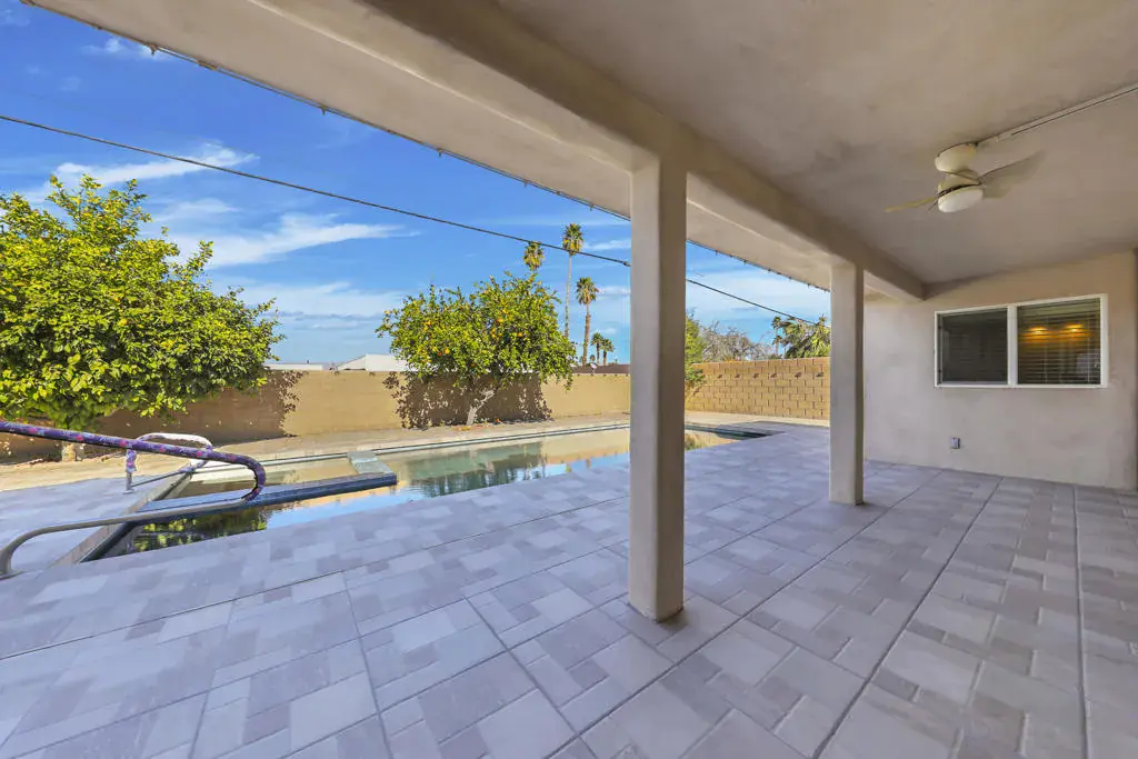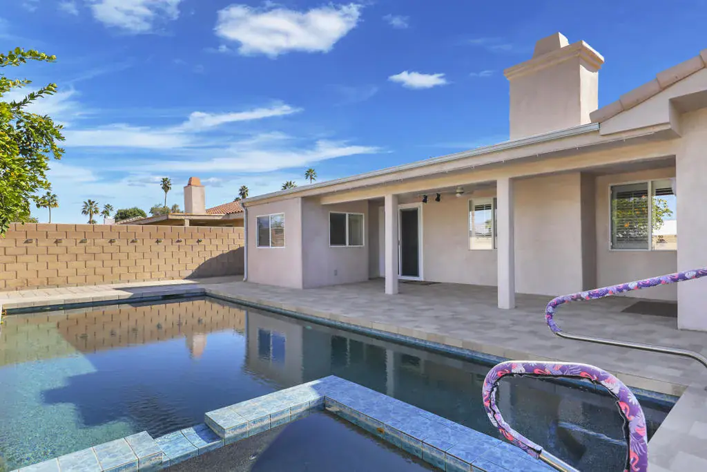 Location – Location – Location! 92260 Zip Code!Centrally located in a sought-after area of Palm Desert, walking distance to the shops and dining of El Paseo, Palm Desert Mall, Civic Center Park, etc. This desert styled-house hits the market with a 3 bed, 2.5 full baths with a Kitchen complete with Granite countertops and ample storage. There is a dedicated walk-in laundry room with cabinets and a fully functional toilet.The Primary Suite, located at the back of the house comes with a large walk-in closet with custom cabinets, en-suite bathroom with a walk-in shower and a large tub and closed-off office facing the pool. The hardscaped Backyard comes with a nice Pebbletec Pool and Spa, recently tiled pool deck, and a covered patio with a large seated area with ceiling fan facing the pool. Both Guest Bedrooms are located at the front of the property – The house is fully secured and and enclosed with block walls and keyed front gate that keeps unsolicited salesmen out. There is more, the house also comes with a Water Filtration system, outdoor Misters for those harsh summer months, Solar Panels, front privately secured court yard. The double-car garage comes with an EV car outlet for those with Electric cars. Recent upgrades include Brand New Modern Garage Door with a Custom-made front Metal Gate with frosted glass to match garage door. High-end custom Front Entry Door with frosted glass in-lays to match garage door and front gate. Front yard has been re-landscaped to include landscaping lights. All toilets have been upgraded with water conservation dual flush toilets, new paint throughout. Brand New Water Heater, etc. All these have been done in the last couple of months just for the peace of mind of the future new owner. Full Smooth Stucco, Windows, Porcelain Tiles throughout. The house is immaculate inside and outside and has been kept in a very good condition. All new pool equipment, approximately 3 years old. Front and Back yards are all hardscaped to minimized maintenance cost bt also dust on your future outdoor furniture, which is a constant well known frustration for homeowners over here in the desert. Come and See it for yourself, don’t rely on photos, you might just miss this one out! One of the Best Locations to live in the Palm Desert. Note: Master Bedroom and Living Room digitally staged.