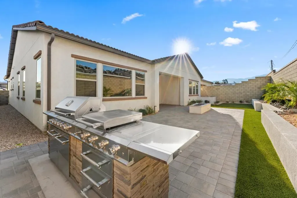 Brand-new 2025 construction located in the city of Palm Desert. This never-lived-in Auburn model built by Pulte Homes offers 3 bedrooms plus a large den and 2 bathrooms, providing a flexible floor plan ideal for a home office, gym, media room, or potential fourth bedroom. The home features a modern open-concept layout with energy-efficient construction and contemporary finishes throughout. This home has SOLAR. The fully finished rear yard is a standout feature, complete with a built-in BBQ and outdoor fireplace, ideal for entertaining and enjoying desert living year-round. The two-car garage is equipped with an electric vehicle charger. Situated within a gated, all-age community, residents enjoy access to resort-style amenities including a clubhouse, pool, spa, hot tub, outdoor cooking and barbecue areas, picnic areas, and a playground. Conveniently located near shopping, dining, golf, and major amenities, this turnkey property is ideal for tenants seeking a high-quality long-term lease in a brand-new home