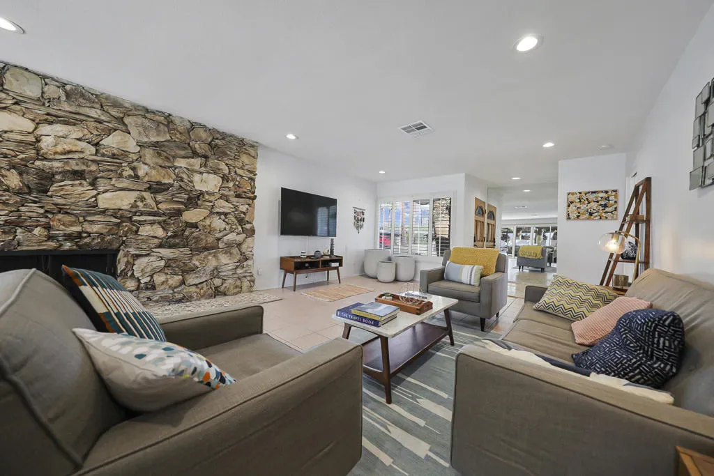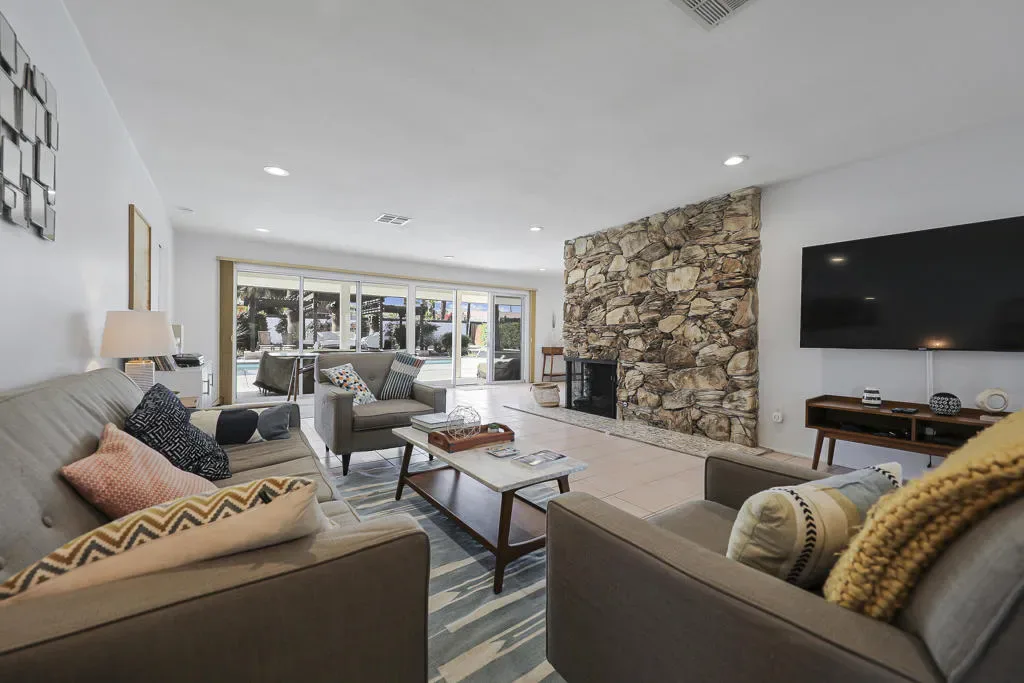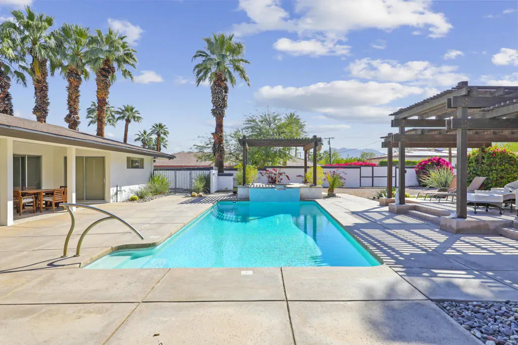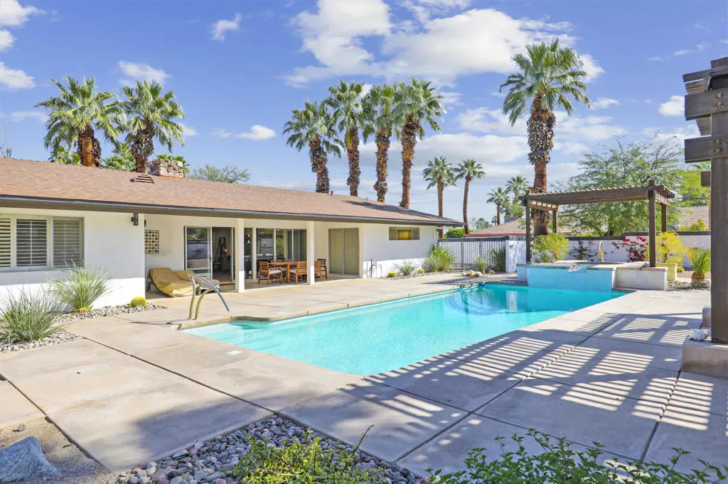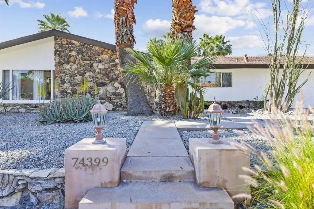 This one checks ALL the boxes!!! Prime location in sought-after prestigious neighborhood of SOUTH PALM DESERT! This spacious Mid-Century Modern 3-bedroom 3-bathroom ( all with walk in closets) is on a large 14520 square foot (1/3 acre).lot. Beautifully maintained by the discerning homeowner, retaining the originality of yesteryear, the 2,156 square-foot home is conveniently located near El Paseo with its fine-dining options and shopping, It boasts spectacular views from the large patio-shaded backyard outdoor living area, with backyard access from the dual master bedrooms. Not to be missed is the picturesque full-size slider window in the living room, with unobstructed Southerly views and the renovated 1960’s pool and waterfall spa. There is a side gate for RV parking or a potential ADU for someone looking to build on for guests aging parents, or rental income. All three bedrooms have ensuite bathrooms and expansive walk-in closets. The stacked rock fireplace and sunken tubs is a time capsule for architects like Burns, Meiselman and Wexler in the 1960.s. The back yard and pool area is exactly what the desert lifestyle is all about!!! NO HOA , easy to show!!