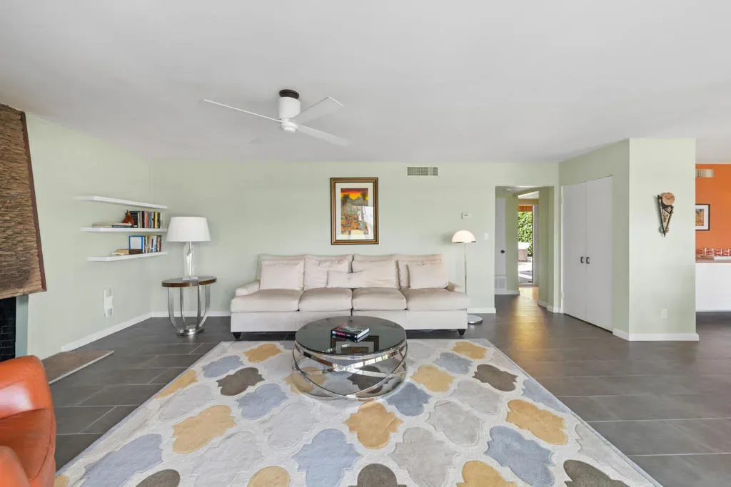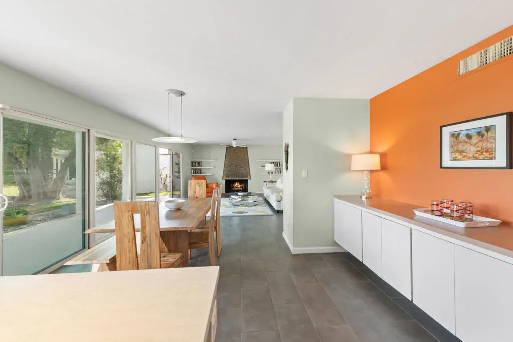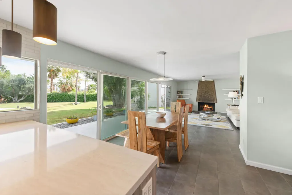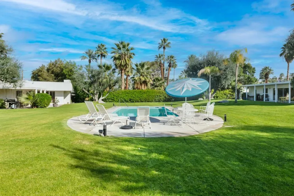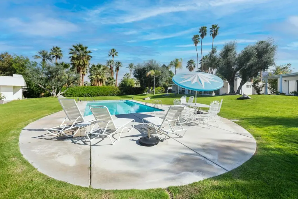 Here is a Unique opportunity to enjoy a 1962 Mid Century Gem in a Park-Like Setting in desirable South Palm Desert. A private courtyard opens to a double door foyer with original Terrazzo tile. Views of lush, beautifully maintained grounds and a sparkling pool are captured through floor-to-ceiling sliding glass patio doors. A thoughtful remodel features a sleek kitchen with Quartz Countertops, Newport Brass fixtures and GE Cafe Appliances. The open living/dining area features an expansive built-in buffet cabinet, Vintage dry bar and Fireplace. The Primary BR opens to an enclosed patio. Sleek porcelain tile throughout. Updated bathrooms feature Quartz countertops and tiled showers. This is one of four residences within a private enclave. Offered Turnkey Furnished to be enjoyed as a full time residence or vacation get-away where simplicity and relaxation is key.