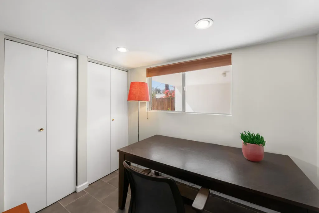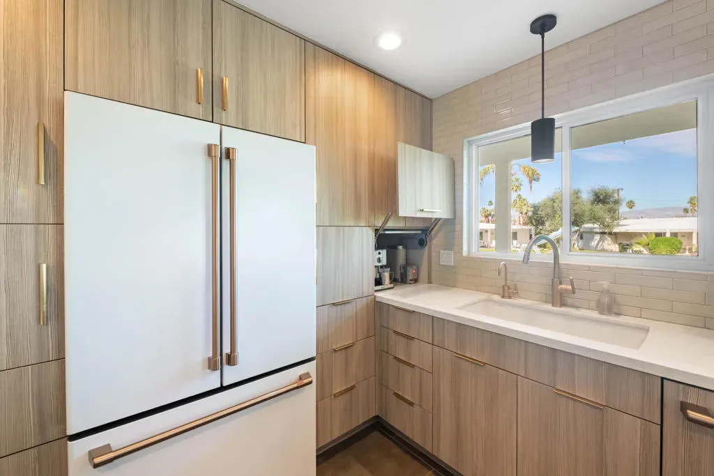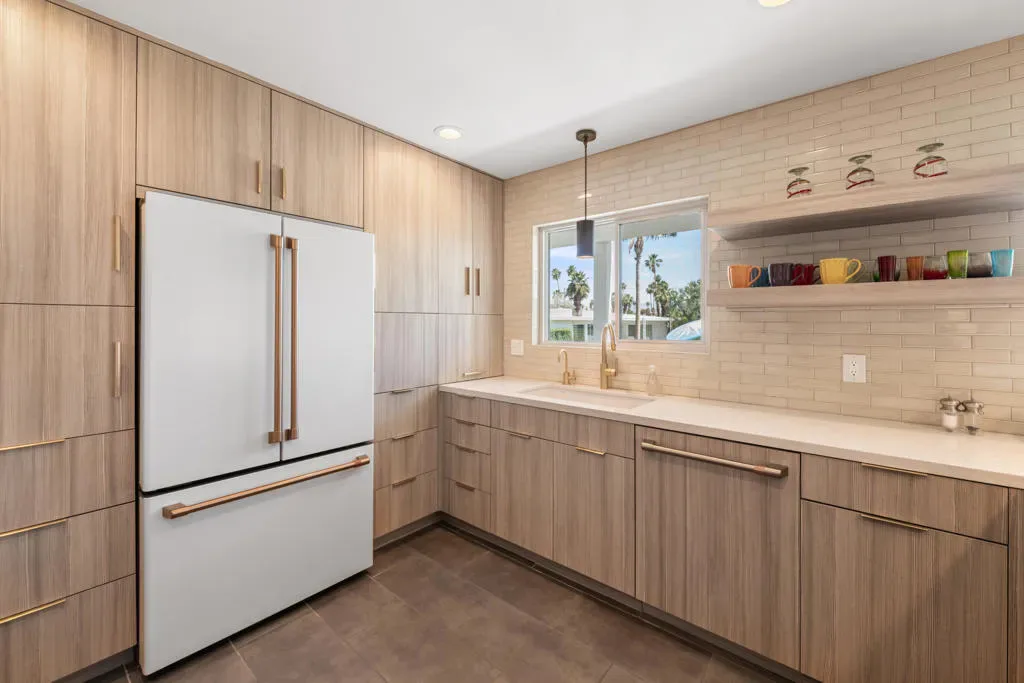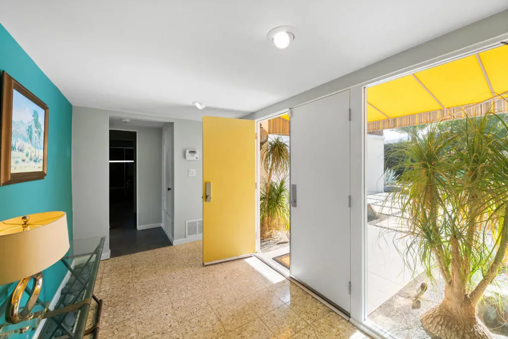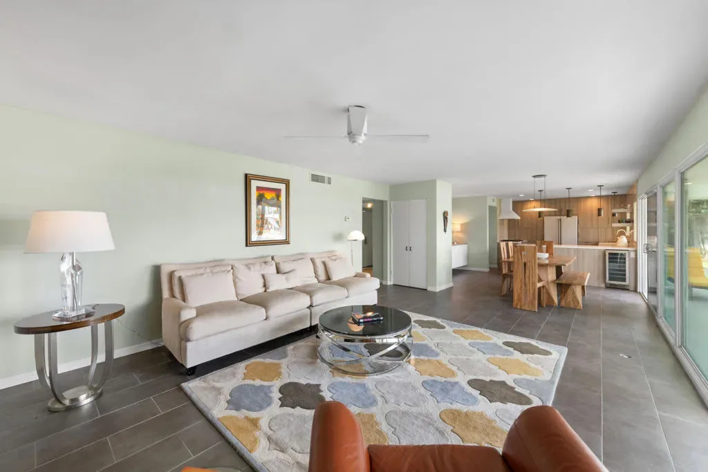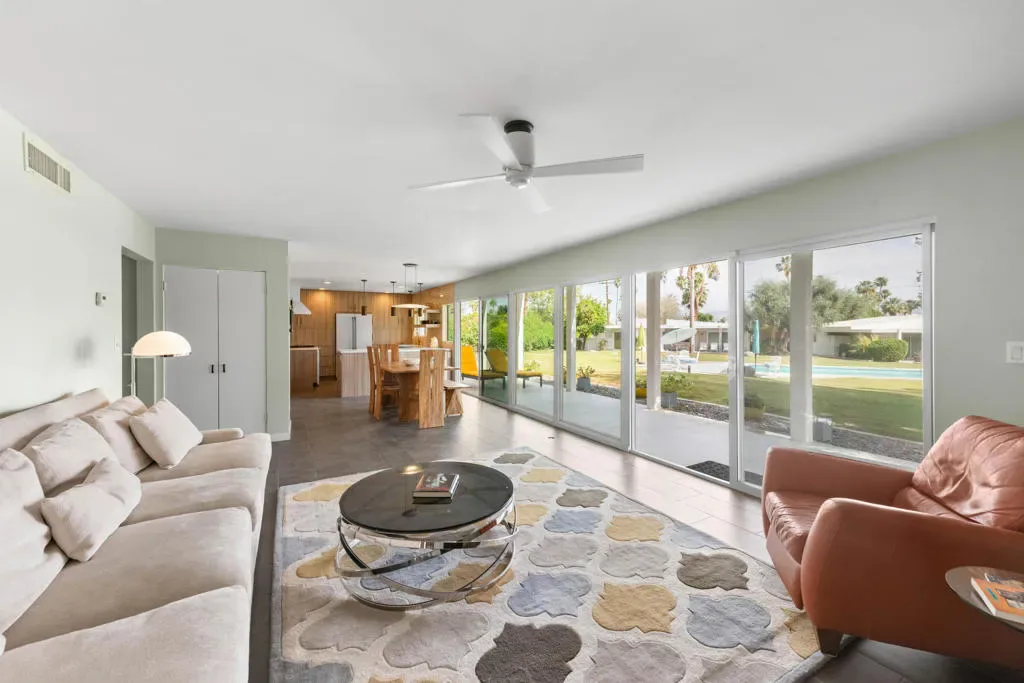 Here is a Unique opportunity to enjoy a 1962 Mid Century Gem in a Park-Like Setting in desirable South Palm Desert. A private courtyard opens to a double door foyer with original Terrazzo tile. Views of lush, beautifully maintained grounds and a sparkling pool are captured through floor-to-ceiling sliding glass patio doors. A thoughtful remodel features a sleek kitchen with Quartz Countertops, Newport Brass fixtures and GE Cafe Appliances. The open living/dining area features an expansive built-in buffet cabinet, Vintage dry bar and Fireplace. The Primary BR opens to an enclosed patio. Sleek porcelain tile throughout. Updated bathrooms feature Quartz countertops and tiled showers. This is one of four residences within a private enclave. Offered Turnkey Furnished to be enjoyed as a full time residence or vacation get-away where simplicity and relaxation is key.