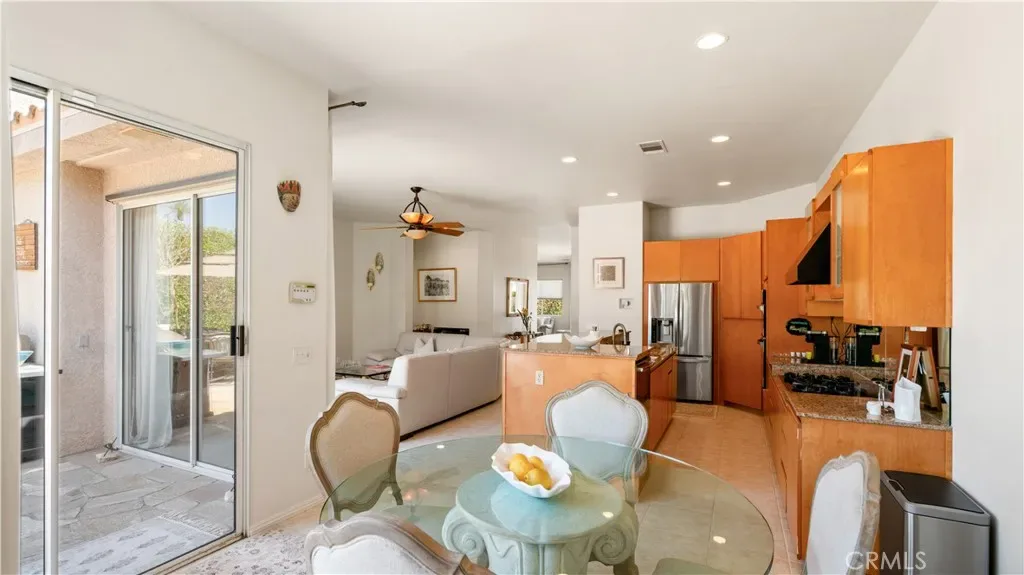 Inside, the home boasts an open, airy layout filled with natural light and expansive desert views. The well-appointed kitchen features stone countertops, generous storage, and is fully equipped for all your culinary needs. A formal dining area with seating for eight provides the perfect space for gathering with family and friends.