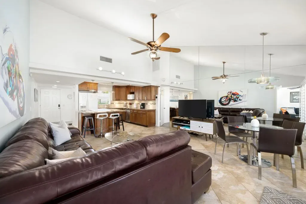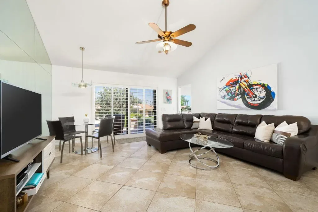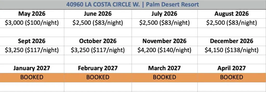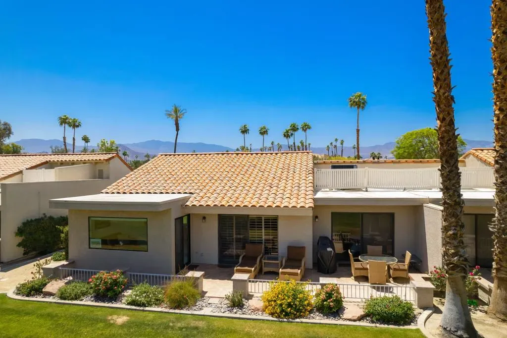 Available May 1, 2026-Dec 31, 2026. FURNISHED MONTHLY RENTAL in Palm Desert Resort, Fully RENOVATED 3-bedroom, 2-full bath. Pricing varies by month see LAST photo for pricing- inquire for longer stays. Landlord pays all utilities, deluxe cable package, upgraded wifi, all appliances, full size W/D included! Single story home, no stairs, no unit above. King in Master, Queen in Guest, Queen memory foam sleeper sofa in 3BD/ office. NO carpet. Enjoy the security and luxury of Palm Desert Resort Country Club with SO many fun amenities! One of the LARGEST condos in the entire community, this home has been UPDATED top to bottom, OPEN FLOOR PLAN, kitchen with LARGE KITCHEN ISLAND, granite slab countertops and new paint throughout. Attached 2-car GARAGE with epoxy flooring and TONS of built in STORAGE. Two large bathrooms with WALK IN SHOWERS, plus a separate jacuzzi tub. EXTENDED PATIO with 180 degree mountain views and steps from the pool! As a tenant, you can enjoy the 18-hole golf course, clubhouse, bar/dining, pro shop, 14 lighted tennis courts, 20 community pools, pickle ball. Come enjoy the sunshine in Palm Desert. Turnkey furnished, ALL APPLIANCES & FURNITURE INCLUDED, private BBQ. No pets or smoking.