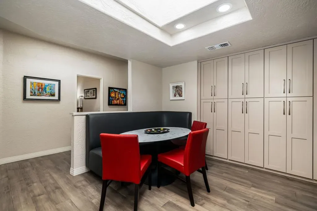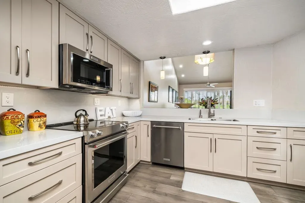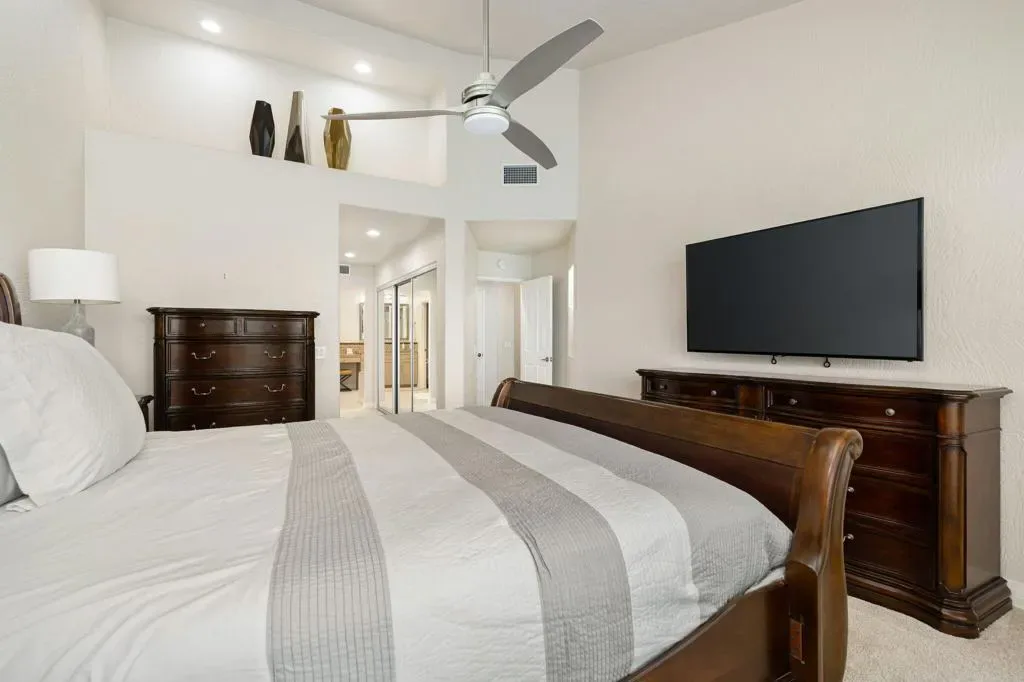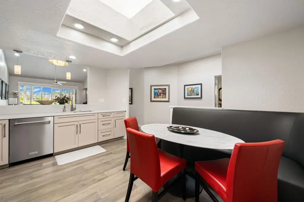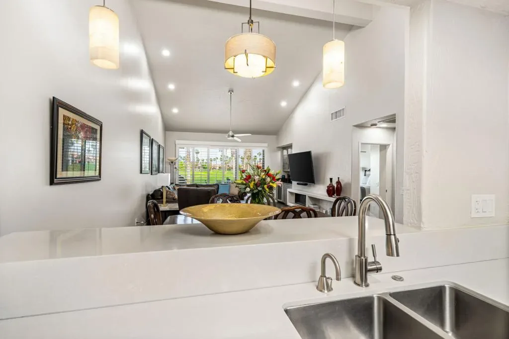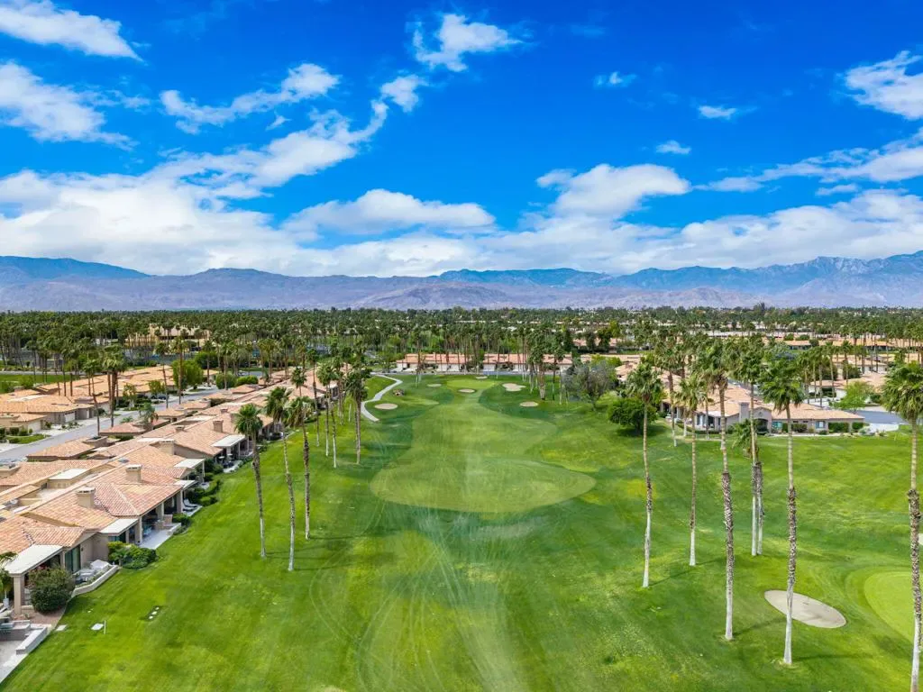 Updated Golf Course Condo with Panoramic Views! Welcome to this highly sought-after Tamarisk Plan, ideally situated within the guard-gated Palm Valley Country Club in the heart of Palm Desert. Offered fully furnished and move-in ready, this tastefully updated residence delivers effortless desert living with breathtaking westerly views of the mountains and the 18th hole of the Challenge Course. This spacious home features 3 ensuite bedrooms plus a powder room, providing ideal comfort and privacy. A private gated front courtyard creates a warm and inviting entry, while the 2-car garage adds functionality and ease. Designed for indoor-outdoor living, the expansive fairway patio with builtin BBQ captures stunning panoramic views and is accessible directly from the living room and the primary suite. Inside, the great room impresses with soaring ceilings, enhanced by new ceiling fans and modern lighting, creating a bright and open ambiance. The updated kitchen is thoughtfully designed with a modern designer table with a builtin bench seating, upgraded cabinetry, appliances, and lighting, along with bar counter seating and a separate dining area that flows seamlessly into the living space. The living room features a contemporary fireplace, custom display shelving, and a redesigned bar area with built-in wine storage, updated cabinetry, and a beverage refrigerator – ideal for entertaining. New plank flooring runs throughout the home, with plush carpet in the bedrooms and tile in the bathrooms for comfort and style. The primary suite is a true retreat, offering private patio access and an updated bathroom with granite counters, dual vanity area, and separate tub and shower. Both guest suites include ensuite updated bathrooms with modern showers and granite countertops, ensuring a luxurious experience for visitors. Perfectly positioned, the community pool and spa are conveniently located just across the street, with another nearby–enhancing the resort-style lifestyle this home provides. Located in one of the desert’s premier communities, Palm Valley Country Club offers two Ted Robinson-designed golf courses, fitness center & spa, tennis, pickleball, and 46 pools & spas. HOA includes social membership, guard-gated security, cable/internet, exterior maintenance, roof, landscaping & trash. Short-term rentals allowed (28 days or less) with City of Palm Desert permit.
