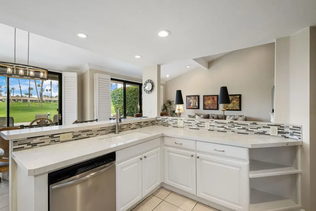 AVAILABLE FOR LONG-TERM LEASE (1 year minimum)! This Cottonwood model condo at Palm Valley CC has been expanded to include a 4th bedroom/Den with ensuite bathroom. South-facing with expansive mountain and golf course views! Patio features a built-in BBQ and awning. The open floor plan includes living room, dining room and kitchen – all open out to the patio with those great views. Light and bright with updates throughout – neutral tile, baseboards and crown molding. Fireplace and bar area in living room. Kitchen has bar counter seating, stainless appliances, quartz countertops and stylish tile backsplash. Primary suite and two guest rooms are en suite. Individual laundry room and attached 2-car garage. Offered furnished. One of the many community pools is just a few doors away. Pavered walkway and driveway. A variety of membership options available for tenant to purchase at Palm Valley CC.