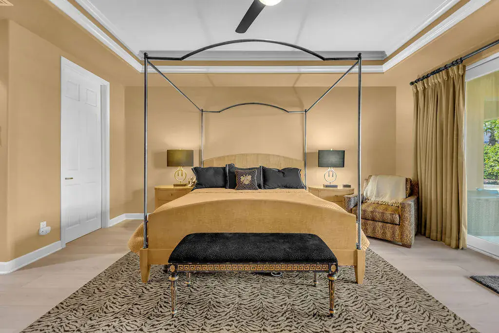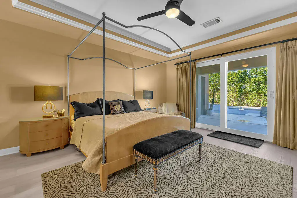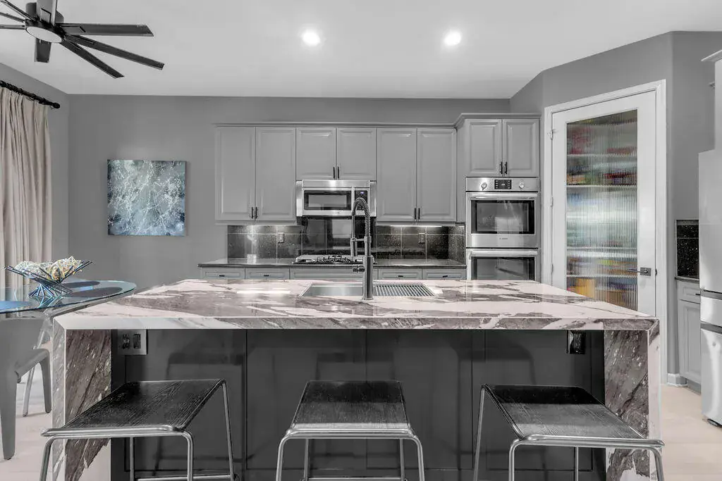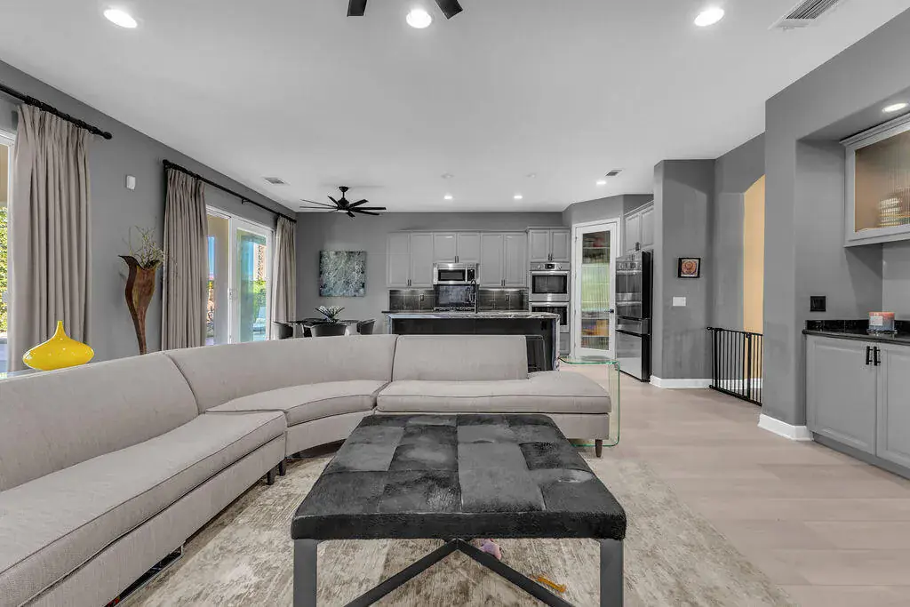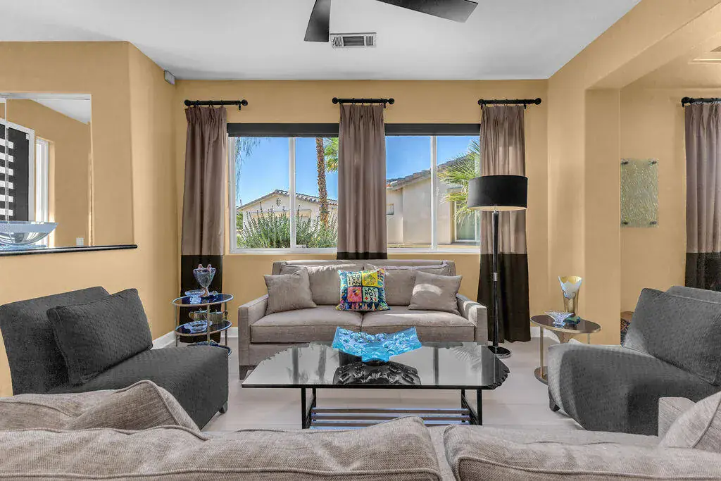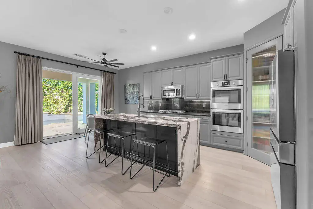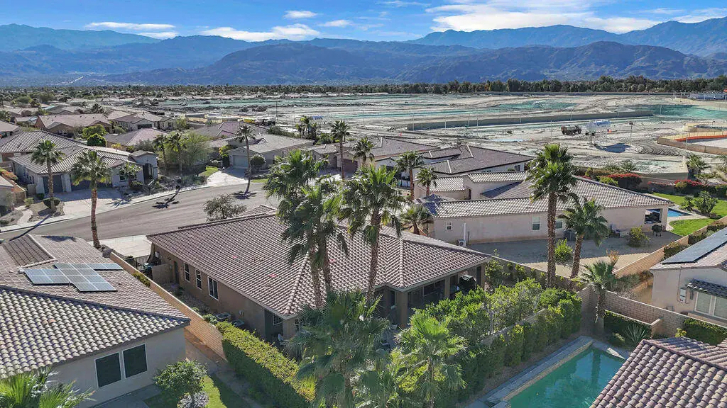 Experience refined desert living at 74080 Portola Pointe Lane, an elegant, thoughtfully upgraded residence nestled in one of Palm Desert’s most sought-after communities, where sweeping mountain views set the backdrop for everyday life.Inside, soaring ceilings and an open-concept floor plan create an immediate sense of space and light, enhanced by designer paint tones and sun-drenched interiors throughout. The gourmet kitchen serves as the true heart of the home, anchored by a dramatic waterfall-edge marble island and outfitted with premium stainless steel appliances, double ovens, rich wood cabinetry, and sleek modern black fixtures. The expansive primary suite offers a genuine retreat featuring luxury vinyl plank flooring, generous windows framing the natural landscape, and a spa-inspired ensuite designed to impress.Step outside and the desert lifestyle comes fully to life. A covered patio opens to lush, manicured landscaping and a stunning saltwater pool, all set against a breathtaking mountain backdrop, an entertainer’s dream from sunrise to sunset. And with solar fully paid for, you’ll enjoy the comfort of resort-style living without the utility costs to match.Beyond the property, you’re moments from world-class golf, the iconic El Paseo shopping corridor, and Palm Desert’s finest dining and entertainment. Modern sophistication, effortless efficiency, and the very best of desert resort living, all in one exceptional home.