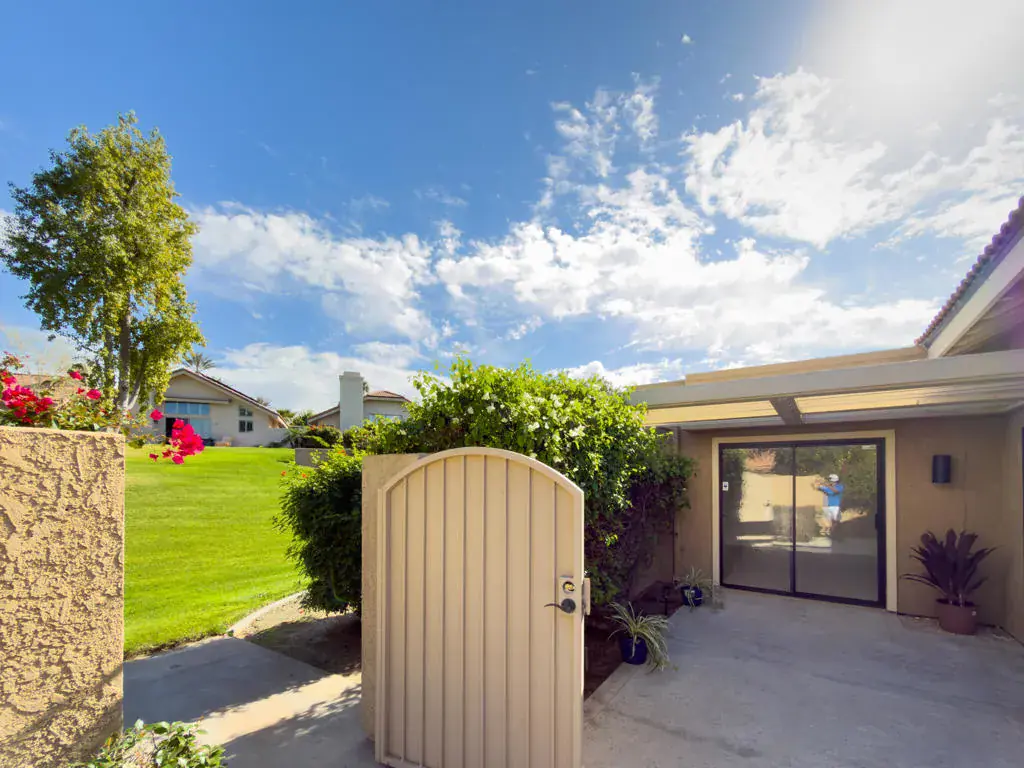 Welcome to a truly rare opportunity to own one of Silver Sands’ desirable Premier Lots, ideally tucked into a quiet cul-de-sac with a shared wall on only one side. Located within the prestigious guard-gated Silver Sands Racquet Club, this beautifully upgraded, single-level G-Plan residence offers the perfect blend of privacy, style, and resort living.Soaring ceilings and an open-concept layout fill the home with natural light, creating an airy and welcoming atmosphere throughout. The interiors have been thoughtfully reimagined with a contemporary touch, featuring fresh bright paint, new baseboards, trim, interior doors, and stylish lighting and ceiling fans.The newly remodeled chef’s kitchen opens seamlessly to the living and dining areas and showcases modern soft-close cabinetry, high-quality quartz countertops, a custom backsplash, and a breakfast bar-ideal for entertaining. Brand-new Samsung appliances include the latest oven with air-fryer technology and an auto-release dishwasher.The great room is surrounded by windows with solar-powered motorized shades and anchored by a cozy fireplace, perfect for cool desert evenings. This home offers two spacious primary suites, each with upgraded bathrooms featuring dual-sink quartz vanities, new ceiling fans with integrated lighting and remote controls, and easy access to the outside.Additional highlights include a climate-controlled garage with ample storage and a private courtyard with a pergola creating an ideal spot to enjoy serene desert mornings and relaxing evenings. The home also offers direct gated access to nearby pools and spas, just steps away.Silver Sands Racquet Club is one of the desert’s most coveted communities, featuring only 256 homes and an unbeatable location adjacent to the JW Marriott Desert Springs Resort and across from Desert Willow Golf Resort, where Palm Desert homeowners enjoy discounted golf rates.Residents enjoy a true resort lifestyle with a clubhouse for social activities, 7 lighted tennis courts, 4 pickleball courts, on-site pros during season, a fitness center, and 15 pools and spas-all included in the HOA. HOA dues also cover roof and exterior maintenance landscaping, cable TV, internet, trash service, and 24-hour security.Silver Sands Racquet Club has everything you need to make every day feel like a vacation.