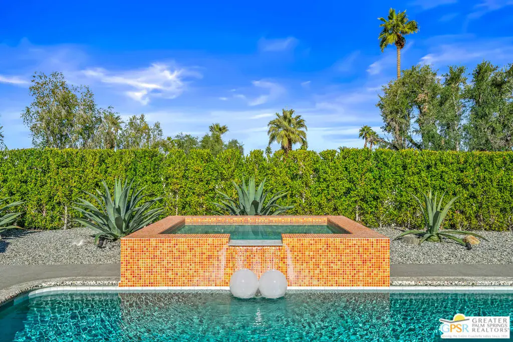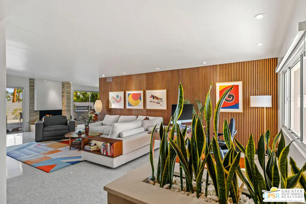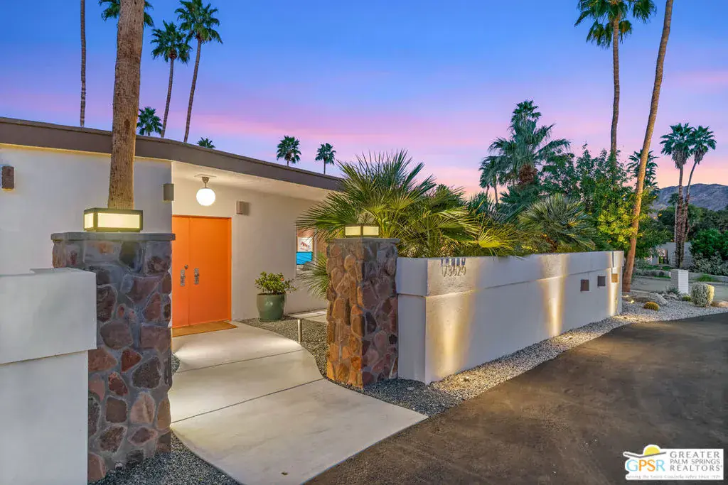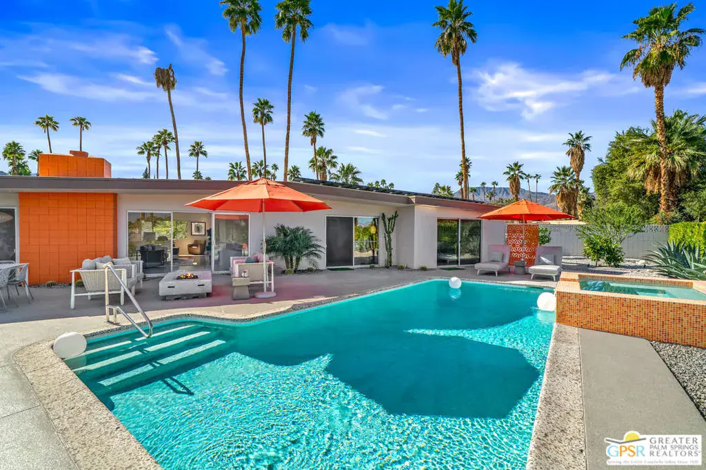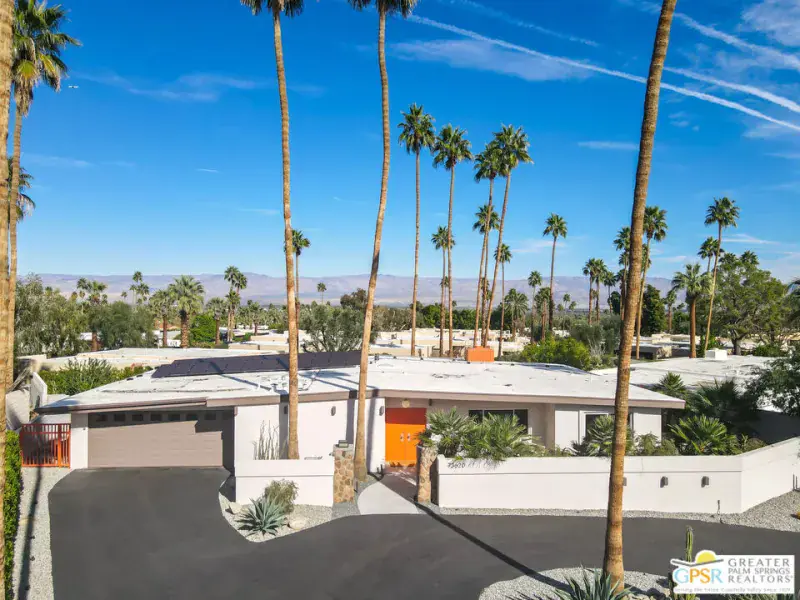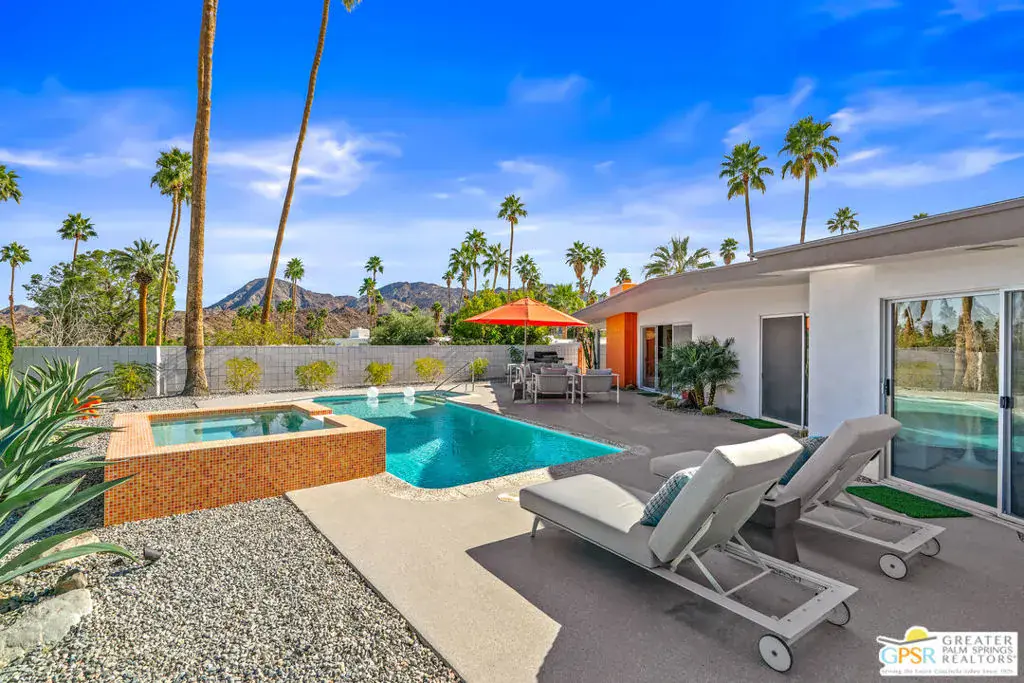 Meticulously remodeled by the current owner while remaining true to its architectural roots, this classic Midcentury residence was designed by famed architect Richard A. Harrison, whose work is closely associated with the clean lines, thoughtful proportions, and seamless indoor-outdoor flow that define Desert Modernism. In the main house, the primary en-suite features a custom bookcase wall, a large closet, mountain views, and direct access to the backyard. The primary bath has been beautifully reimagined with an oversized, fully tiled walk-in shower and a walnut vanity, all finished in keeping with the home’s original Midcentury design. Generously sized, the second bedroom offers mountain views, ample closet space, and its own HVAC system, with convenient access to the secondary bath. Preserving much of its original character, the guest bath is elevated with curated designer details that honor the integrity of the era, while a separate door allows the bedroom and bath to be closed off together, creating a fully private guest suite.An attached casita, updated and refreshed, serves as the third bedroom and bath and includes a kitchenette, making it an ideal space for guests, extended stays, or a private retreat. Completely remodeled, the kitchen is a standout design element, showcasing custom cabinetry, distinctive Midcentury tiled walls, and newer appliances that blend timeless style with modern function. Generous in scale, the great room features modern walnut paneling, a restored fireplace upgraded to gas, and expansive views overlooking the pool and outdoor living areas. Adjacent to the great room, the dining room is perfectly positioned for both everyday living and entertaining. Classic terrazzo tile flooring runs throughout the home, highlighting its authentic Midcentury character. Designed for modern living, the residence also functions as a smart home, offering owned solar, voice-activated lighting, and automated shades for added comfort and convenience. Outdoor living areas are complemented by beautifully landscaped grounds, creating a lush and exceptionally private setting that embraces mountain views. Highlights include a refreshed original pool with new tile and upgrades, an oversized custom spa, and a fire pit that provides an inviting focal point for cool desert evenings. Situated in the historic Silver Spur Ranch area of Palm Desert, this home enjoys a prime location just minutes from all the desert has to offer, an exceptional opportunity to experience iconic architecture, breathtaking mountain views, and modern conveniences in a truly unbeatable setting.