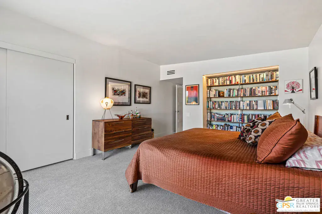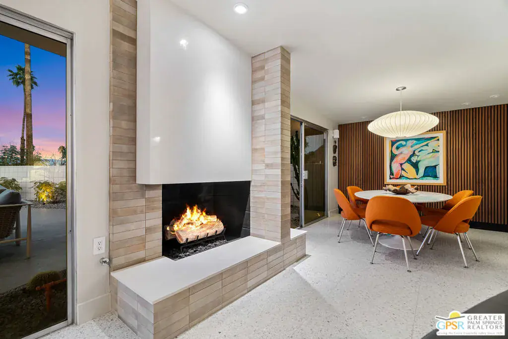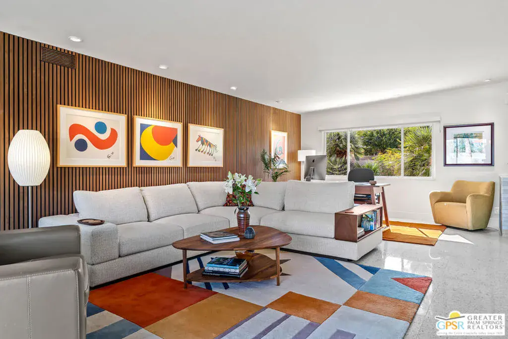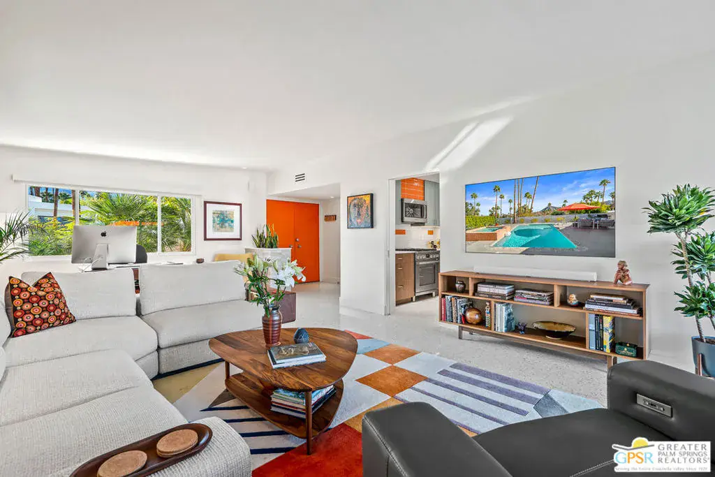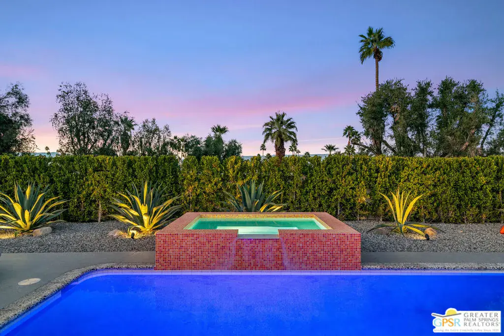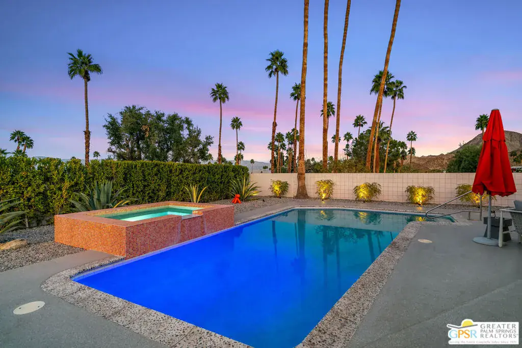 Meticulously remodeled by the current owner while remaining true to its architectural roots, this classic Midcentury residence was designed by famed architect Richard A. Harrison, whose work is closely associated with the clean lines, thoughtful proportions, and seamless indoor-outdoor flow that define Desert Modernism. In the main house, the primary en-suite features a custom bookcase wall, a large closet, mountain views, and direct access to the backyard. The primary bath has been beautifully reimagined with an oversized, fully tiled walk-in shower and a walnut vanity, all finished in keeping with the home’s original Midcentury design. Generously sized, the second bedroom offers mountain views, ample closet space, and its own HVAC system, with convenient access to the secondary bath. Preserving much of its original character, the guest bath is elevated with curated designer details that honor the integrity of the era, while a separate door allows the bedroom and bath to be closed off together, creating a fully private guest suite.An attached casita, updated and refreshed, serves as the third bedroom and bath and includes a kitchenette, making it an ideal space for guests, extended stays, or a private retreat. Completely remodeled, the kitchen is a standout design element, showcasing custom cabinetry, distinctive Midcentury tiled walls, and newer appliances that blend timeless style with modern function. Generous in scale, the great room features modern walnut paneling, a restored fireplace upgraded to gas, and expansive views overlooking the pool and outdoor living areas. Adjacent to the great room, the dining room is perfectly positioned for both everyday living and entertaining. Classic terrazzo tile flooring runs throughout the home, highlighting its authentic Midcentury character. Designed for modern living, the residence also functions as a smart home, offering owned solar, voice-activated lighting, and automated shades for added comfort and convenience. Outdoor living areas are complemented by beautifully landscaped grounds, creating a lush and exceptionally private setting that embraces mountain views. Highlights include a refreshed original pool with new tile and upgrades, an oversized custom spa, and a fire pit that provides an inviting focal point for cool desert evenings. Situated in the historic Silver Spur Ranch area of Palm Desert, this home enjoys a prime location just minutes from all the desert has to offer, an exceptional opportunity to experience iconic architecture, breathtaking mountain views, and modern conveniences in a truly unbeatable setting.