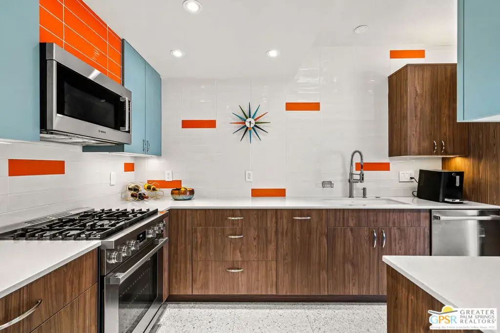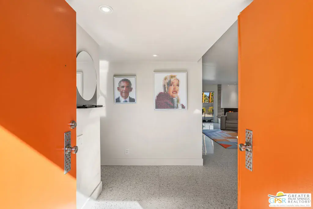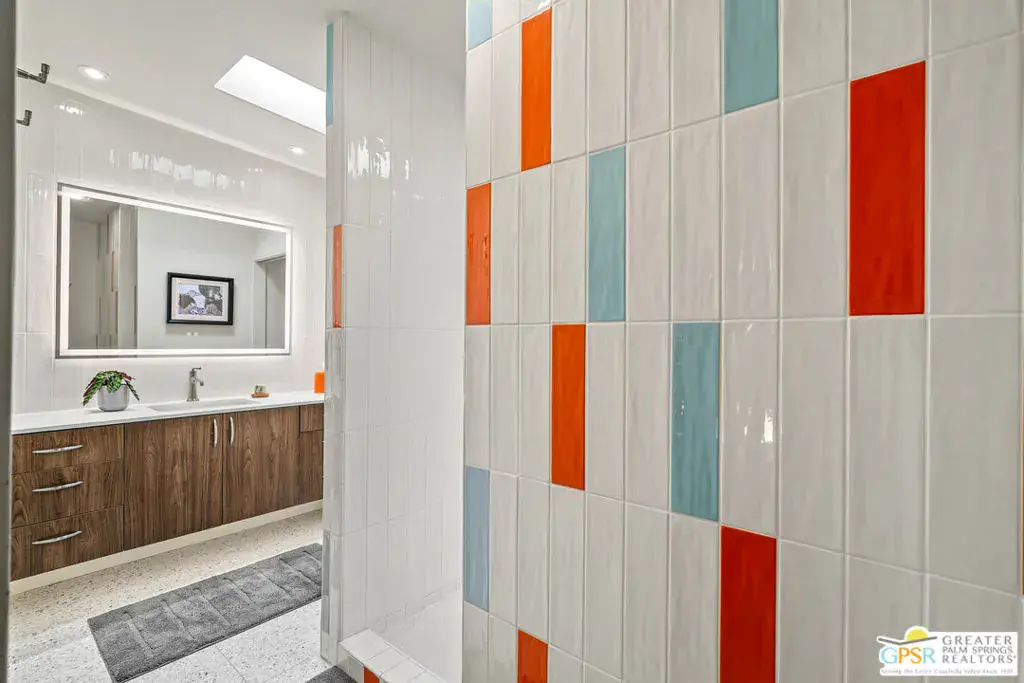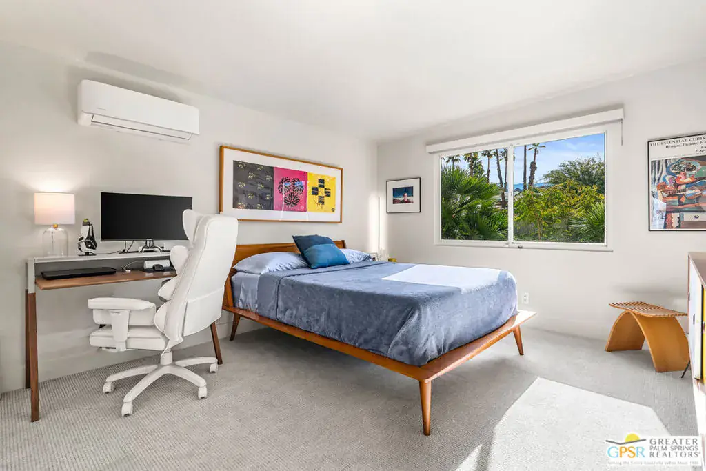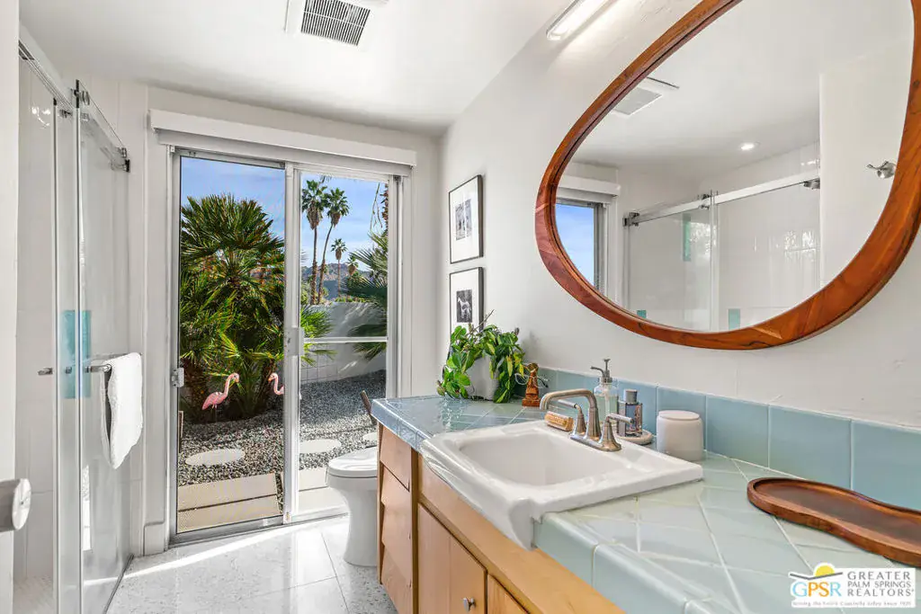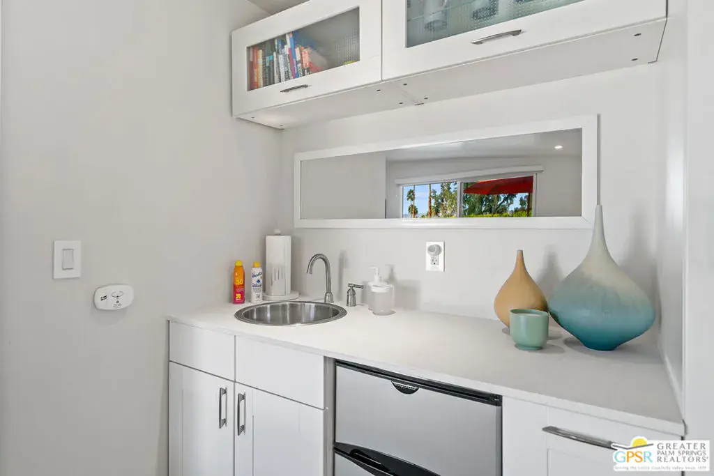 Meticulously remodeled by the current owner while remaining true to its architectural roots, this classic Midcentury residence was designed by famed architect Richard A. Harrison, whose work is closely associated with the clean lines, thoughtful proportions, and seamless indoor-outdoor flow that define Desert Modernism. In the main house, the primary en-suite features a custom bookcase wall, a large closet, mountain views, and direct access to the backyard. The primary bath has been beautifully reimagined with an oversized, fully tiled walk-in shower and a walnut vanity, all finished in keeping with the home’s original Midcentury design. Generously sized, the second bedroom offers mountain views, ample closet space, and its own HVAC system, with convenient access to the secondary bath. Preserving much of its original character, the guest bath is elevated with curated designer details that honor the integrity of the era, while a separate door allows the bedroom and bath to be closed off together, creating a fully private guest suite.An attached casita, updated and refreshed, serves as the third bedroom and bath and includes a kitchenette, making it an ideal space for guests, extended stays, or a private retreat. Completely remodeled, the kitchen is a standout design element, showcasing custom cabinetry, distinctive Midcentury tiled walls, and newer appliances that blend timeless style with modern function. Generous in scale, the great room features modern walnut paneling, a restored fireplace upgraded to gas, and expansive views overlooking the pool and outdoor living areas. Adjacent to the great room, the dining room is perfectly positioned for both everyday living and entertaining. Classic terrazzo tile flooring runs throughout the home, highlighting its authentic Midcentury character. Designed for modern living, the residence also functions as a smart home, offering owned solar, voice-activated lighting, and automated shades for added comfort and convenience. Outdoor living areas are complemented by beautifully landscaped grounds, creating a lush and exceptionally private setting that embraces mountain views. Highlights include a refreshed original pool with new tile and upgrades, an oversized custom spa, and a fire pit that provides an inviting focal point for cool desert evenings. Situated in the historic Silver Spur Ranch area of Palm Desert, this home enjoys a prime location just minutes from all the desert has to offer, an exceptional opportunity to experience iconic architecture, breathtaking mountain views, and modern conveniences in a truly unbeatable setting.