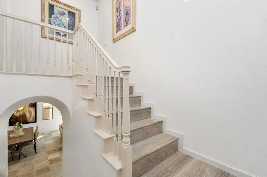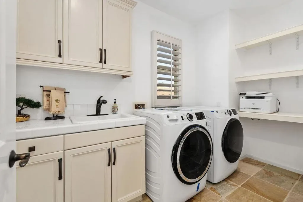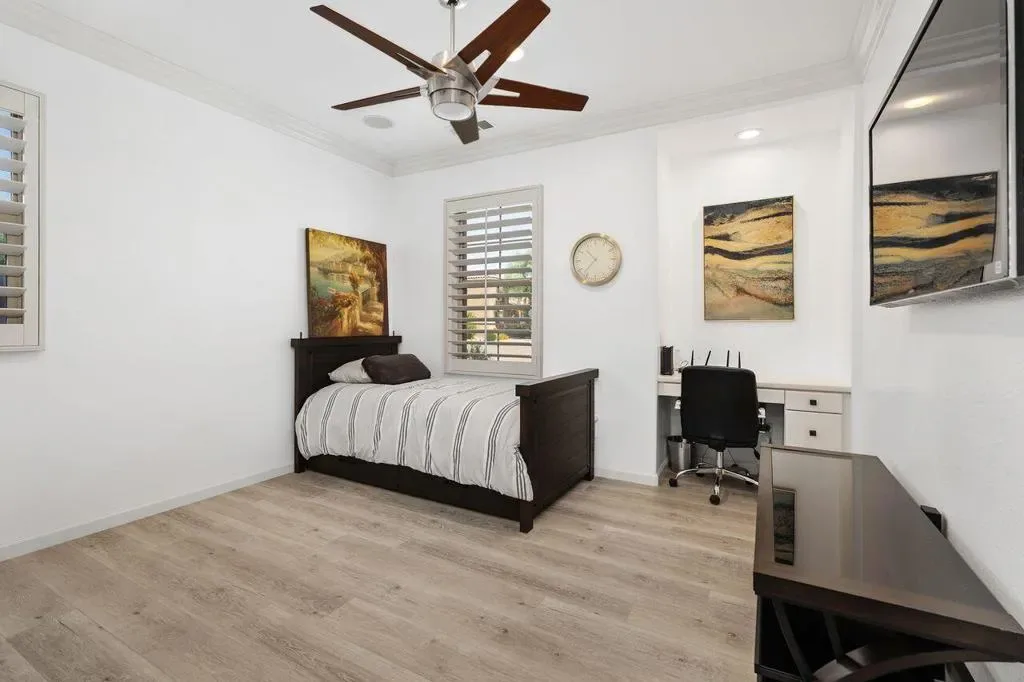 Rare corner lot home with front greenbelt views and captivating upgrades is now available in Spanish Walk. The striking interior design is the result of a magnificent remodel that is breathtaking in its beauty. With 1,946 square feet of thoughtfully designed living space, the home is comprised of two ensuite bedrooms upstairs, along with a rare third bedroom and full bath on the main level. Interior highlights include elegant custom cabinetry, gorgeous granite slab kitchen countertops, stone and SPC flooring, substantial baseboards and poplar crown molding throughout the entire home. Rounding out the upscale design aesthetic are automated blinds and plantation shutters with custom valances and a whole home audio system. The private outdoor space is a serene retreat centered around a unique, in-ground Pebble Tec spa with a stacked stone waterfall feature. Ample storage is available in the largest laundry and storage area of any Spanish Walk floor plan coupled with a two-car garage with a dedicated storage alcove. Spanish Walk residents enjoy three pools and spas, a fitness center, billiards room, greenbelt and playgrounds. Low HOA dues as well as electric provided by IID top off this must-see property. The location sits in a rapidly expanding pocket of North Palm Desert near Eisenhower Health, Desert Willow, Acrisure Arena and the CSUSB Palm Desert campus expansion. This opportunity is a distinctive blend of luxury, comfort and functionality in an exceptional location.