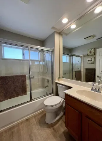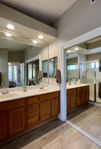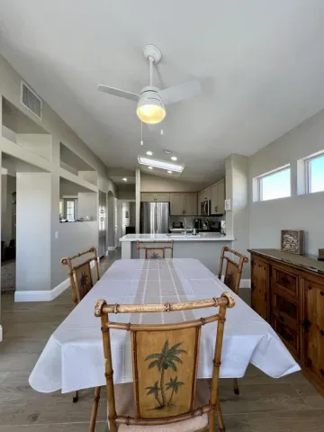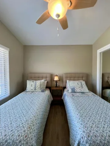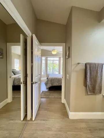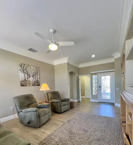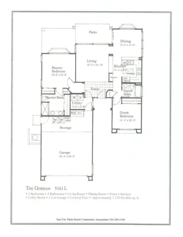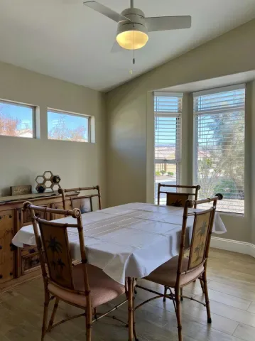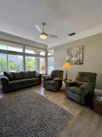 Short-term only; 4 months minimum. INCLUDES GOLF CART AND MONTHLY CLEANING! Available for 2026-2027 season. Sun City Palm Desert. Turnkey-furnished Gorham model on a corner lot. This one’s SPOTLESS and includes monthly cleaning. Enter through a beautiful leaded-glass front door. 2 bedrooms/2 bathrooms. 1157sf. Newer wood-look tile and new baseboards throughout. NO CARPET. Freshly painted inside & out. Newer stainless appliances including newer washer and dryer. Crown molding in living room. Newer 58” TV in living room; 39” TV in master. Newer toilets. Newer ceiling fans in every room. Newer dishes, flatware, pots ‘n pans. Newer gas BBQ. Newer king-size bed in master; twin beds in guest room. Inside laundry room with newer washer and dryer. Extended patio. Attached garage with direct access into house. Includes monthly cleaning, cable TV, internet, golf cart, & US/Canada calling. Electricity and Gas capped at $225 total per month.