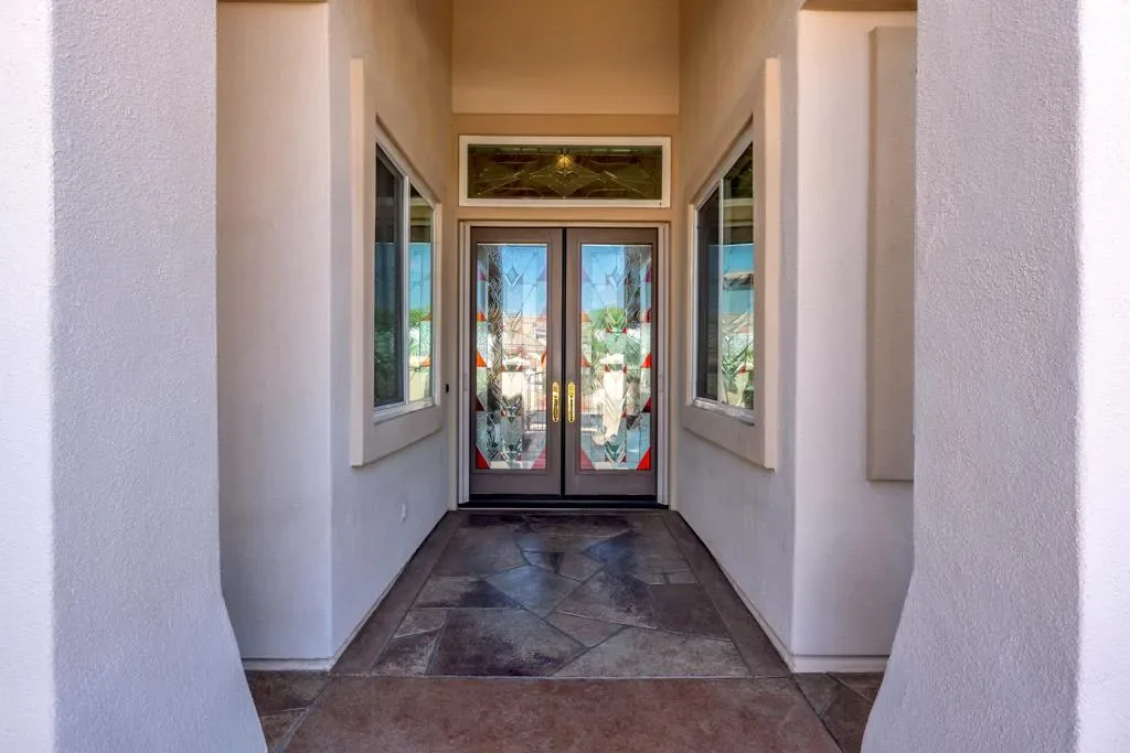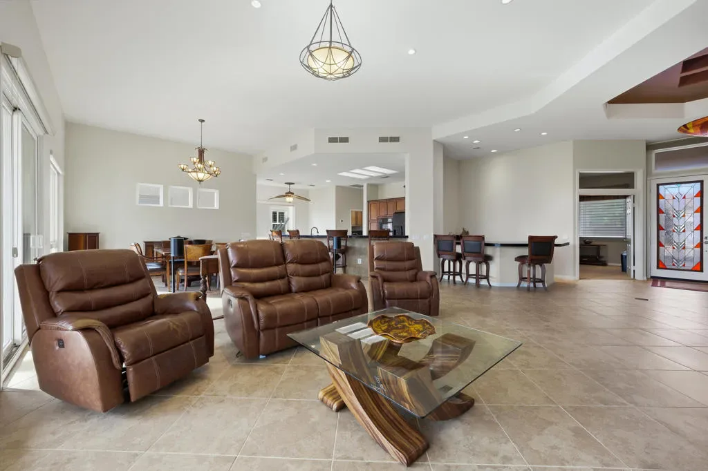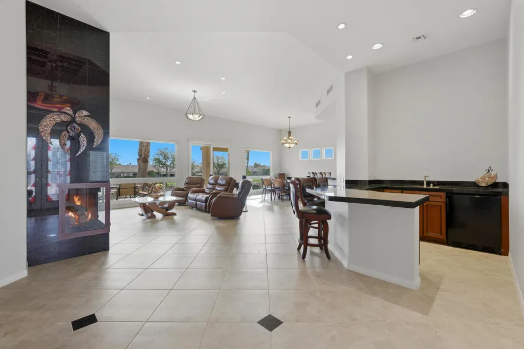 Sun City Palm Desert – St. Tropez. This sought-after St. Tropez model is one of Sun City’s most dramatic great room floorplans–elevated on the 14th fairway of the Santa Rosa course with panoramic golf course and mountain views. The east-facing backyard is designed for entertaining, featuring an expanded decorative concrete patio, multiple seating areas, desert landscaping, and three gas firepits. Curb appeal shines with a decorative concrete driveway, gated courtyard, and leaded-glass double doors. Recent upgrades make this home move-in ready for the desert climate: new dual AC units (2024), owned solar eliminating electricity bills, and upgraded windows throughout. Inside, soaring 12-foot ceilings in the great room and foyer, upgraded lighting, and Hunter Douglas window treatments create a dramatic yet comfortable atmosphere. Diagonally laid 19-inch tile flows through the main living areas. The great room showcases a granite-surround fireplace, a granite-topped wet bar with refrigerator, and a wall of windows framing the view. Double doors open to a flexible den/office. The kitchen is a chef’s delight with granite counters, a large breakfast bar, center island, wall oven, and pull-out cabinetry. The primary suite offers double-door entry, patio access, a custom walk-in closet, and a spa-style bath with dual sinks, sitting vanity, oversized soaking tub, and glass-block shower. A spacious guest suite includes its own full bath. Additional features: large laundry with storage and sink, 2-car + golf cart garage with epoxy floors and separate AC, and the option to purchase furnished outside of escrow.