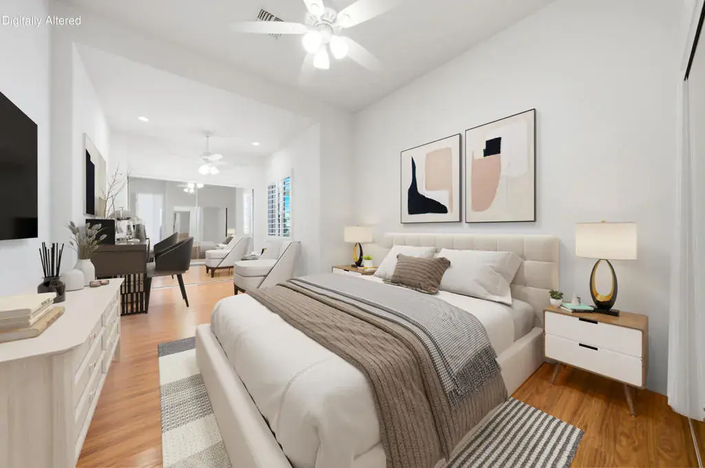 Sun City Palm Desert – Monaco (Extended). Located on a quiet cul-de-sac. this extended Monaco offers exceptional flexibility with three extended suites, including a rare double guest suite — ideal for hosting guests or accommodating an in-home caregiver. The oversized east-facing rear yard is a true highlight, featuring a pool and spa surrounded by an expansive flagstone patio, lush landscaping, and a built-in BBQ island — perfect for entertaining or relaxing in privacy. The gated front courtyard and leaded glass entry doors create inviting curb appeal. Inside, 12-foot ceilings elevate the greatroom, while mosaic tile and Pergo flooring, along with plantation shutters throughout, provide a cohesive and upgraded finish. The kitchen is designed for both function and gathering, featuring composite counters, a large island with breakfast bar, double wall ovens, a spacious pantry, and a skylight that fills the space with natural light. The extended primary suite offers direct access to the rear patio, a walk-in closet with built-in storage plus a bonus closet. The ensuite bath includes dual sinks with a sitting vanity, a walk-in shower, and a separate stall shower with textured glass doors. The double guest bedroom suite includes a wet bar, two closets, and a private bath with shower/tub combination. The additional extended guest suite also has its own shower/tub bathroom. A separate utility space or office adds even more versatility. The 2+ golf cart garage includes built-in cabinetry and overhead hanging rack storage. One AC unit was replaced in 2025, the other in 2013. A rare extended Monaco offering space, privacy, and resort-style outdoor living.