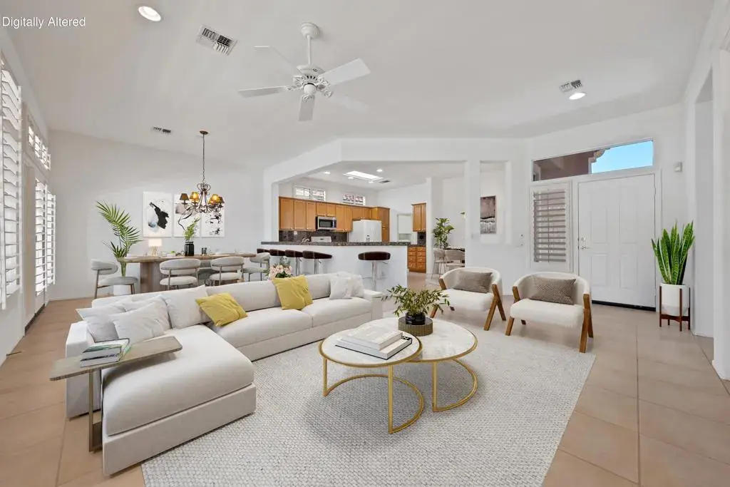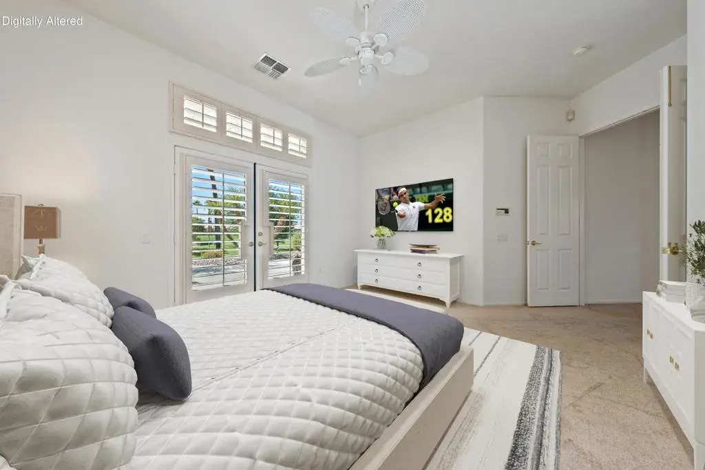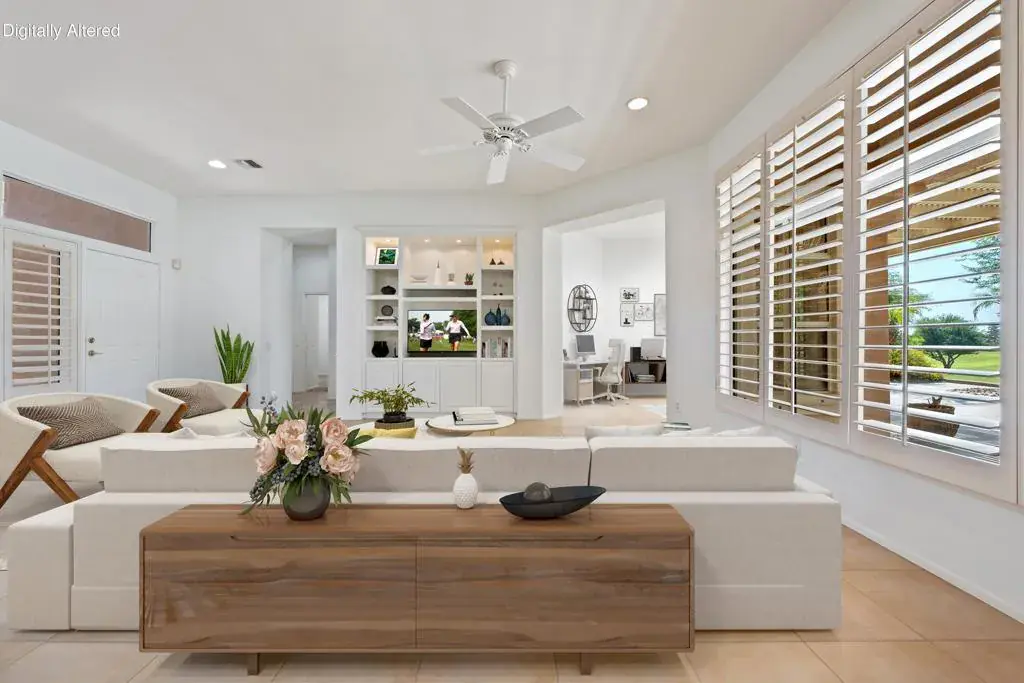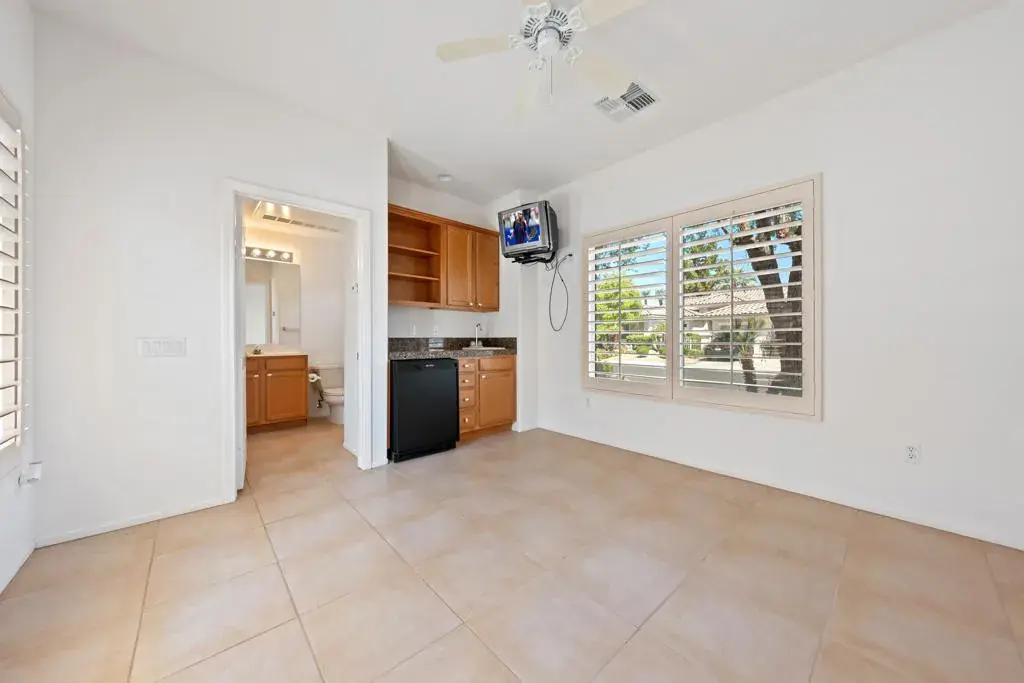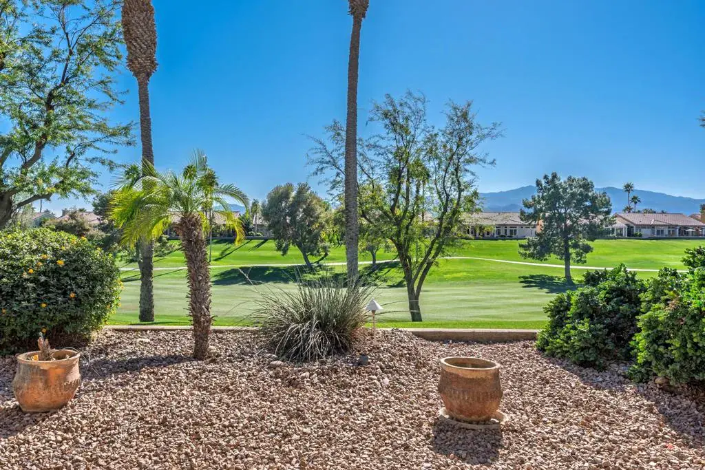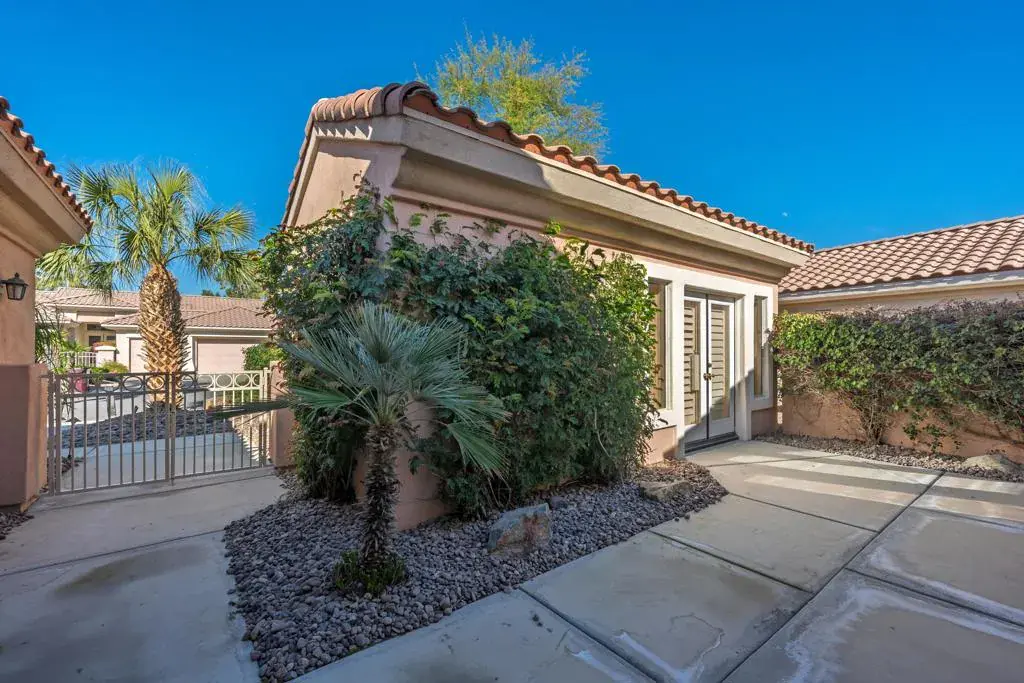 Sun City Palm Desert – Morocco with Casita.Perched above the 15th fairway and just a short distance from the Sunset View Clubhouse, this highly sought-after Morocco floor plan with detached casita captures sweeping golf course and mountain views. The main residence offers two bedrooms, two bathrooms, and a versatile den, while the private casita provides an additional bedroom and bath–ideal for guests or a quiet retreat. The elevated, south-facing backyard features an expansive patio with alumawood cover, low-maintenance desert landscaping, and panoramic vistas across the fairway and mountains beyond. A gated front courtyard enhances curb appeal and creates a welcoming, private entry. Inside, 10-foot ceilings and transom windows fill the home with natural light, complemented by plantation shutters throughout. The kitchen is thoughtfully designed with granite countertops, a chef’s island with breakfast bar, bisque appliances, and cabinetry with pull-out shelving. The spacious great room features a custom built-in media center and flows seamlessly to the adjacent den, perfect for an office or hobby space. The primary suite includes a double-door entry, French doors to the patio, a large walk-in closet with built-ins, dual-sink vanity, glass-enclosed shower, and an oversized soaking tub. The guest bedroom offers mirrored wardrobe doors with built-in storage, while the guest bathroom includes a tub/shower combination. The detached casita, accessed through French doors from the courtyard, is complete with a wet bar, refrigerator, and private bathroom with stall shower. Additional features include a laundry room with utility sink and storage, and a 2-car garage with dedicated golf cart space.