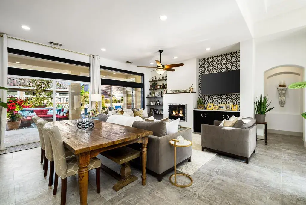 SELECT FURNISHINGS AVAILABLEEnter through leaded glass double doors into an open concept living/dining area with added electric fireplace. The ‘Chef’s’ kitchen features a 10′ stone island, coordinating stone perimeter, and a coffee/tea bar. A 48′ Italian dual fuel stove with custom vent hood encased in wood, creates a cook’s workshop. French design cabinetry includes large pantry with slide-out shelves.The master bath has an extended walk-in / wheel chair shower, soaking tub, and double vanity. The office/den/ guest room offers privacy with pocket doors.A glass slider opens to a lush yard for stargazing. Close to amenities like golf, sport courts, and clubs.