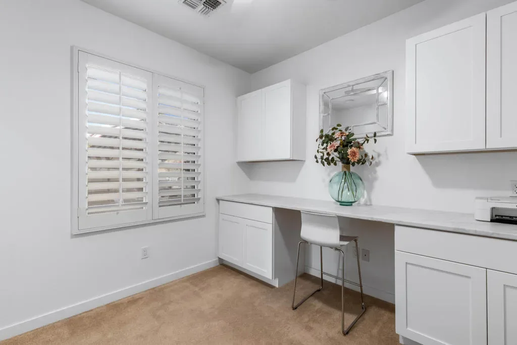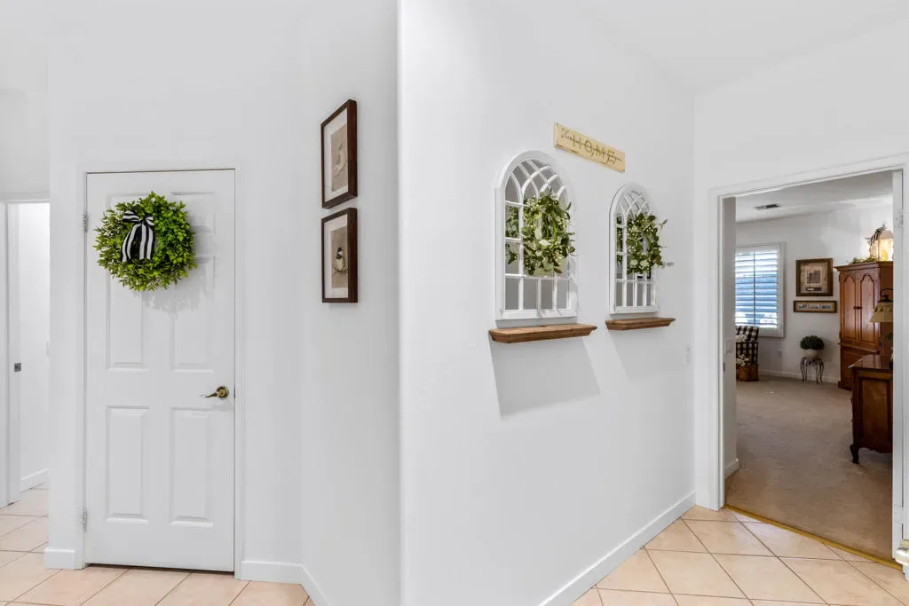 As you enter a charming private courtyard, welcome to this beautiful south-facing golf course and mountain view ST. CROIX home with 2 bedrooms, den, office/hobby room, and golf cart garage. Every room in this home is immaculate and has an exquisite ‘bed and breakfast” ambience. Recessed lighting, indoor/ outdoor speaker system, and freshly painted interior with new baseboard moldings, this home is located in a ‘central” area of Sun City near the Sunset View clubhouse (Boulevard’s Bar & Grill Restaurant) . The private courtyard with sitting area, sparkling fountain, and upgraded concrete overlay flooring is charming. Enter the great room with a large French country fireplace mantle with built-in shelving. The country kitchen has upgraded cabinets, double oven, new tile backsplash, chef’s island, generous breakfast nook and breakfast bar. A good size dining area lies off the kitchen. Both living room and dining room have beautiful views through the wall of windows. Primary bedroom has a sitting area and door with direct access to back patio. Slab granite counters in bathrooms, double vanity and shower. Guest bedroom has large closet next to the full bath. Office/hobby room has direct access to the two car garage ( plus golf cart garage.) Epoxy flooring, storage cabinets, and a mini split. Finally, this backyard area offers the best of both worlds with a golf course/mountain view and private dining and sitting area on an extended patio with a built-in gas fire pit. Finally, the St Croix is the most popular model and this particular home has it all!