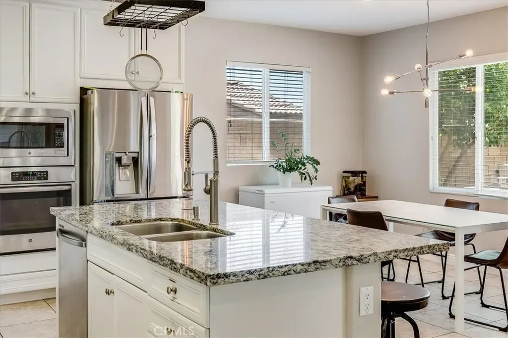 At the heart of the home, the gourmet kitchen is beautifully appointed with granite countertops, stainless steel appliances, double ovens, a large center island with seating, abundant cabinetry, and a walk-in pantry. The adjacent dining and living spaces make hosting effortless.