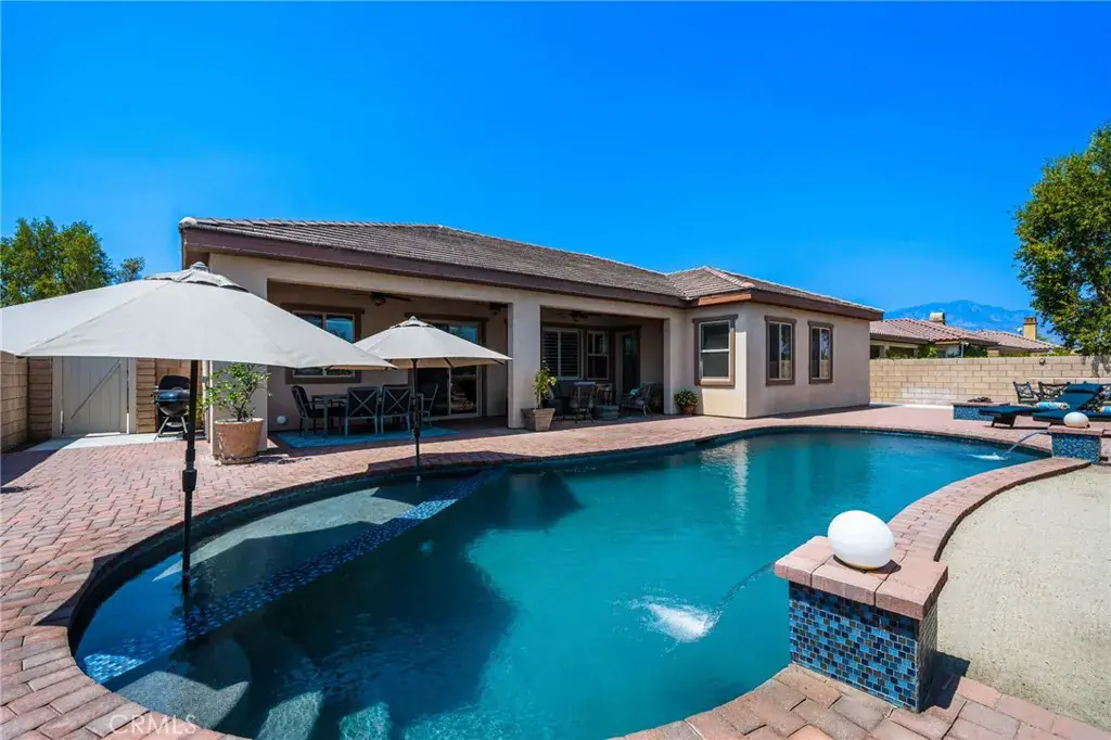 Located in the desirable community of The Gallery in Palm Desert, this Ponderosa built, 4 bedroom, 2.5 bath home offers 2,596 sq. ft. of stylish living space. A gated courtyard entry leads to an elegant rotunda, high windows, and 12 ft. tray ceilings that fill the home with light. The formal dining room is perfect for entertaining, while the kitchen boasts black granite counters, double ovens, and a Sub-Zero built-in refrigerator. The fourth bedroom is currently used as an office with a walk-in closet for added storage. The home is powered by 40 solar panels and a Tesla back up battery that are paid off. Enjoy resort-style outdoor living with a covered patio featuring recessed lighting and a mist system, plus a Pebble Tec pool with tanning shelf. The private backyard offers low-maintenance landscaping and stunning mountain views. Two attached garages accommodate three cars. This home blends elegance, comfort, and function in one of Palm Desert’s most sought-after neighborhoods.