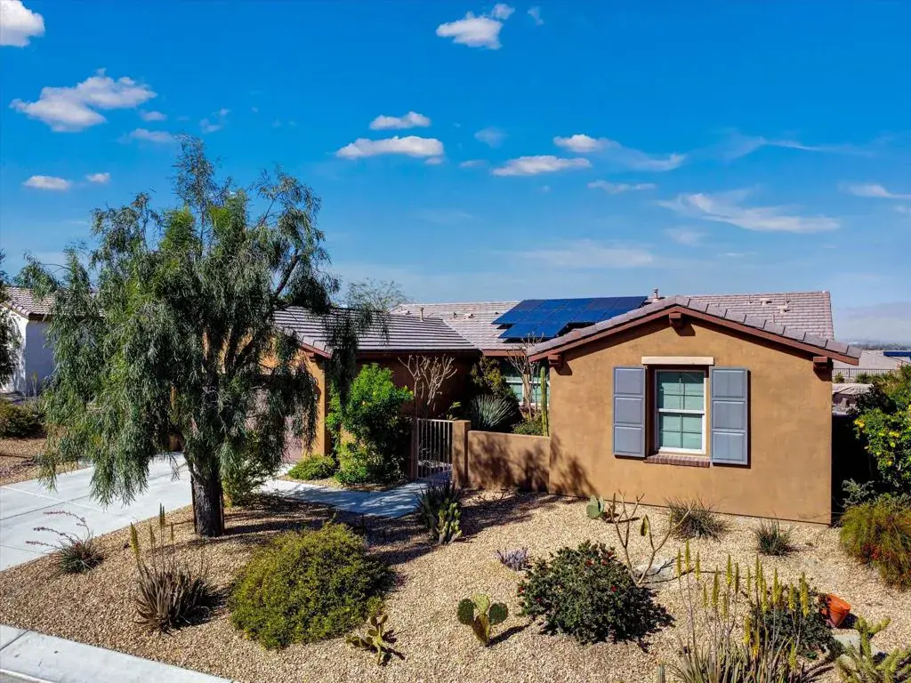 The ideally elevated location of this stunning home in the desirable gated community of the Gallery has breathtaking panoramic sweeping views of the mountains. The VISUAL APPEAL is definitely evident. Now let’s check off your next home’s FUNCTIONALITY…>Impeccably maintained and smartly configured floorplan of 2361 sqft, 3 spacious bedrooms with woodlike floors, each with their own bathroom. > The Great Room with ceramic tile floors and fireplace opens to the Kitchen and Dining Room becoming the true heart of the home enhancing entertainment. The windows allow natural light and view of the backyard.. AMENITIES INCLUDE..> 24 fully owned Solar Panels, greatly reducing energy costs. > Solar Pool Heating Panels also save pool heating costs. > Under kitchen sink water filter plus whole house water filtration system. >Modern technology includes a smart Ring entry system with app integration and an electric vehicle charging station. BACKYARD FEATURES…> 50 ft. pool with dual waterfall feature, and shallow lounging area. > Cascading Grotto waterfall set in desert landscaping,> Solid Patio Cover. with cooling water mist system.> Above Ground Spa. > BBQ Entertainment Center. Most items shown are to be included. A MUST SEE home to fully appreciate.